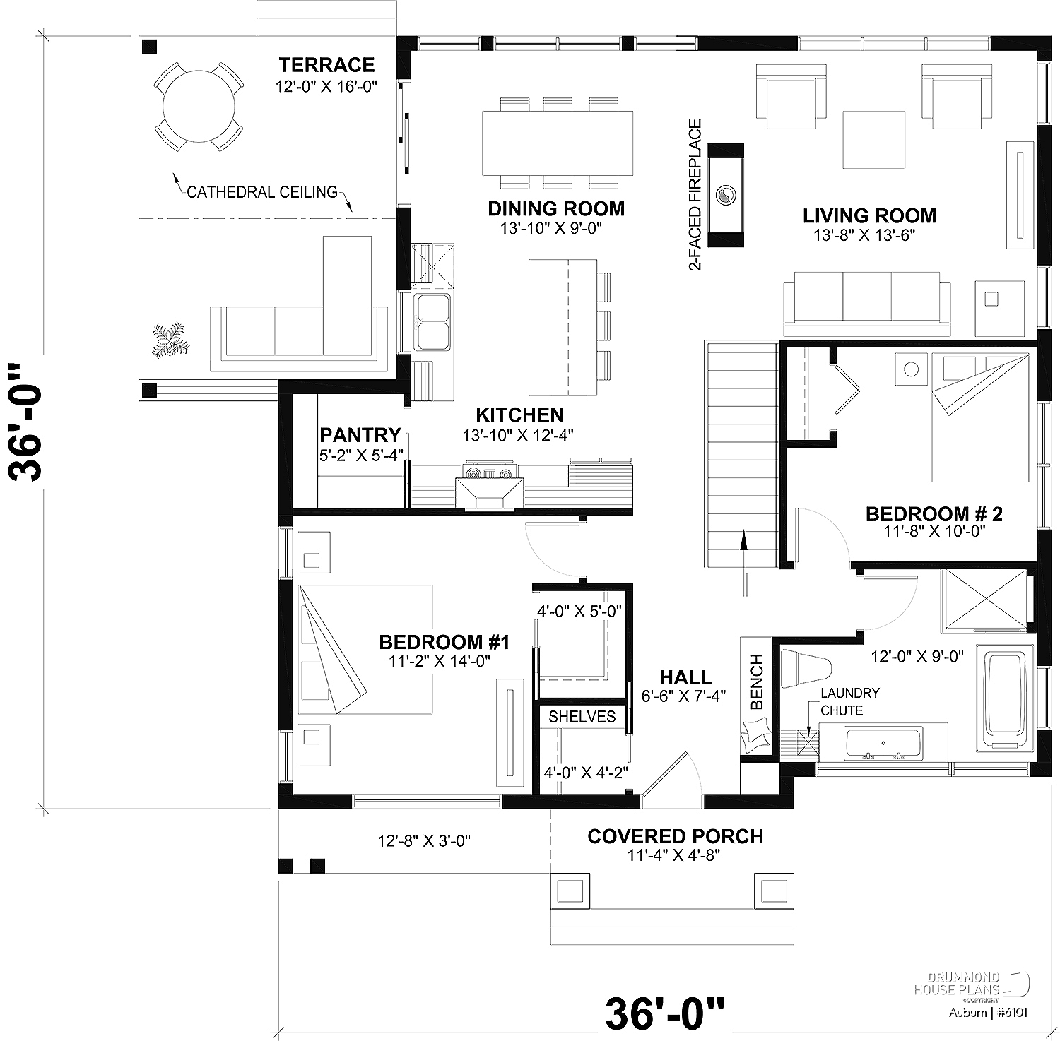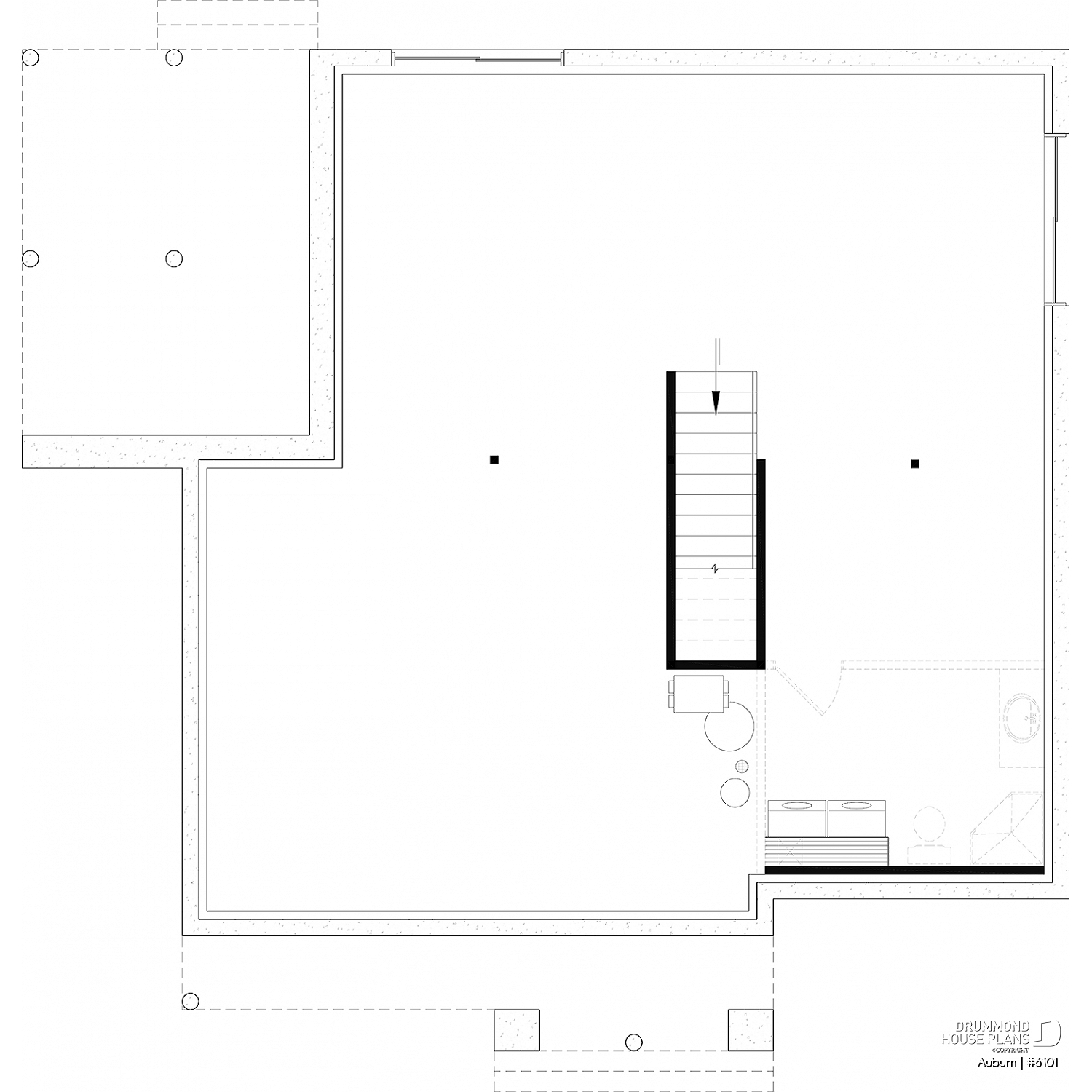 Main floor: Mudroom, 2 bedrooms, kitchen, dining and living room, full bathroom. *Unfinished basement. Sheltered terrace. --- *Finished basement: One bedroom, shower room, laundry room, home theater and famiy room. --- *If you wish to purchase the finished basement plan, as presented on this plan page, please select this option in the shopping cart, in the "Selection of foundation type" section. If you do not select this option, you will receive the unfinished full basement option, at no extra charge.