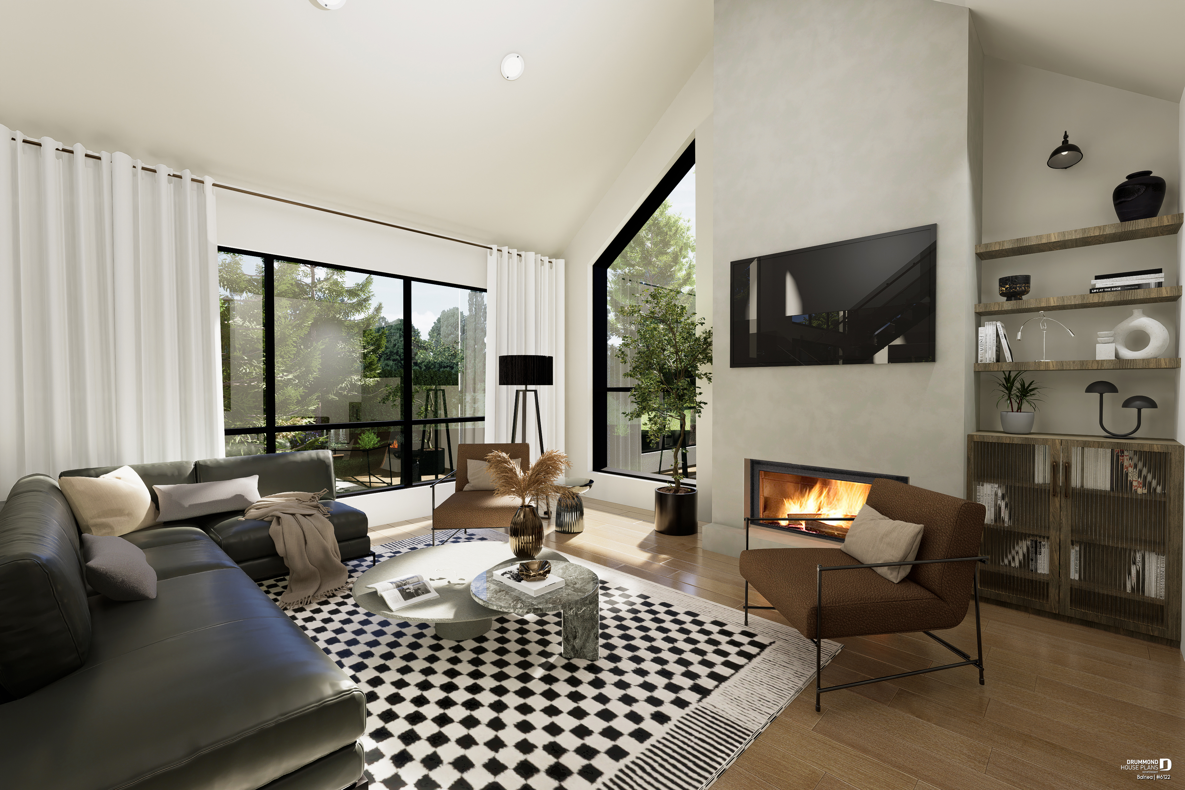 The spacious living room is enhanced by a 16' cathedral ceiling and an open atmosphere that flows into the dining room, which also features an impressive 18' cathedral ceiling. At the center of the living room, at the front of the house, stands a stunning fireplace, visible from both the dining room and the living room. The proposed STÛV s21 wood-burning fireplace becomes the true focal point of the home: its sleek design and high performance add warmth, Scandinavian ambiance, and timeless style, transforming every moment into a cozy, refined experience.