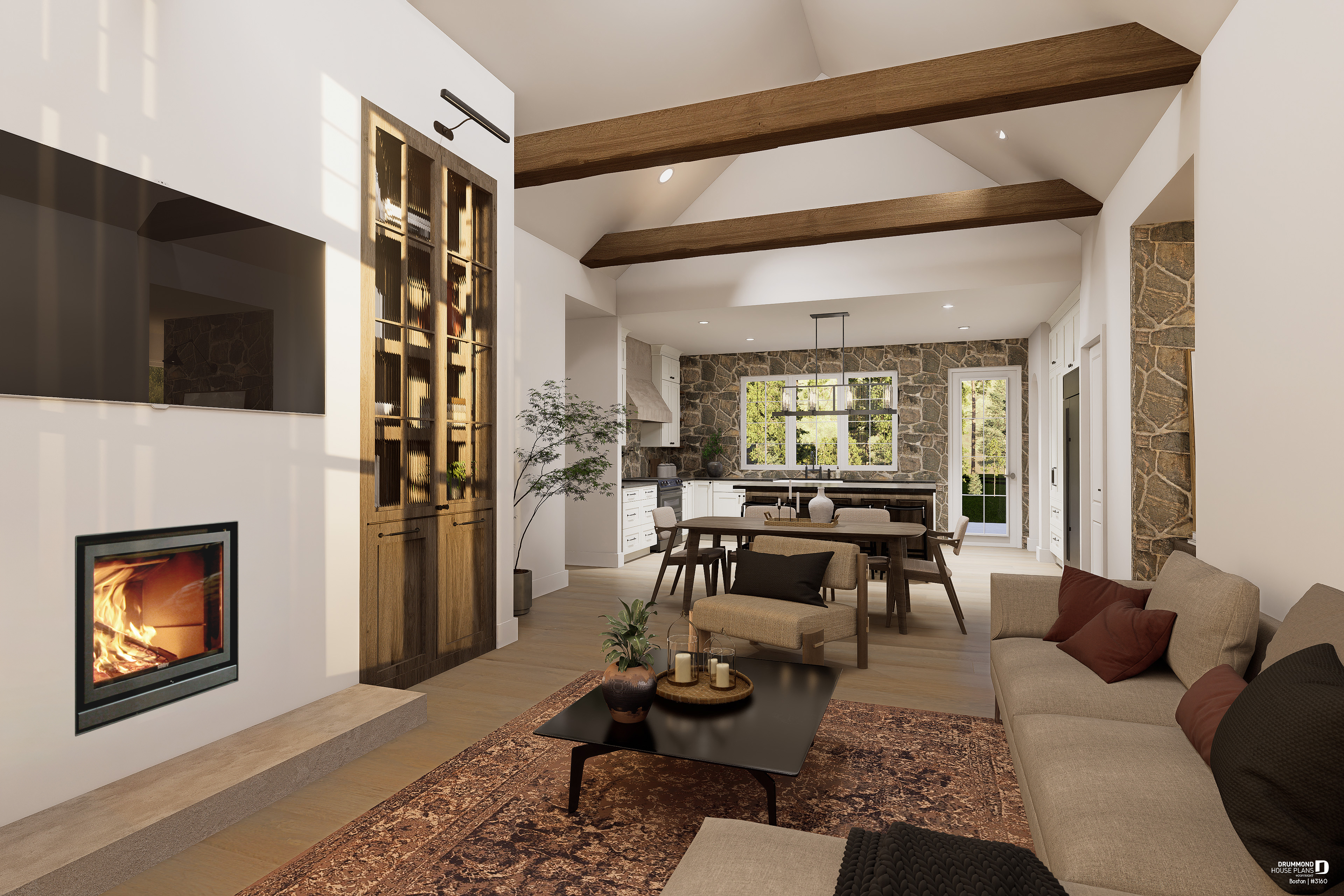 The main living area combines the living room, dining room, and kitchen in a spacious open-concept layout flooded with natural light thanks to a 16'8" cathedral ceiling. This design creates an airy, inviting atmosphere where family and friends naturally gather. At the heart of the living room, the proposed STÛV s16-Z wood-burning fireplace becomes the showpiece—bringing warmth, style, and comfort, and transforming every moment spent here into a welcoming, refined experience.