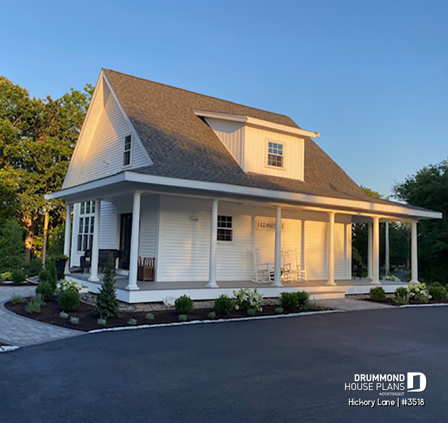 Beautiful farmhouse cottage house plan with wraparound porch, 3 beds, open floor plan, fireplace, mezzanine