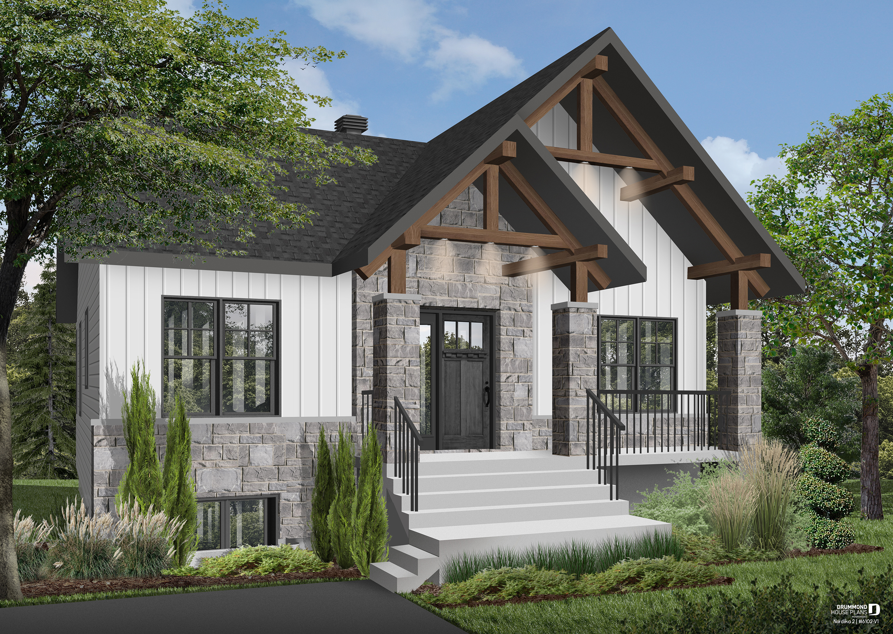 The NORDIKA 2 house plan (6102-V1), remains surprising and trendy both outside and inside. This 1,020 square foot home offers a prestigious exterior appearance, with a facade made of 50% stone and imposing wooden gables. The rustic style continues inside, where a reminder of the gables is done with beautiful wooden beams on the ceiling.