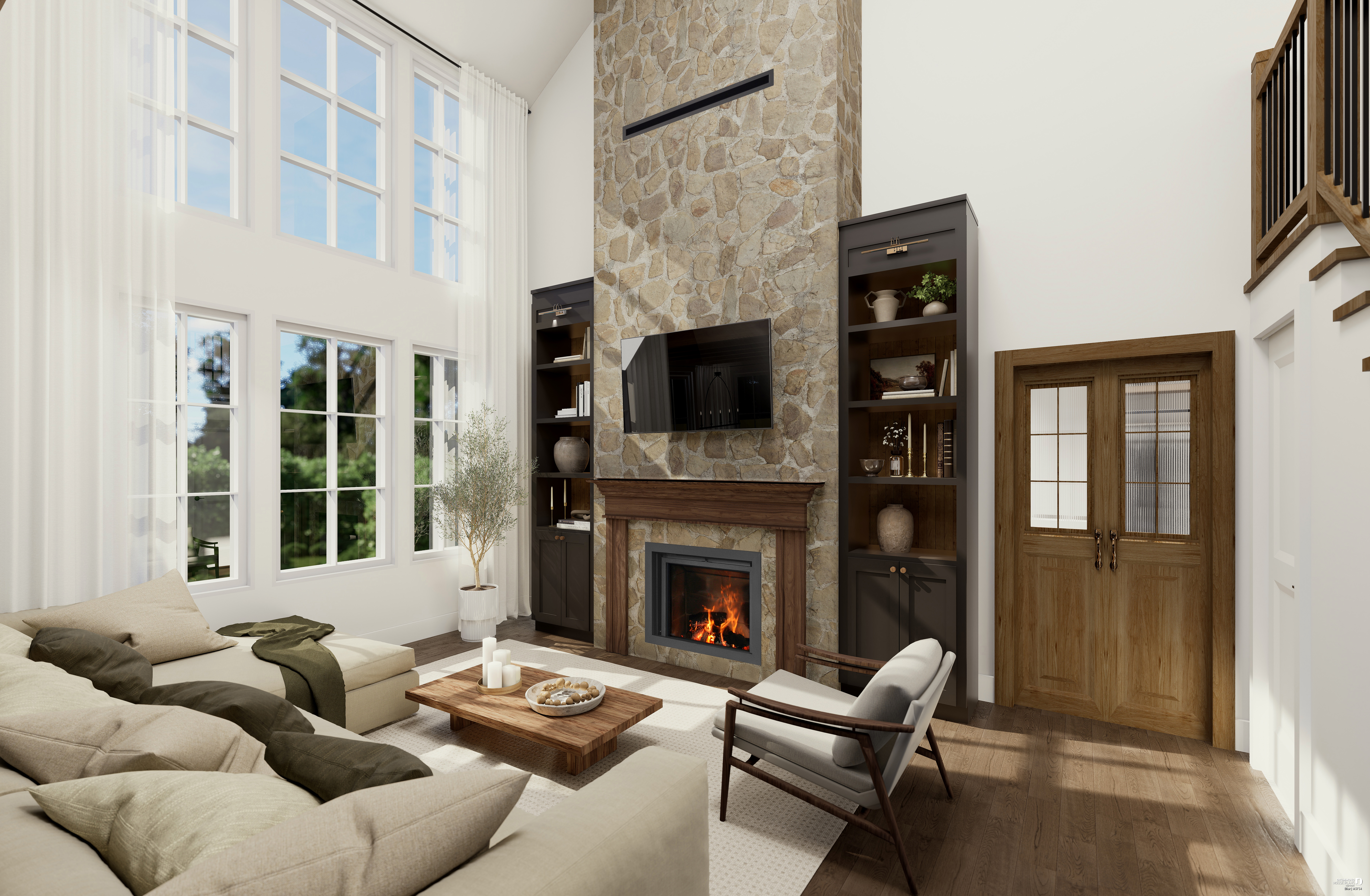 Two-story living room enhanced with a *fireplace and built-in cabinetry.