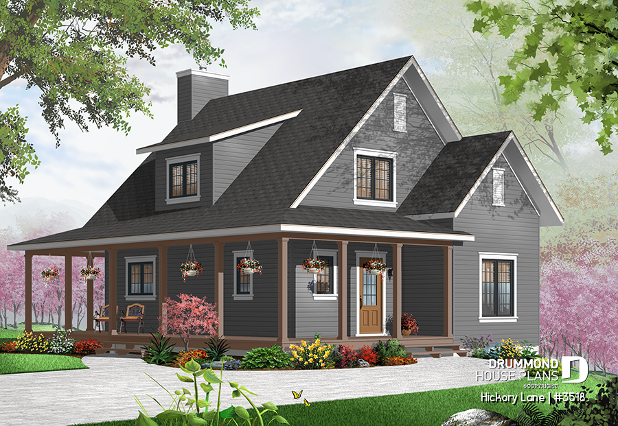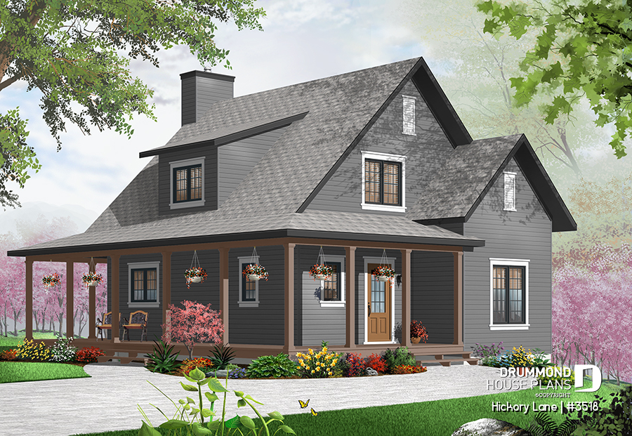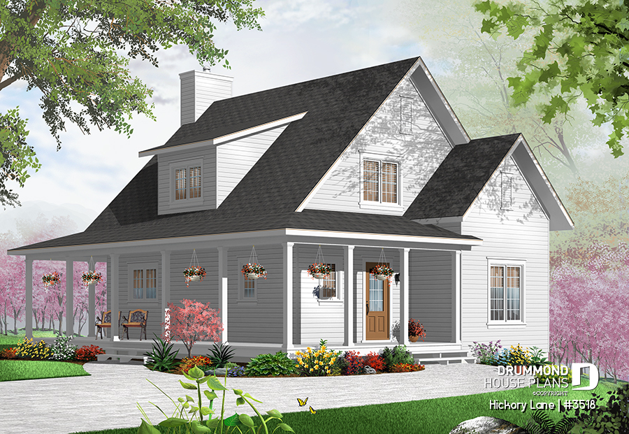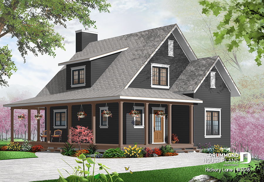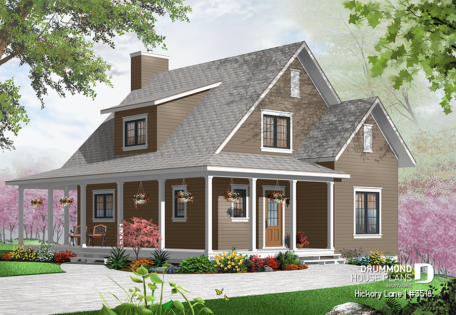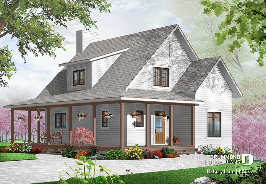 Country Cottage House Plan with 3 Bedrooms, Wraparound Porch & Cathedral Living Room