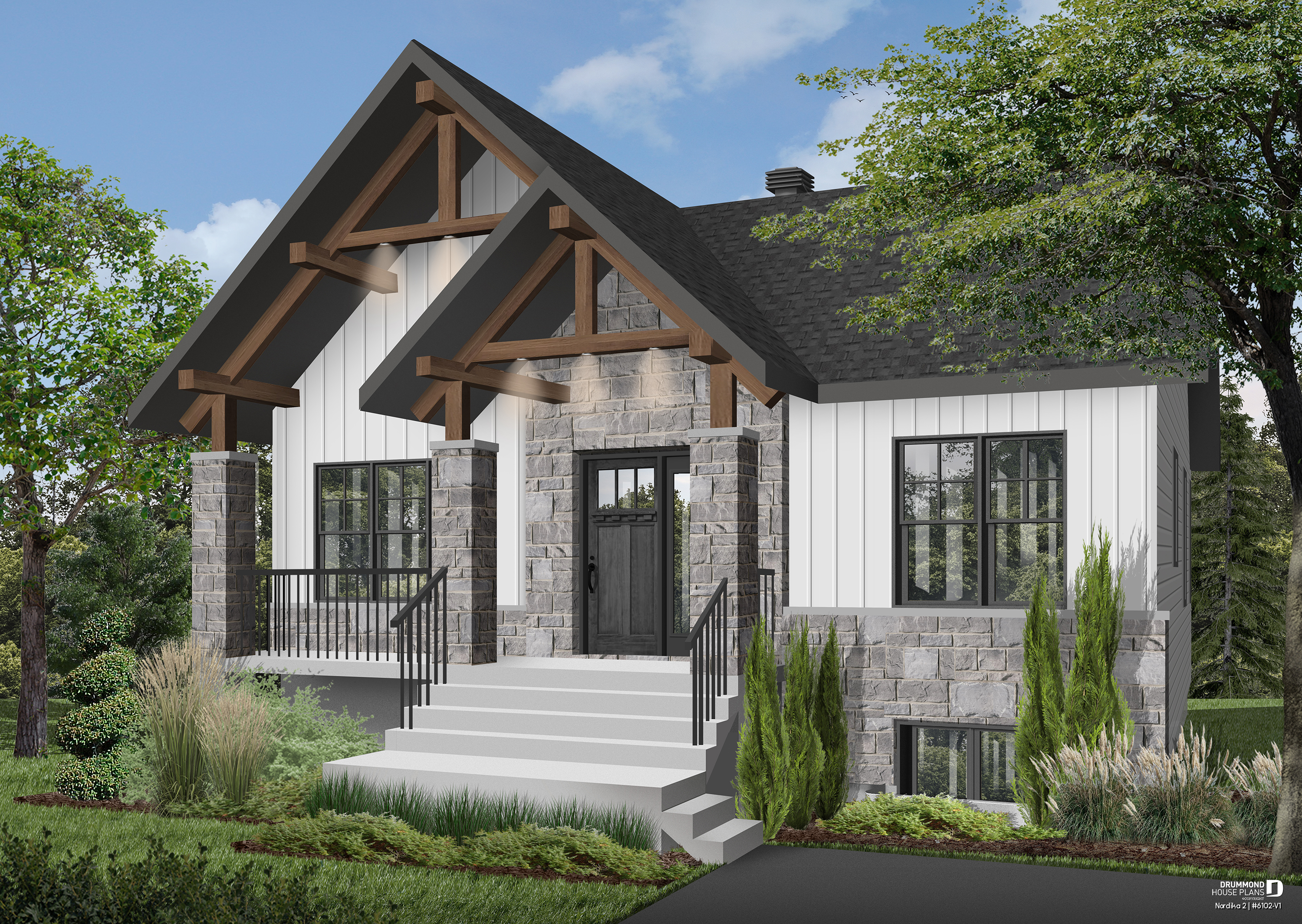 The NORDIKA 2 house plan (6102-V1), remains surprising and trendy both outside and inside. This 1,020 square foot home offers a prestigious exterior appearance, with a facade made of 50% stone and imposing wooden gables. The rustic style continues inside, where a reminder of the gables is done with beautiful wooden beams on the ceiling.
