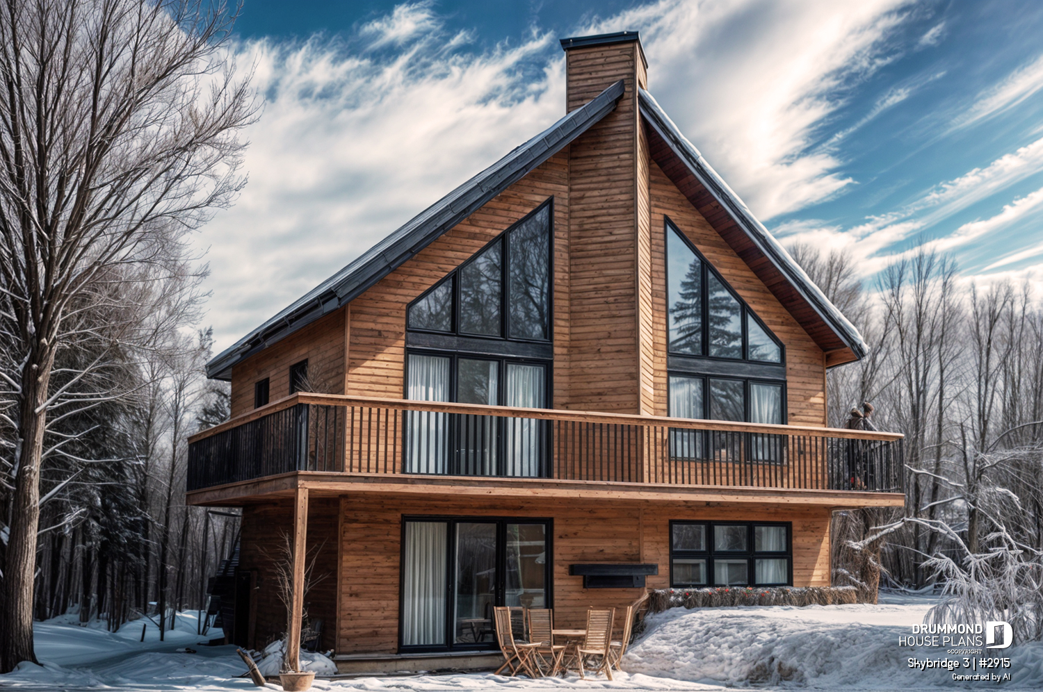 The **SKYRIDGE Chalet House Plan (#2915)** is a rustic yet highly functional design created for families seeking a **spacious, affordable, and panoramic chalet-style home**. Developed in response to the strong popularity of a previous chalet model, this plan builds on proven features while offering enhanced comfort, flexibility, and timeless appeal—making it a favorite among buyers looking for a true mountain or lakeside retreat.