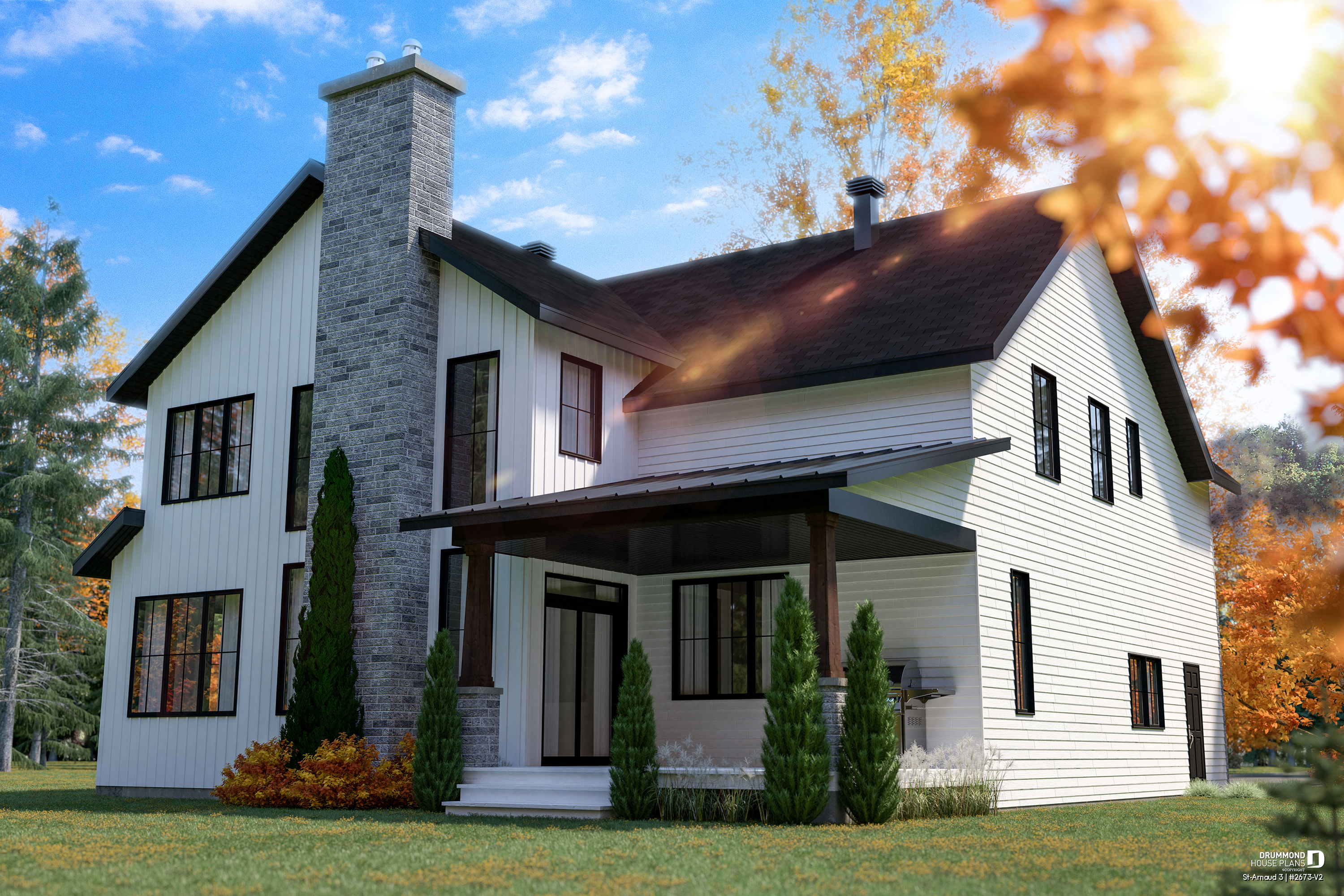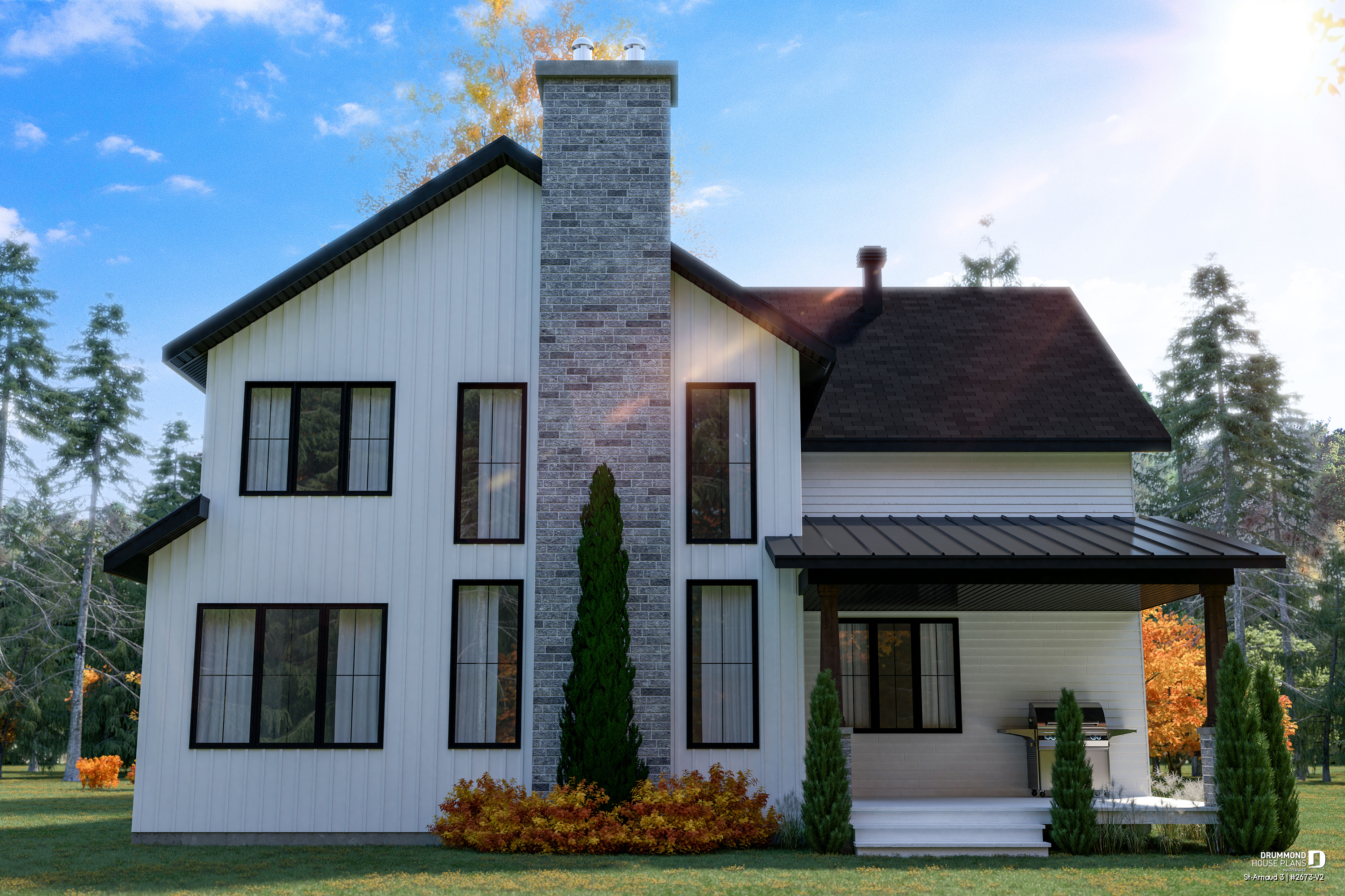 Contemporary Farmhouse Home Plan – Double Garage, 4 Bedrooms and Two-Story Wood-Burning Fireplace