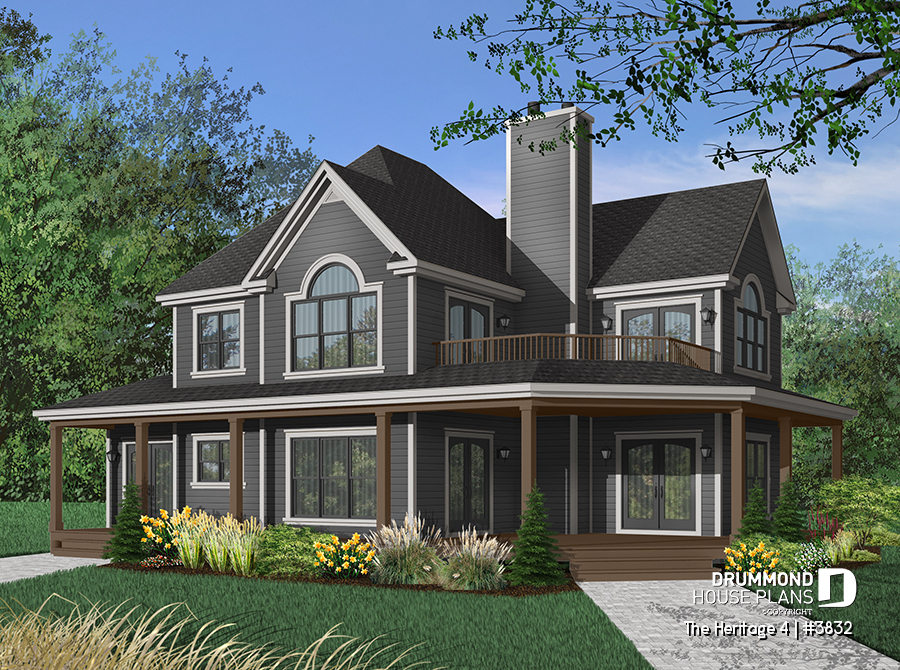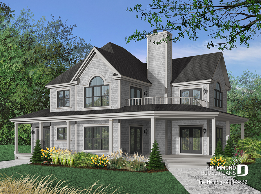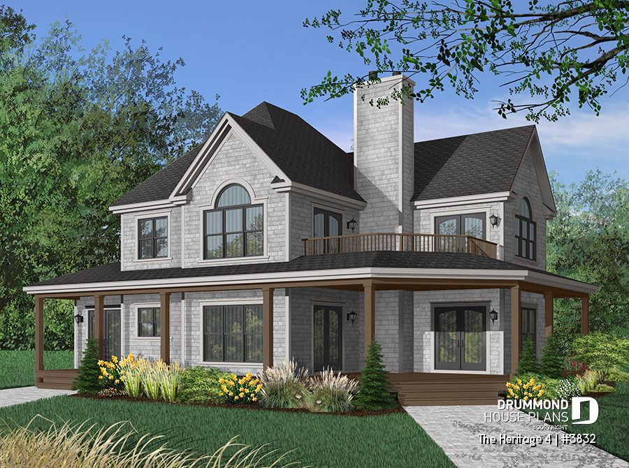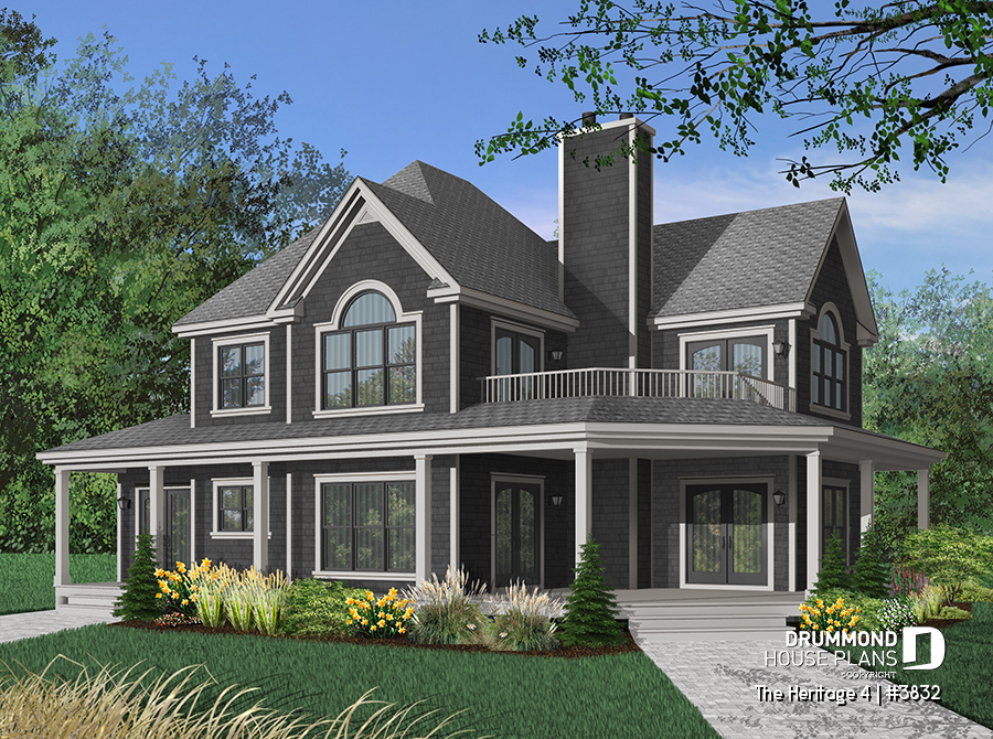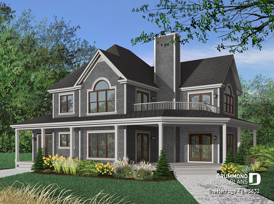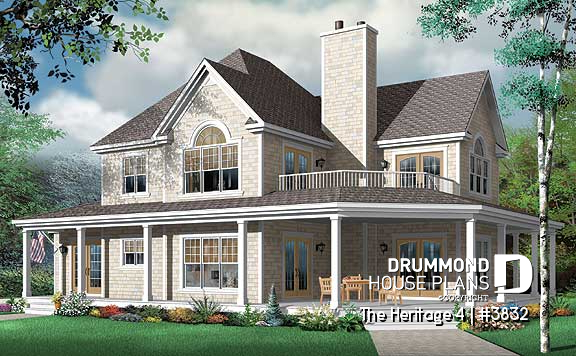 Dual master suites for this 4 bedroom Country home plan with wraparound porch & second floor terrace