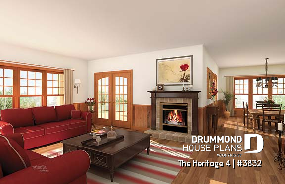 A spacious family room with a cozy fireplace opens onto a covered terrace, perfect for everyday living.