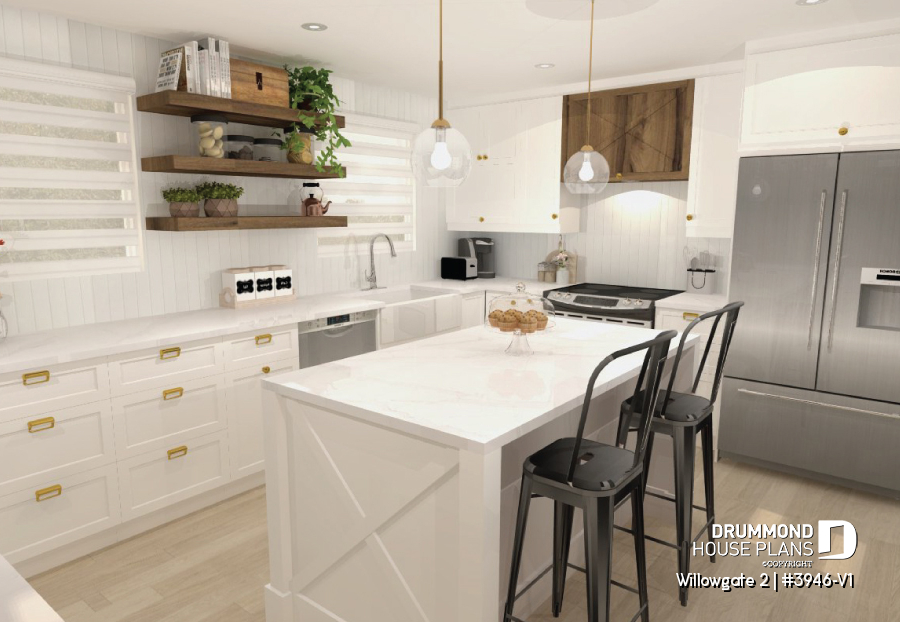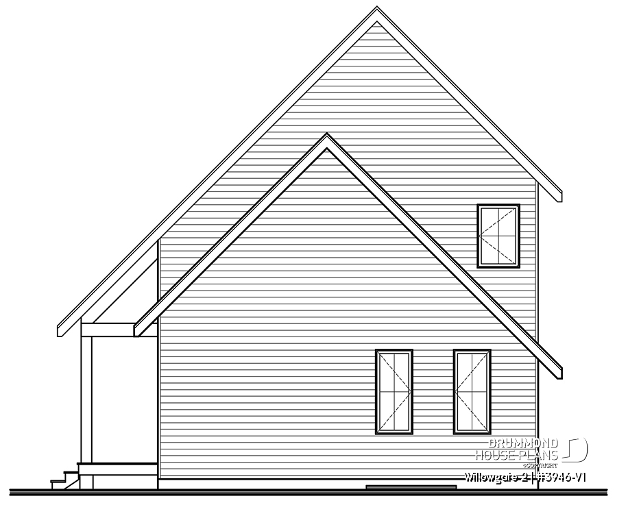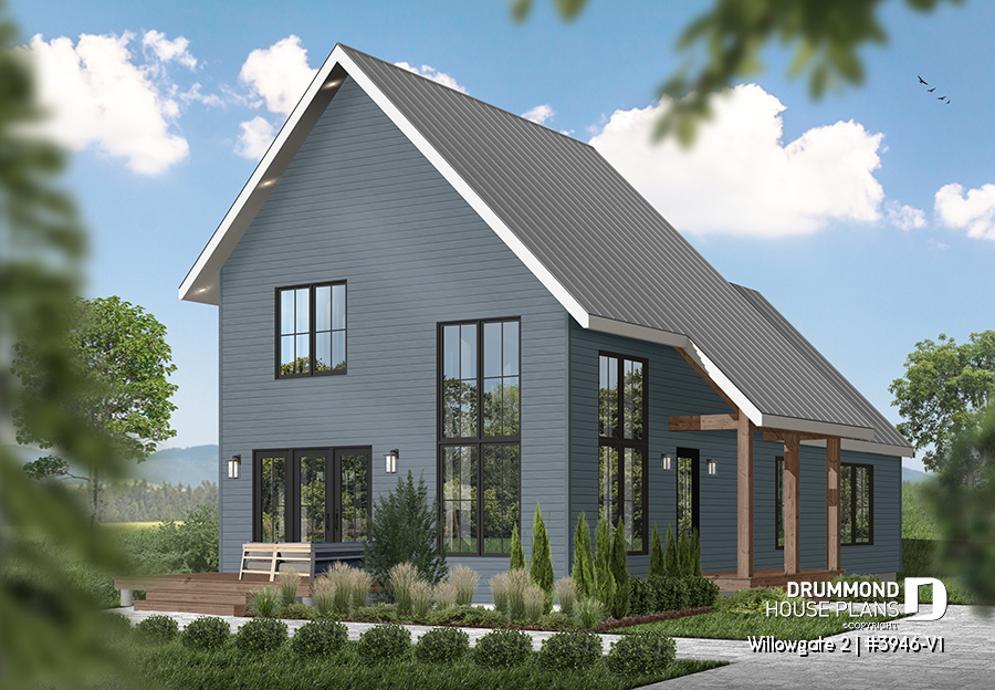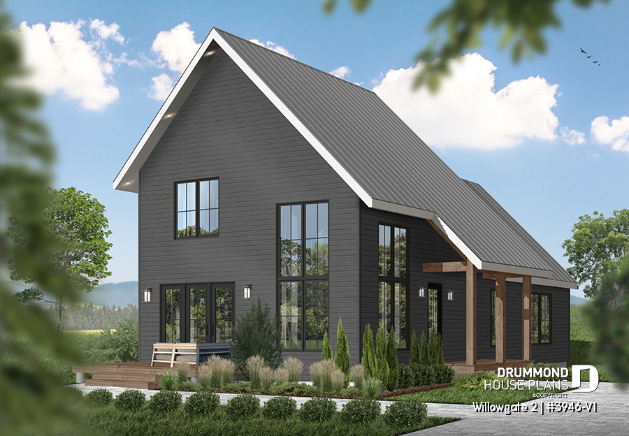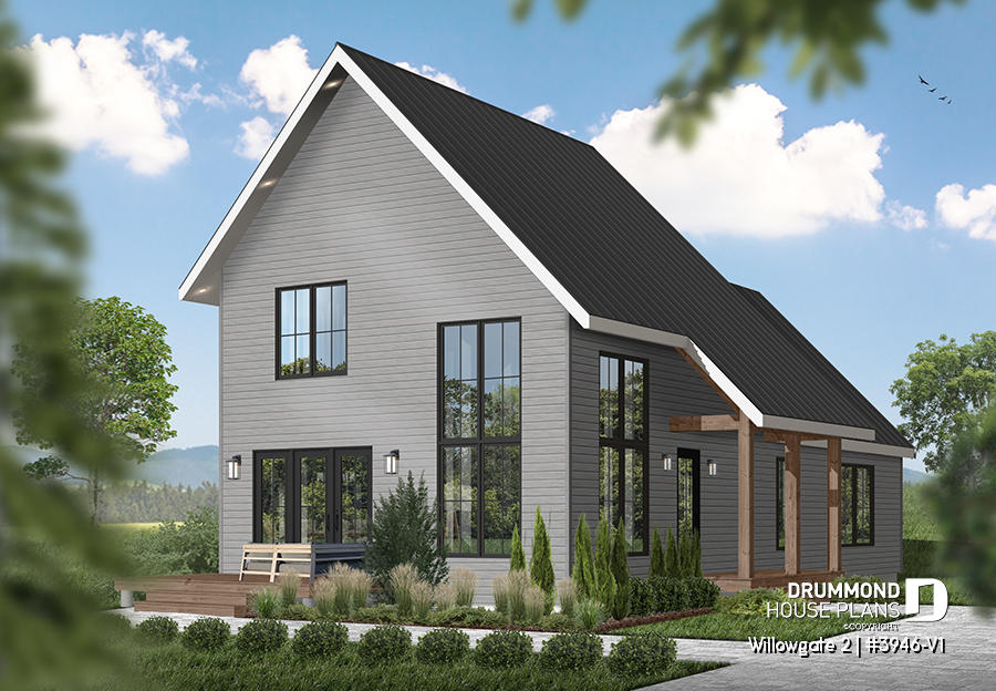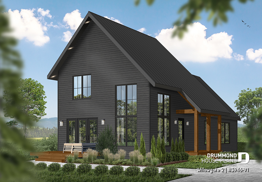 The WILLOWGATE 2 house plan (#3946-V1), a modern 3 bedroom Scandinavian-style chalet, offers 1,512 square feet with abundant windows. The partial cathedral ceiling in the living room and in the parents' suite offers even more in terms of light.