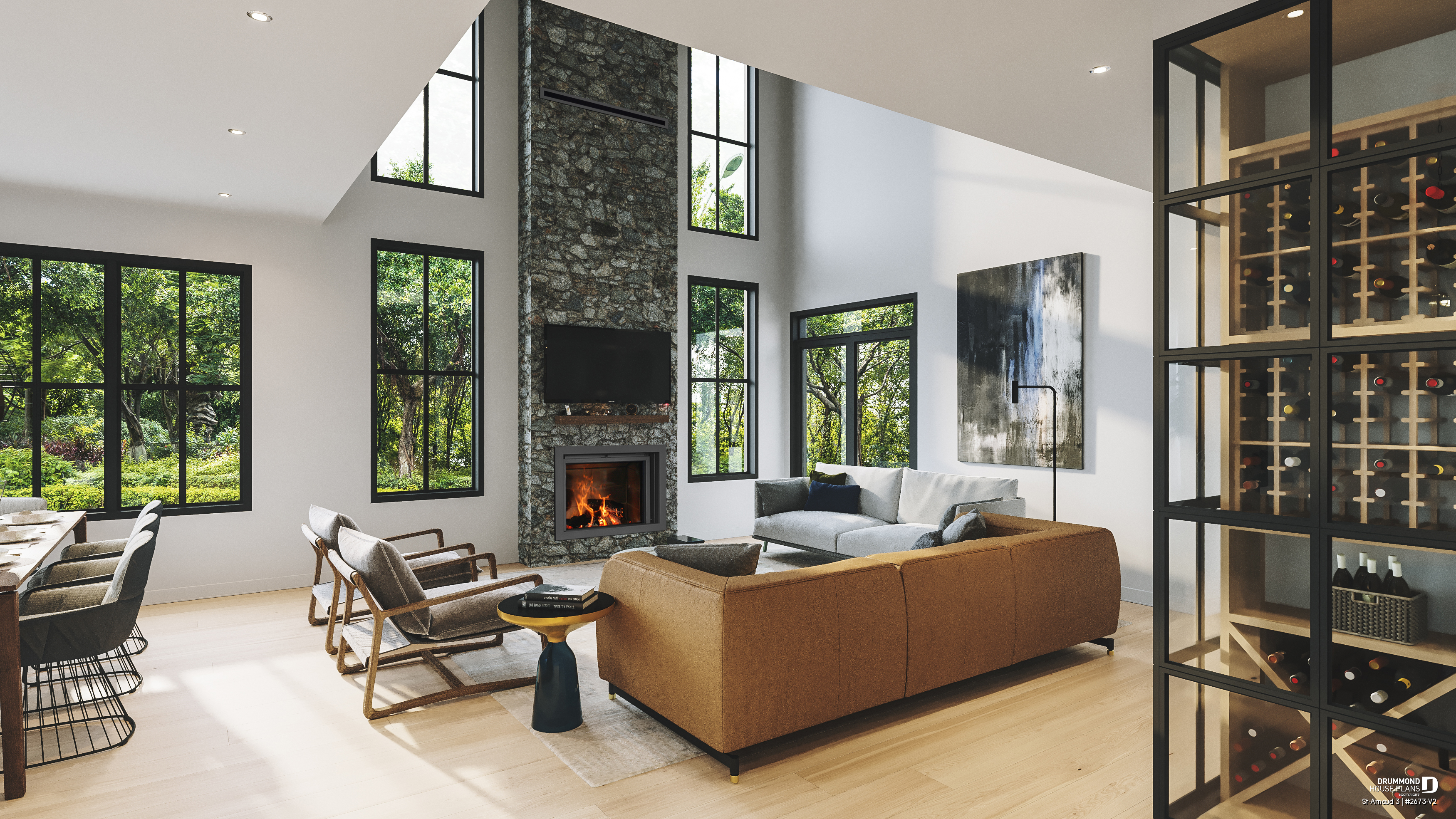 The living room and family room stand out with their two-story central fireplace, bringing authentic charm and a warm ambiance. The proposed wood-burning model, the STÛV s21, is renowned for its elegant design and performance. The open mezzanine and cathedral ceiling add a dramatic effect and flood the space with natural light, creating a unique retreat where the whole family loves to gather.