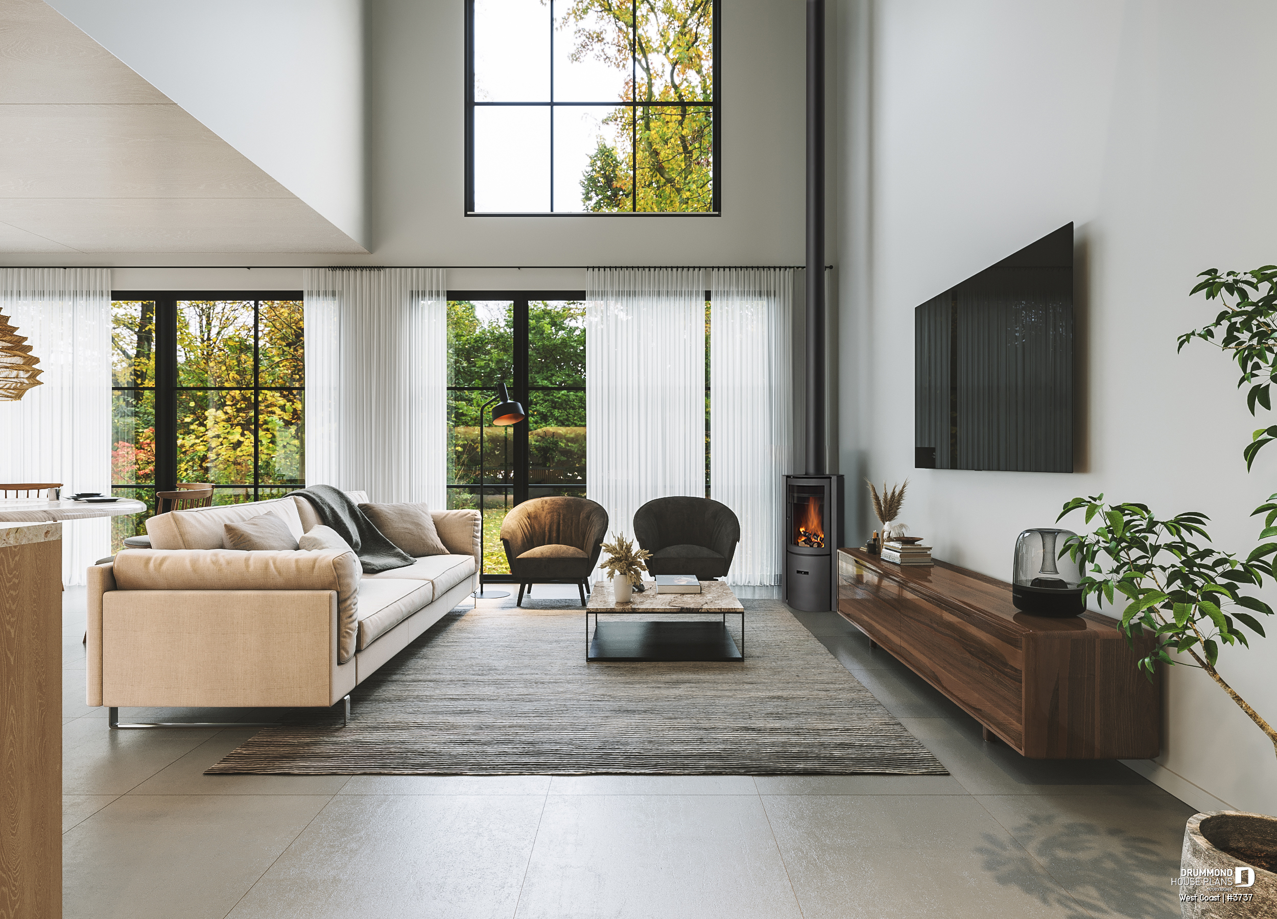 At the heart of the home, the kitchen features a large gathering island and a functional pantry. It flows seamlessly into a bright dining area overlooking the side yard, creating the perfect setting for family meals and entertaining friends. The living room impresses with its spectacular 18’4” ceiling, visible from the upstairs mezzanine. In this expansive space stands the STÛV s30C wood stove, positioned near the television to bring cozy warmth and Scandinavian ambiance throughout the colder seasons.