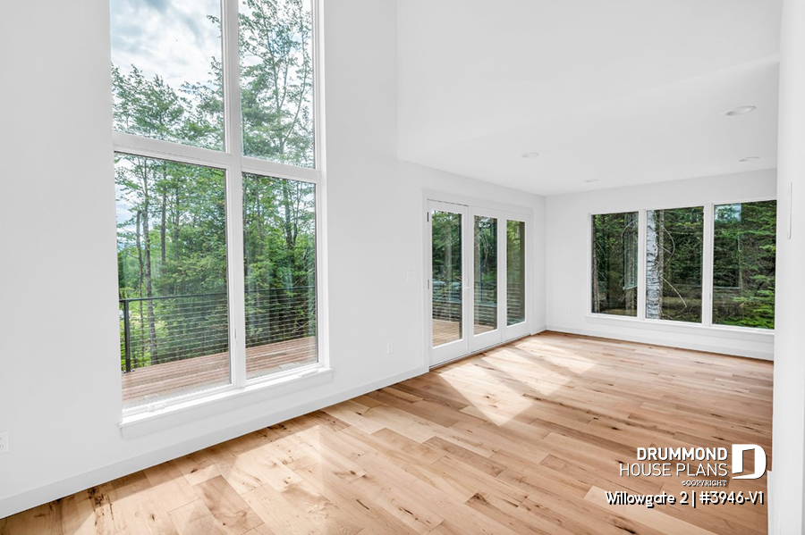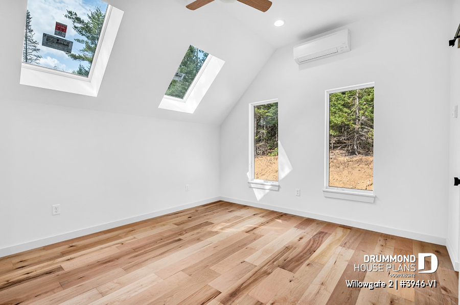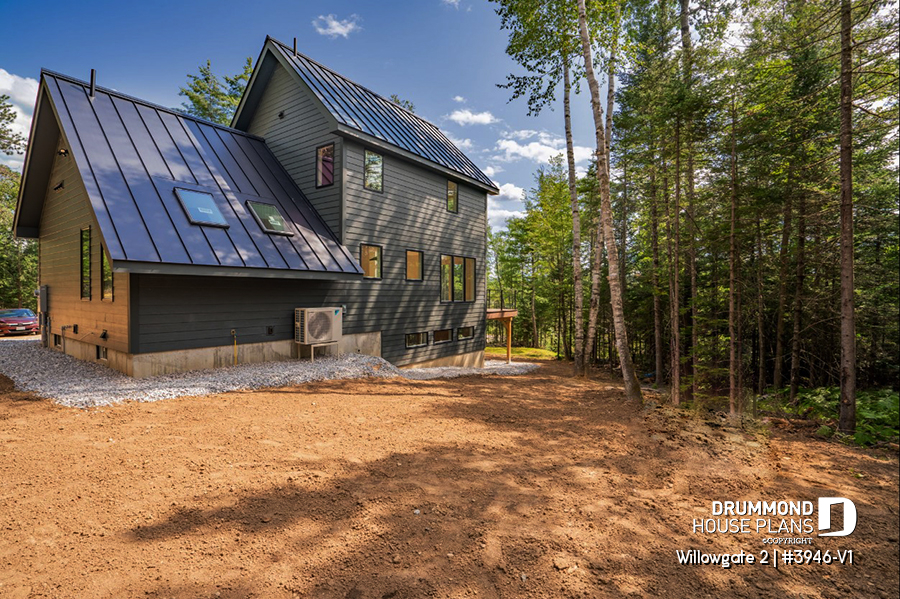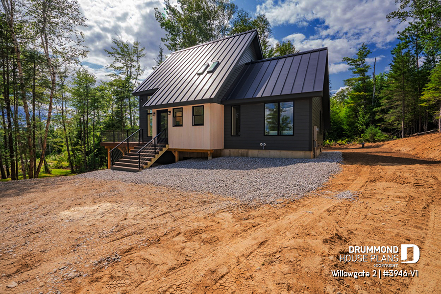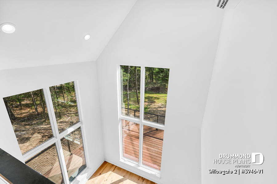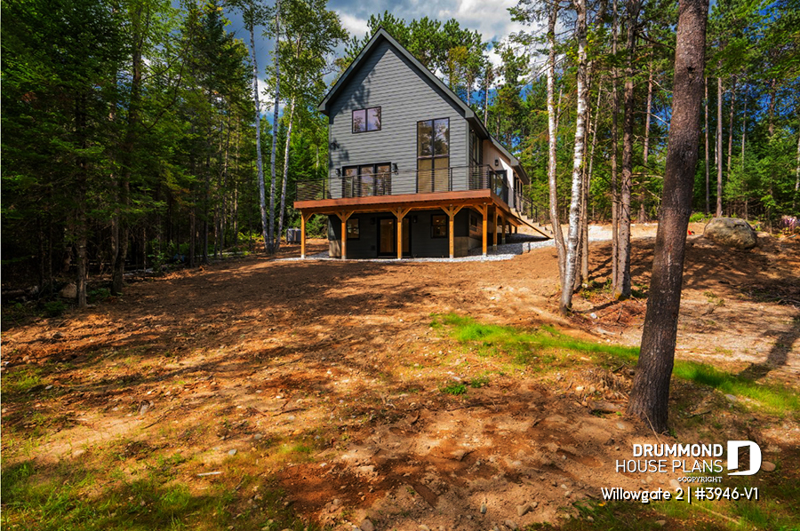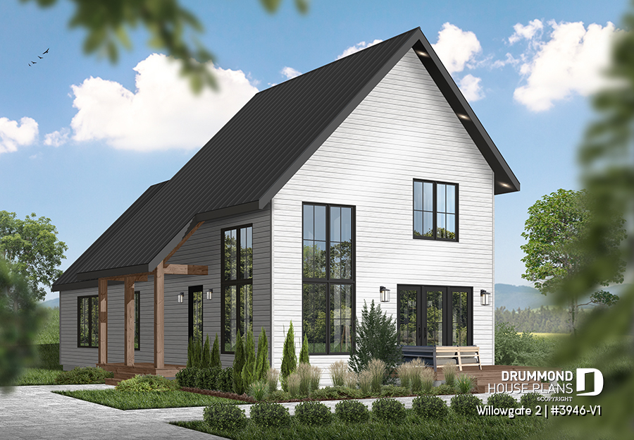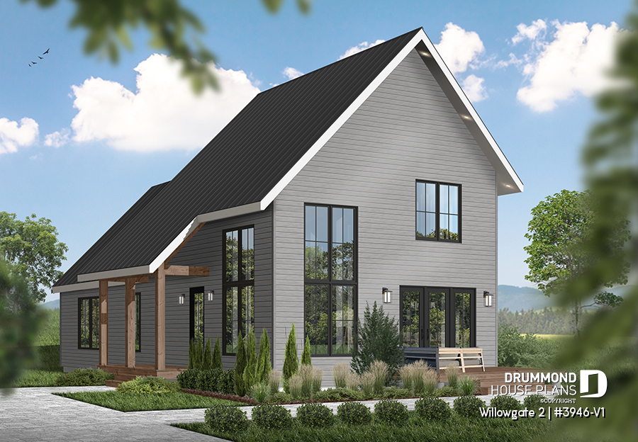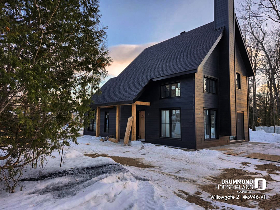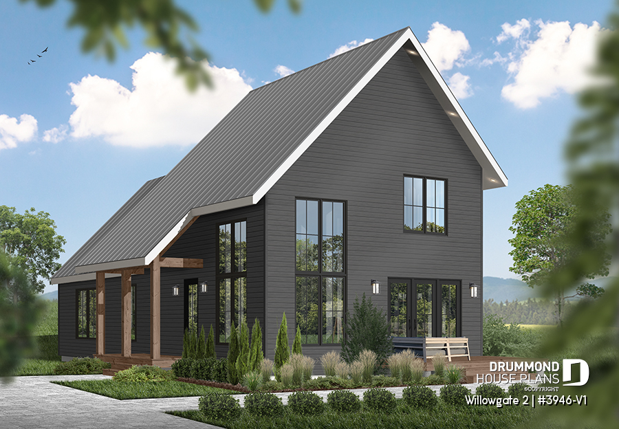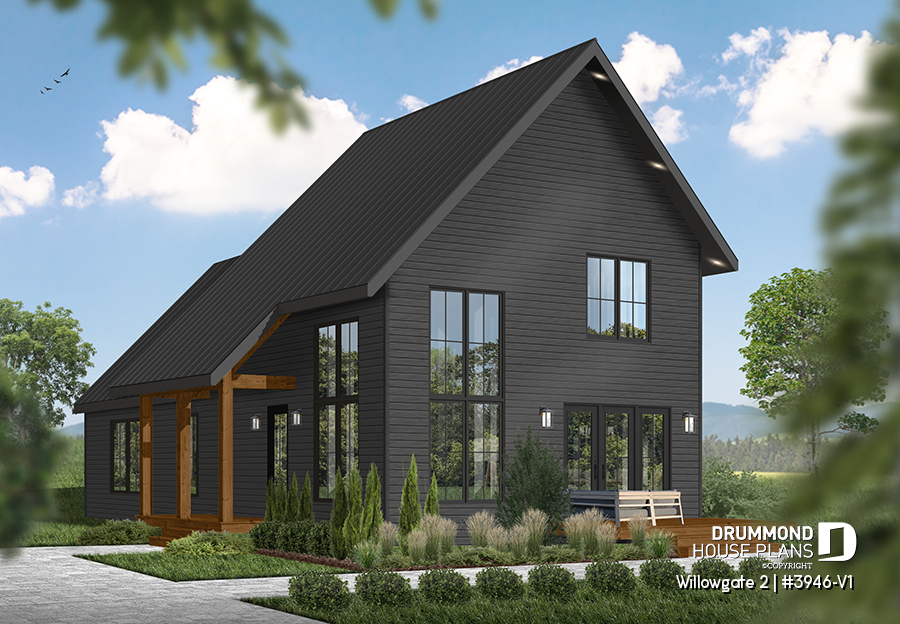 The WILLOWGATE 2 house plan (#3946-V1), a modern 3 bedroom Scandinavian-style chalet, offers 1,512 square feet with abundant windows. The partial cathedral ceiling in the living room and in the parents' suite offers even more in terms of light.