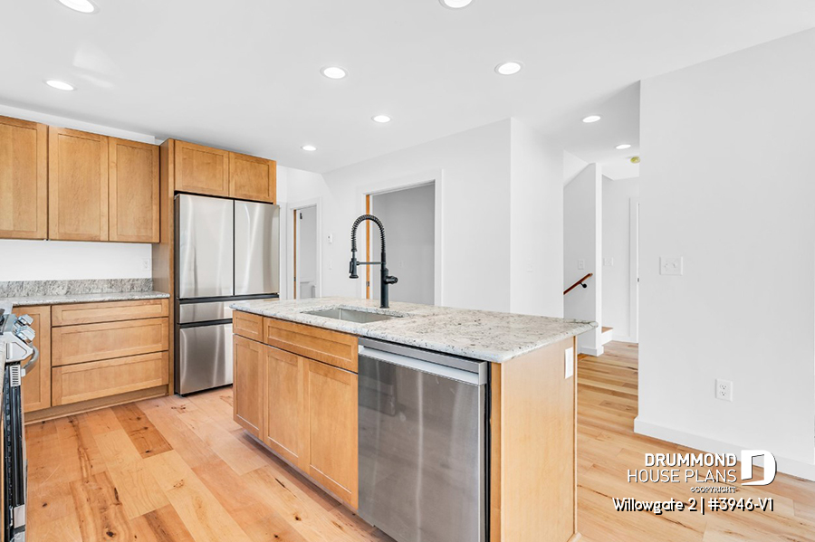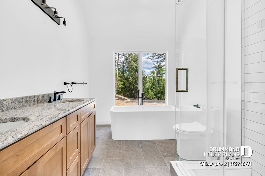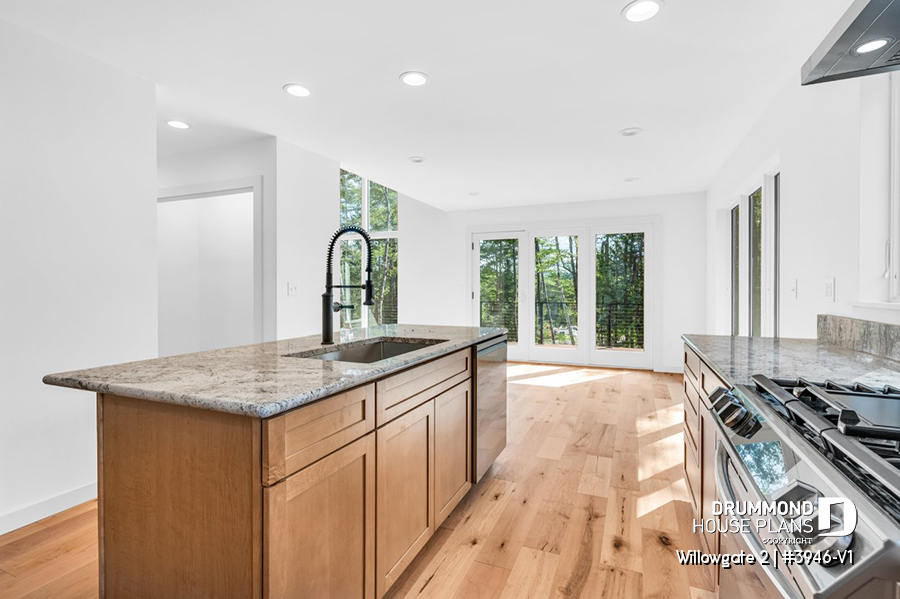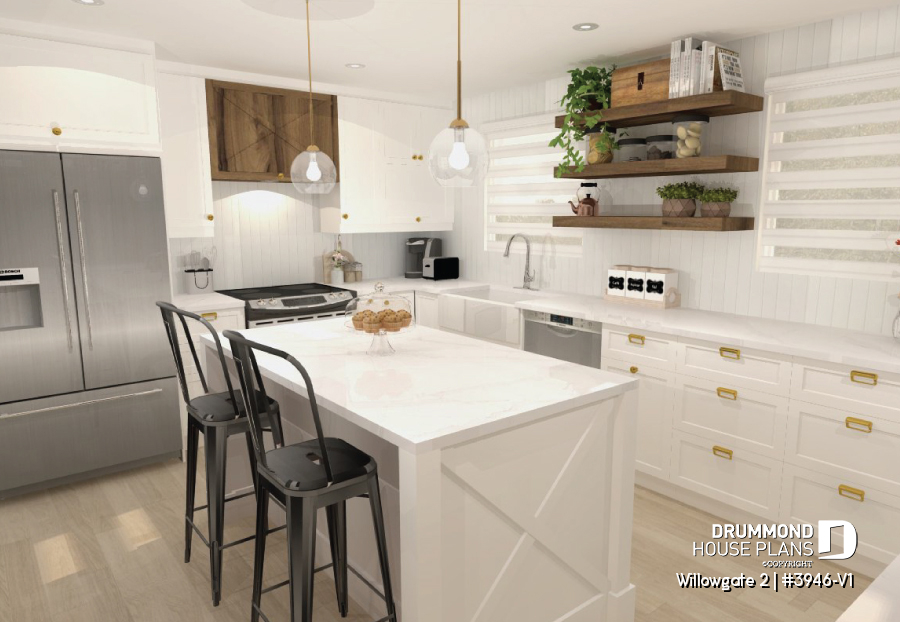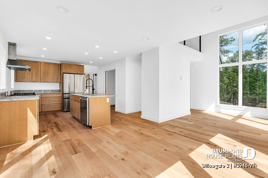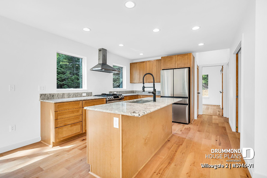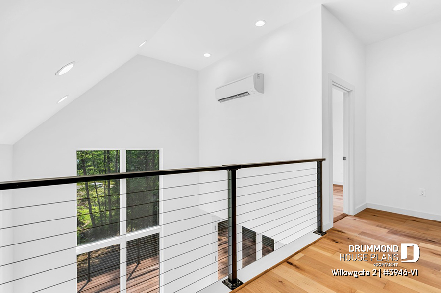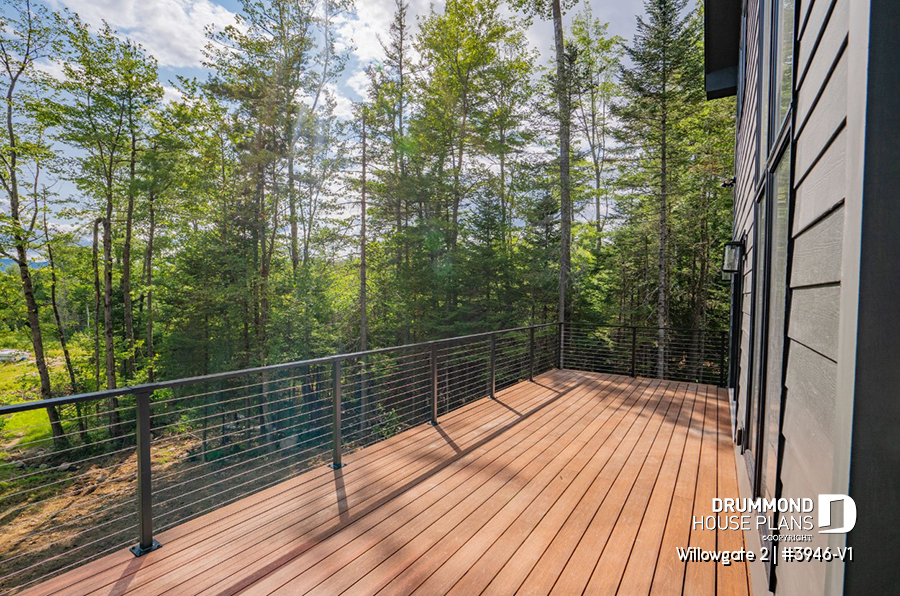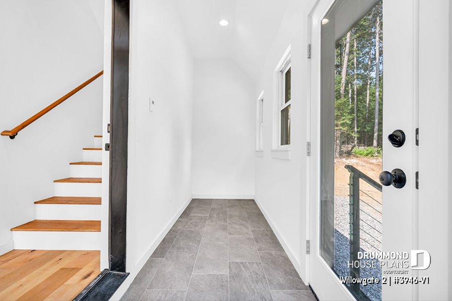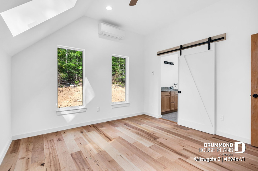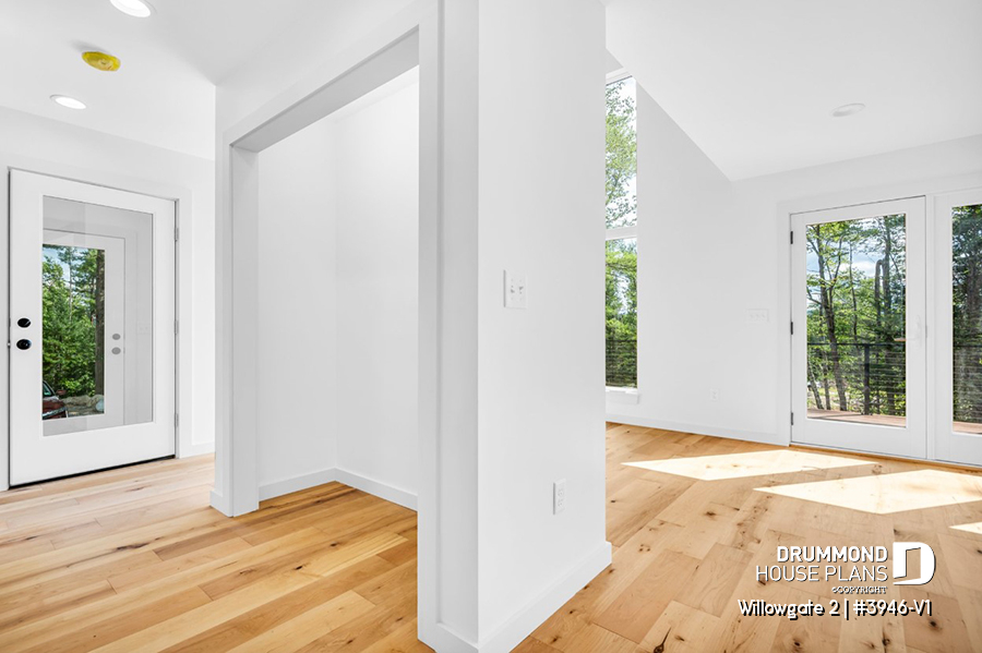 The WILLOWGATE 2 house plan (#3946-V1), a modern 3 bedroom Scandinavian-style chalet, offers 1,512 square feet with abundant windows. The partial cathedral ceiling in the living room and in the parents' suite offers even more in terms of light.