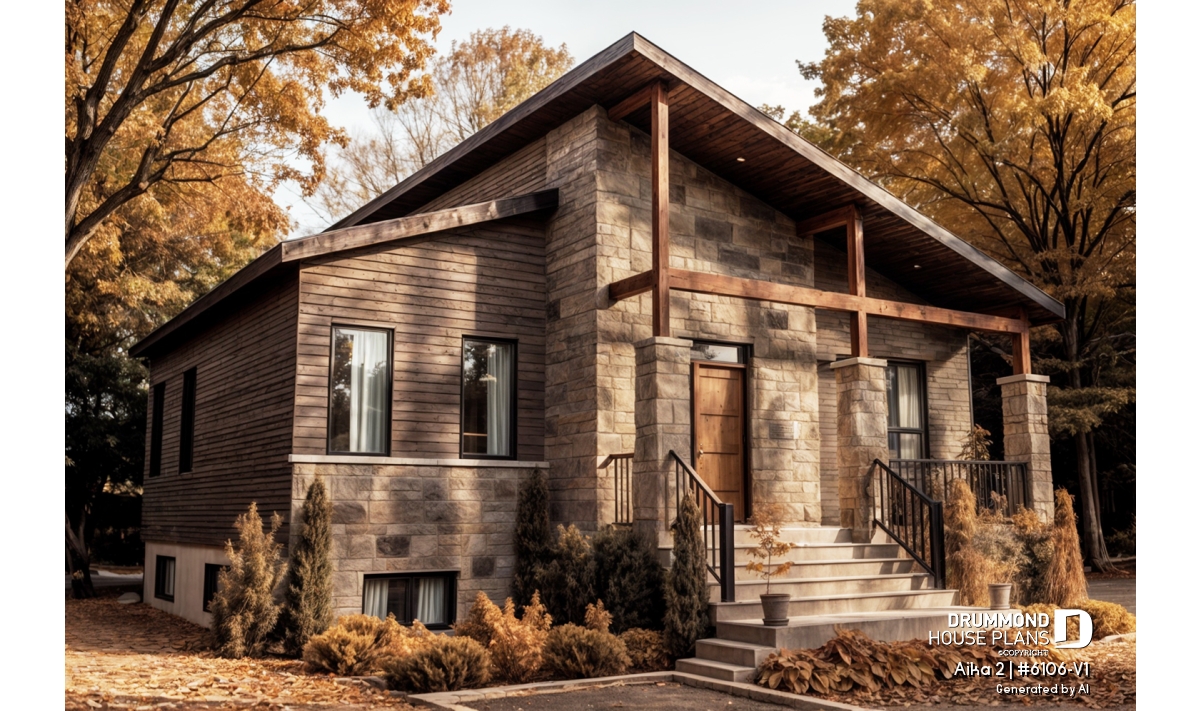 Compact home with modern rustic inspiration, featuring wood and masonry on the front façade.