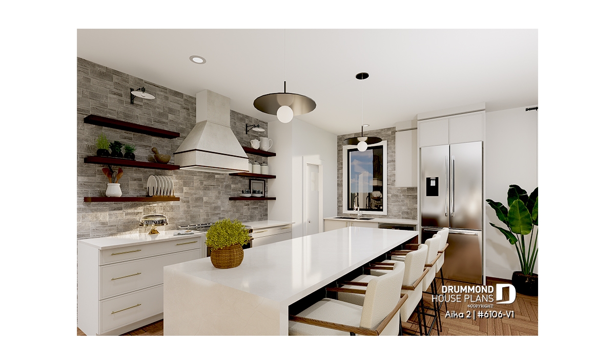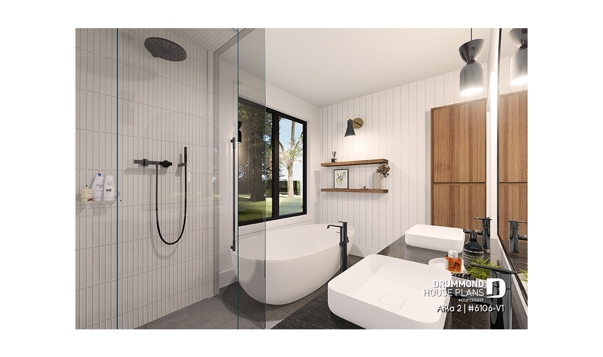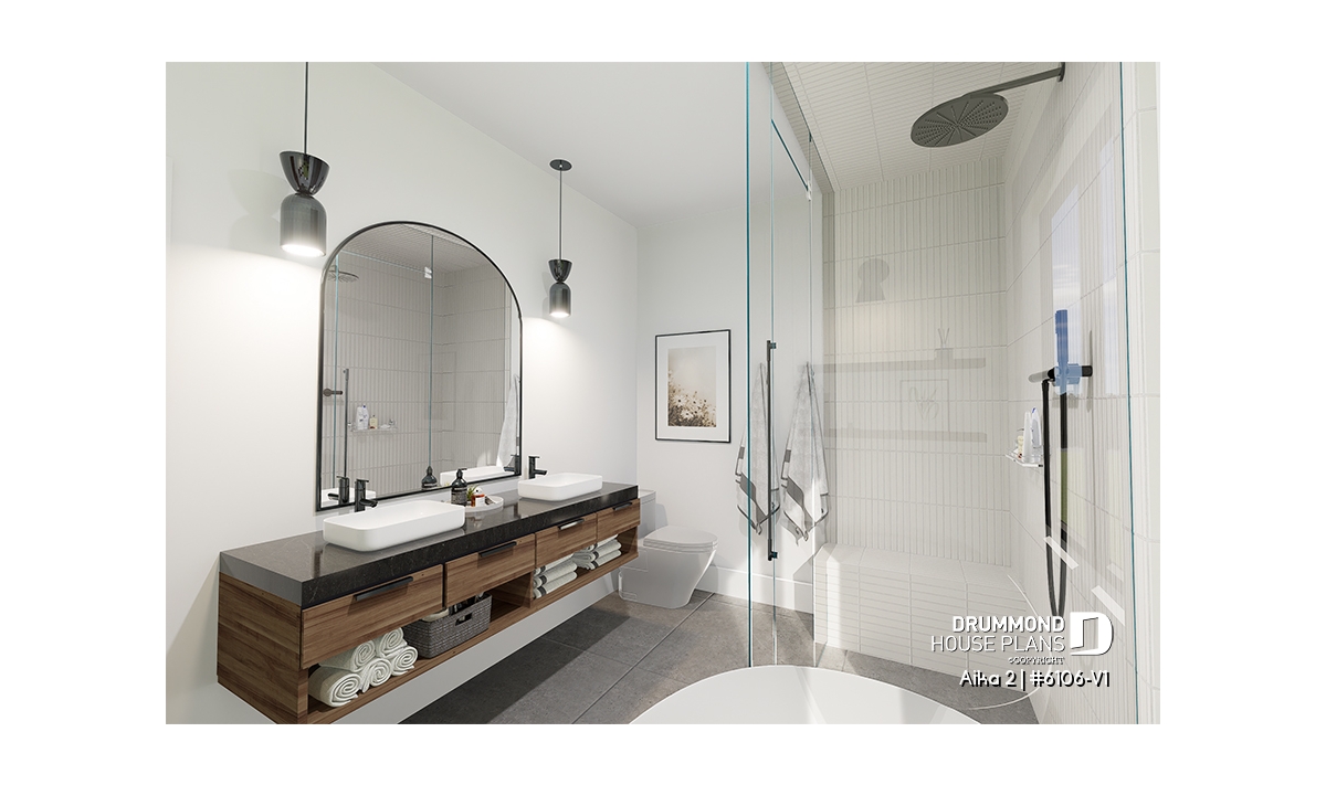 A key highlight of the Aika 2 (6106-V1) is the primary suite located on the main floor, providing comfort and privacy. It features a spacious walk-in closet and a private ensuite with a double vanity, as well as a separate bathtub and shower. A conveniently located powder room, equipped with stacked washer and dryer, completes the main level.