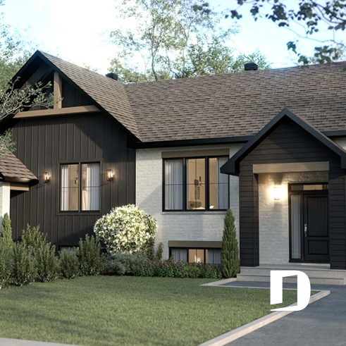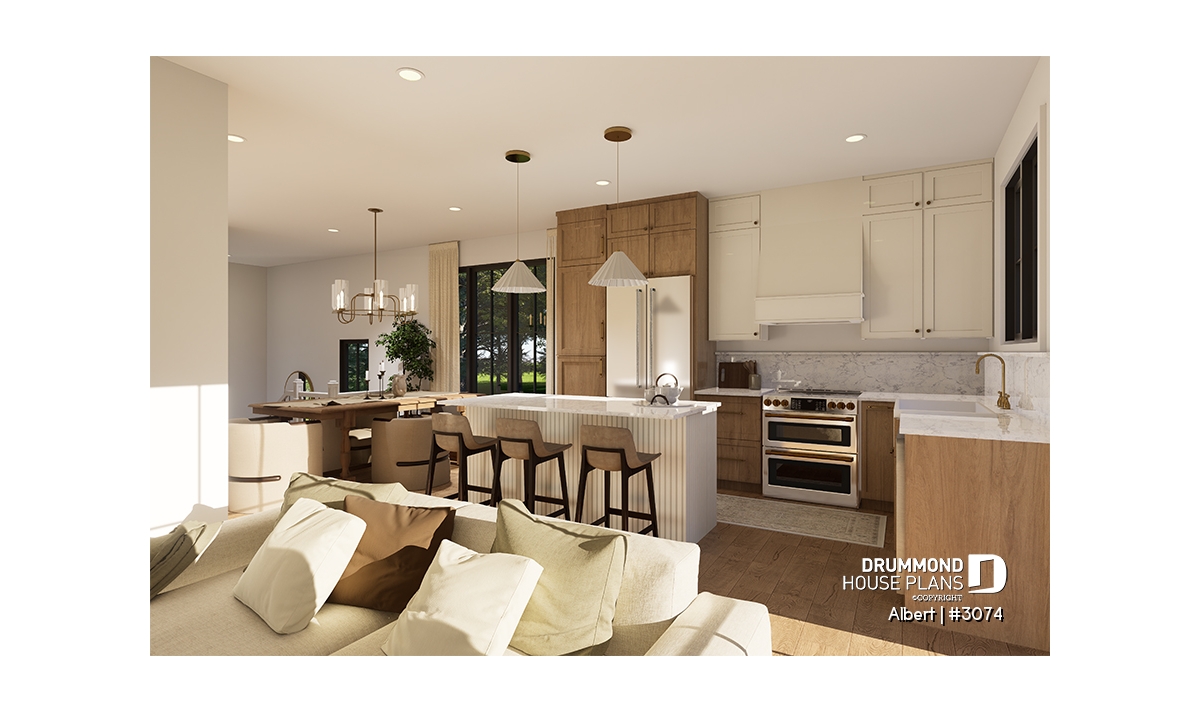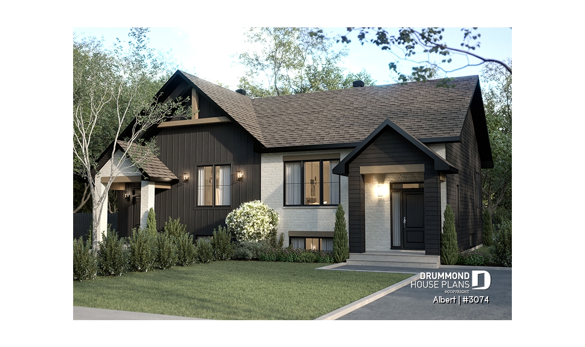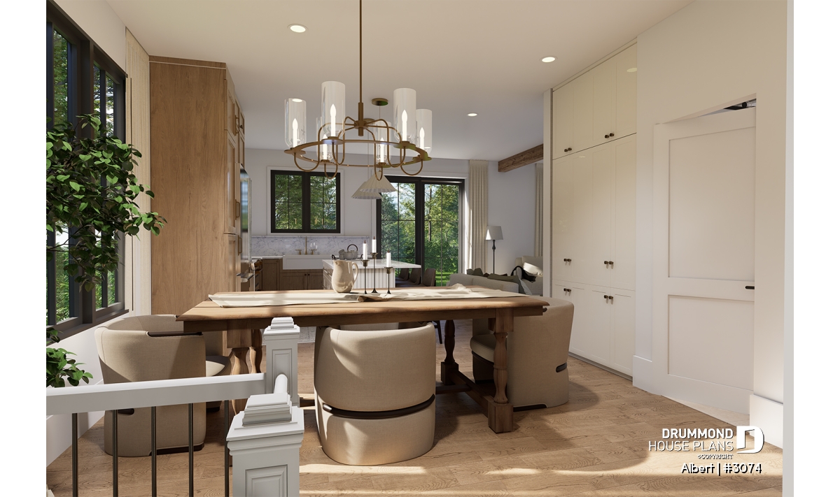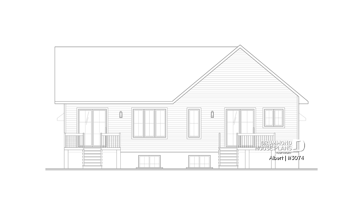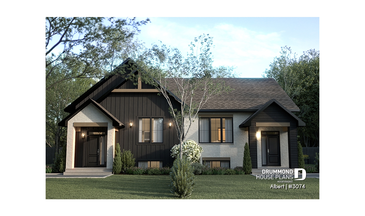 The ALBERT house plan (semi-detached plan #3074) offers a total of 3,600 sq. ft. on the ground floor and fully finished basement. Each of the dwellings therefore has a total of 1,800 sq. ft. on the ground floor and finished basement. The modern yet rustic style will attract the eye as much in the countryside as in new residential areas! Also note that both dwellings offer 9' high ceilings on the main floor.