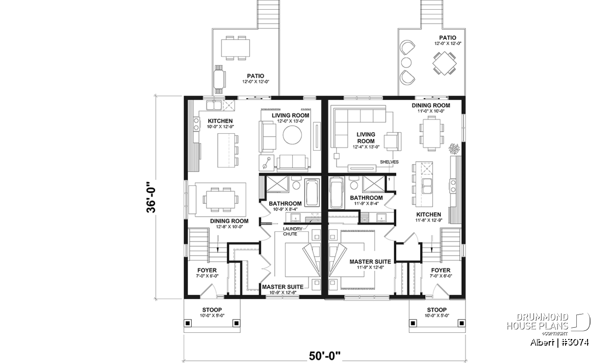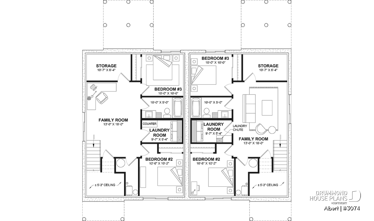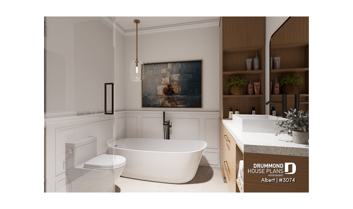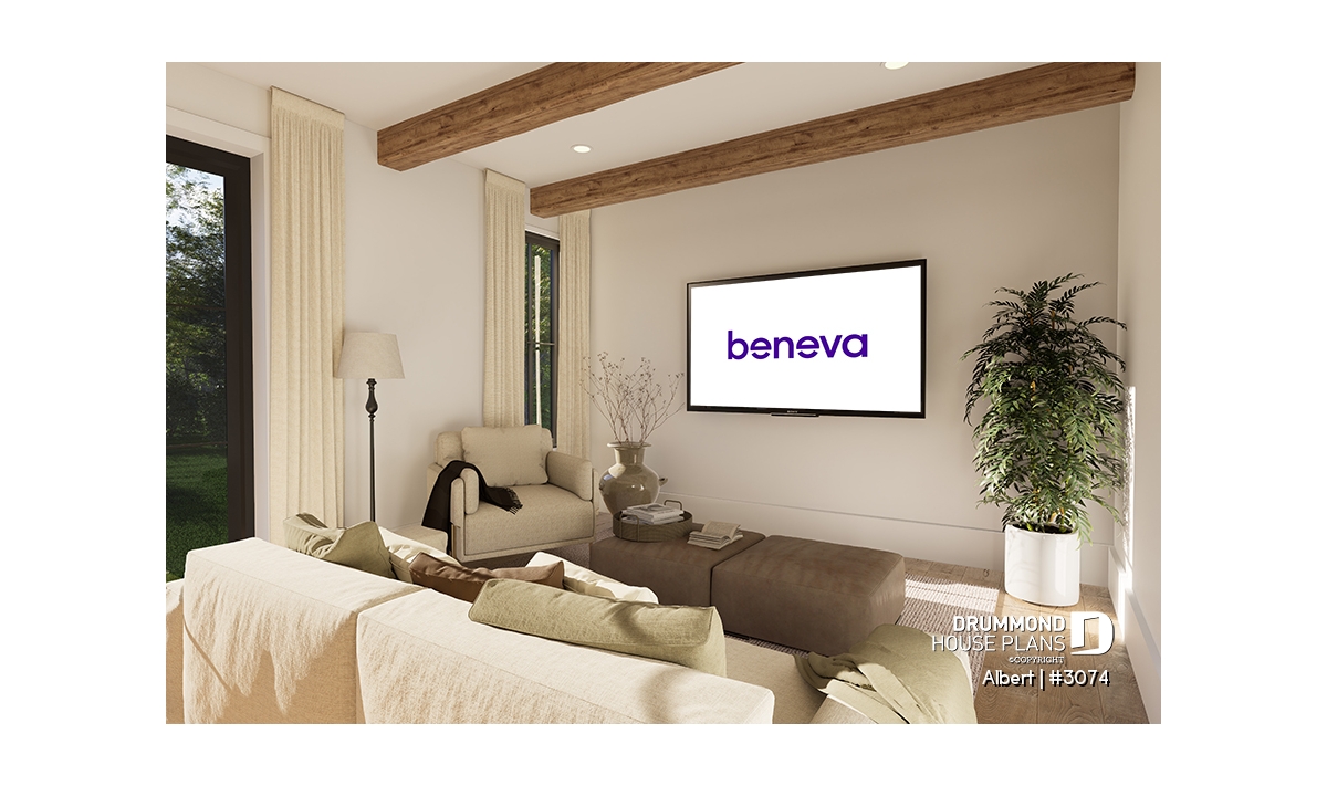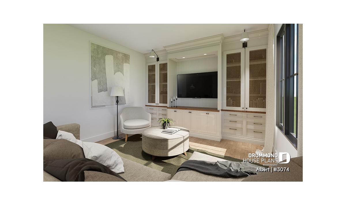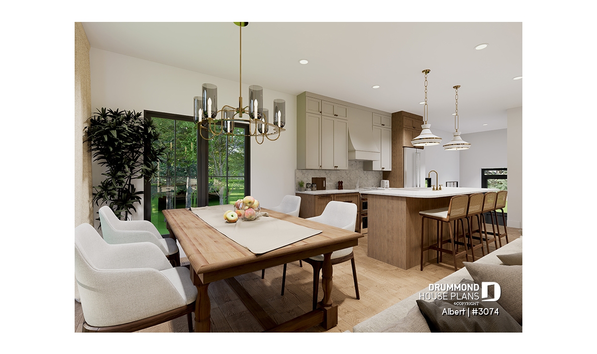 The ALBERT house plan (semi-detached plan #3074) offers a total of 3,600 sq. ft. on the ground floor and fully finished basement. Each of the dwellings therefore has a total of 1,800 sq. ft. on the ground floor and finished basement. The modern yet rustic style will attract the eye as much in the countryside as in new residential areas! Also note that both dwellings offer 9' high ceilings on the main floor.