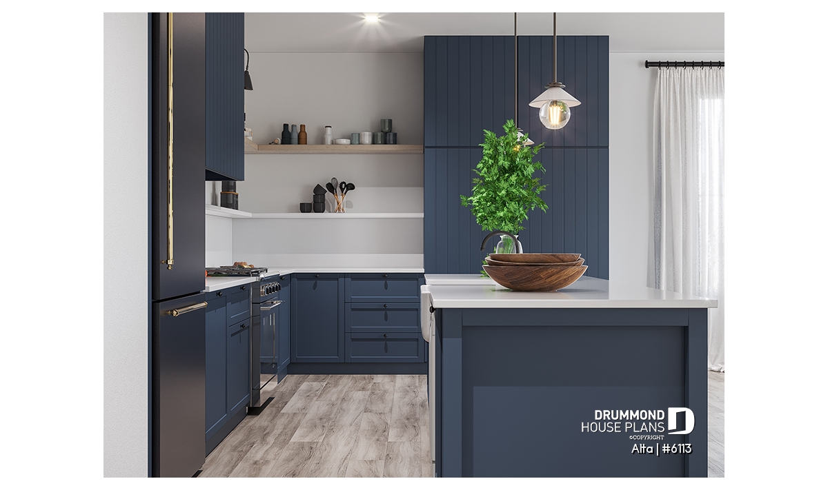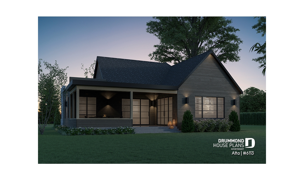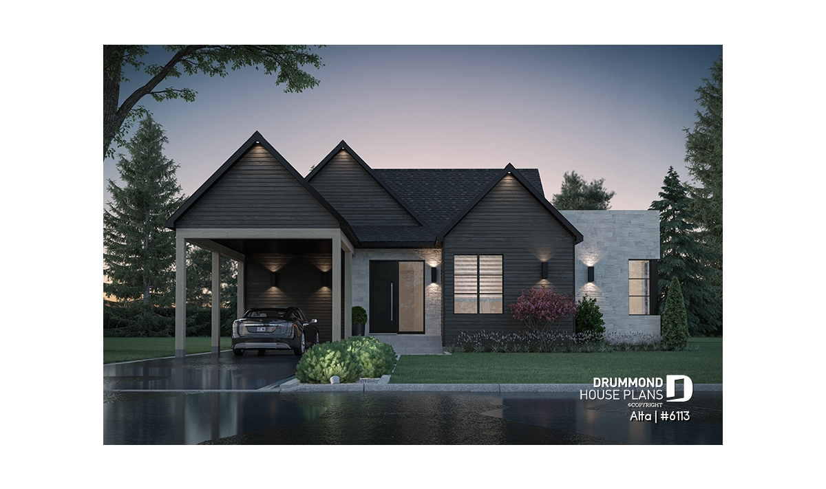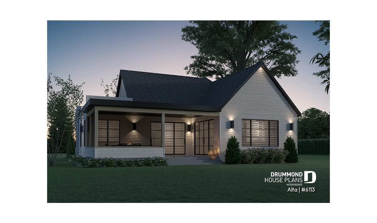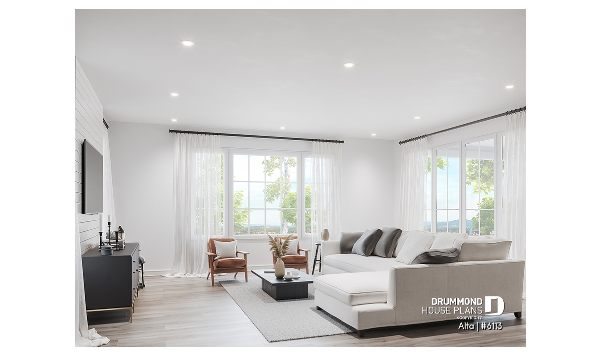 The Scandinavian-inspired house plan ALTA (#6113) offers 1555 sq.ft. on the main floor and the same on the unfinished basement. In addition, it offers 9' high ceilings, everywhere on the ground floor.