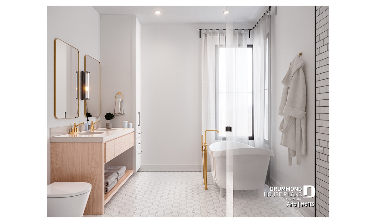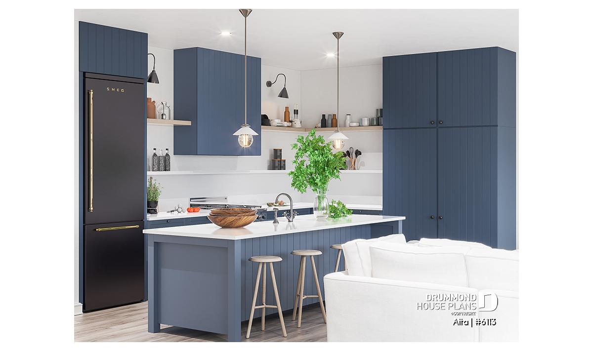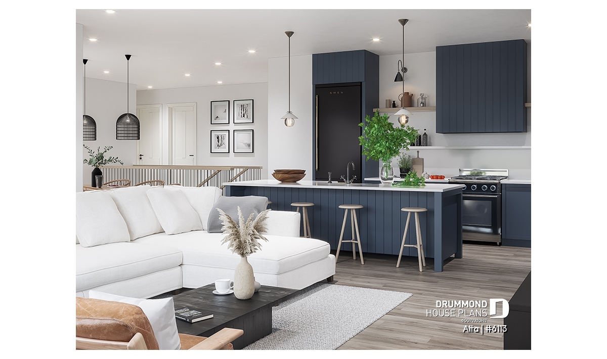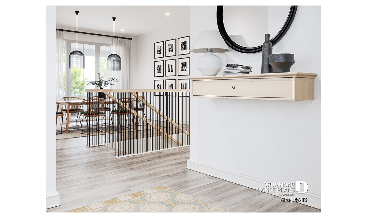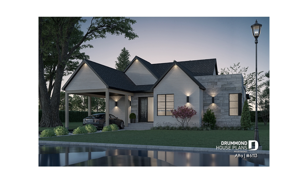 The Scandinavian-inspired house plan ALTA (#6113) offers 1555 sq.ft. on the main floor and the same on the unfinished basement. In addition, it offers 9' high ceilings, everywhere on the ground floor.