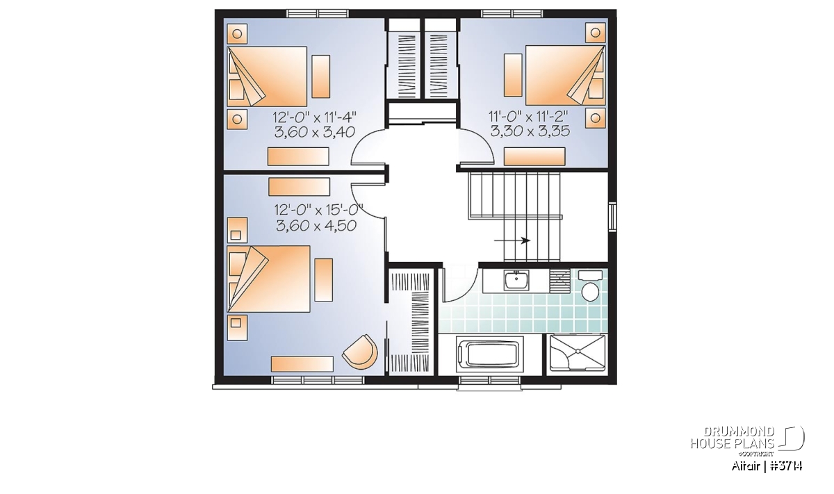 The nicely sized bedrooms upstairs, the smallest of which is 11’ x 11’, have large closets and a walk-in for the master bedroom. A well appointed bathroom with its 51’’ x 34’’ shower and separate bath and a convenient laundry chute add to the appealing features of this plan.