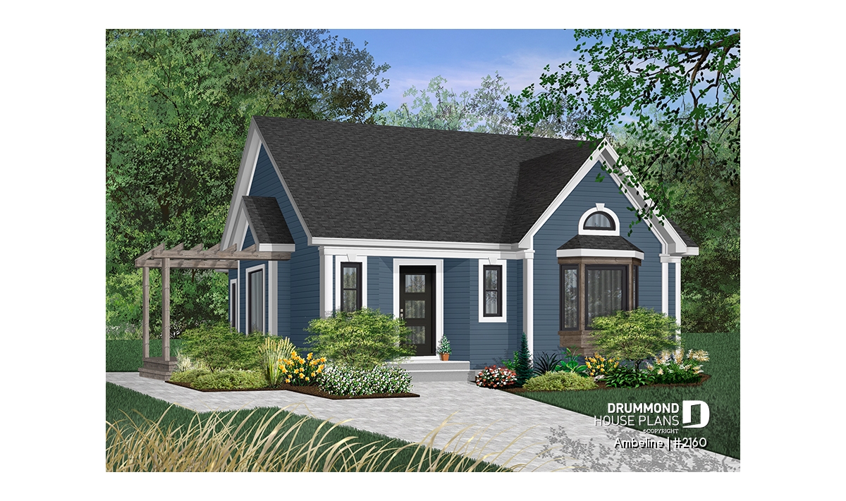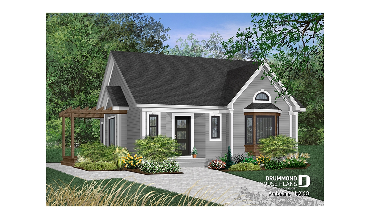 Cathedral ceiling in family room, side patio with pergola, bay window in family room.