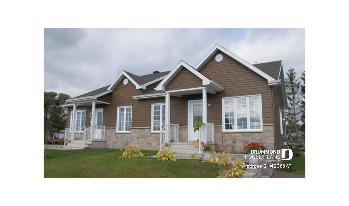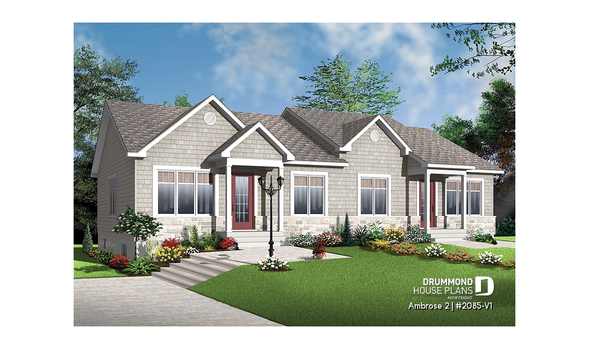 Designed from the very popular plan [url =http://www.drummondhouseplans.com/house-plan-detail/info/1001717.html] 2085 [/ url], this version includes a modified “craftsman” style exterior. Shingle siding and stone provide a more organic presence and distinctive entries provide a welcome to each unit.