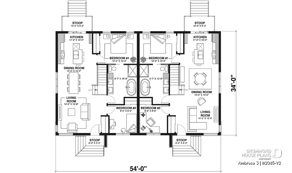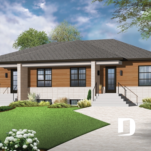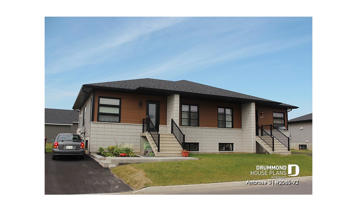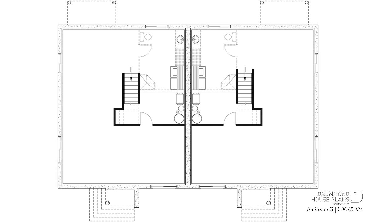 Well-separated patio placement allows a more intimate outdoor space for each unit. Additional recreation or living space can be added by developing the basement.