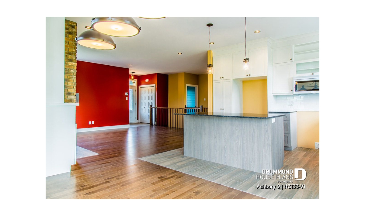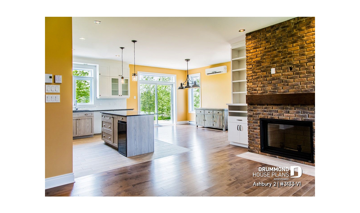 Garage with direct basement access via the utility room. Abundantly windowed dining room. Kitchen / dinette with 40" x 60" central lunch island lunch. Two good-sized bedrooms. Bathroom with double vanity and 36" x 60" shower.Utility room including laundry and freezer space. Fireplace in living room opon on three sides to the living room and the heart of the activities area.