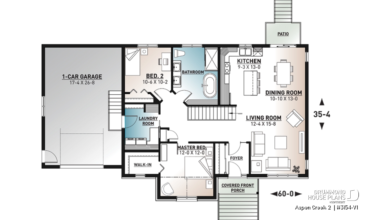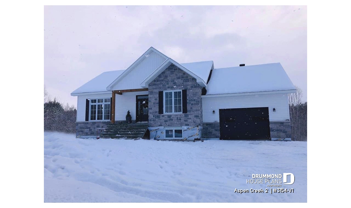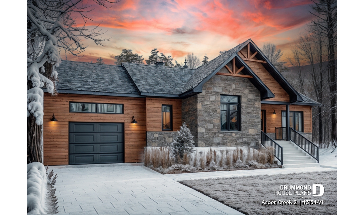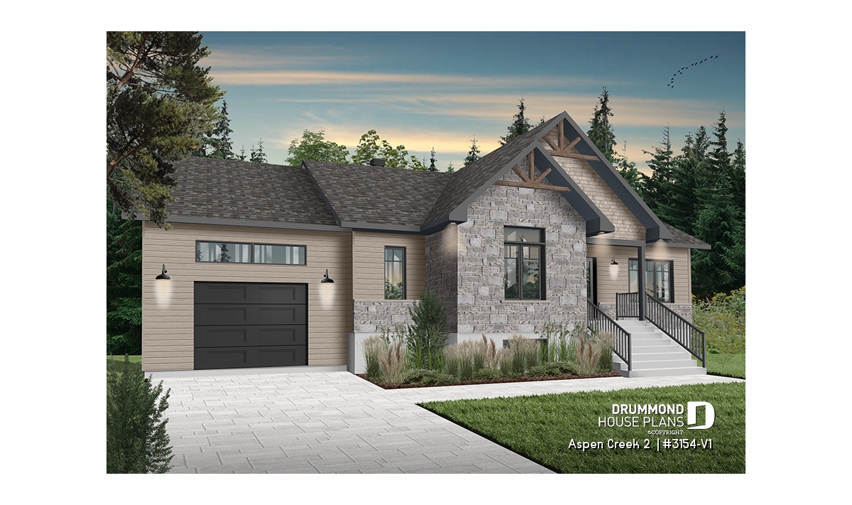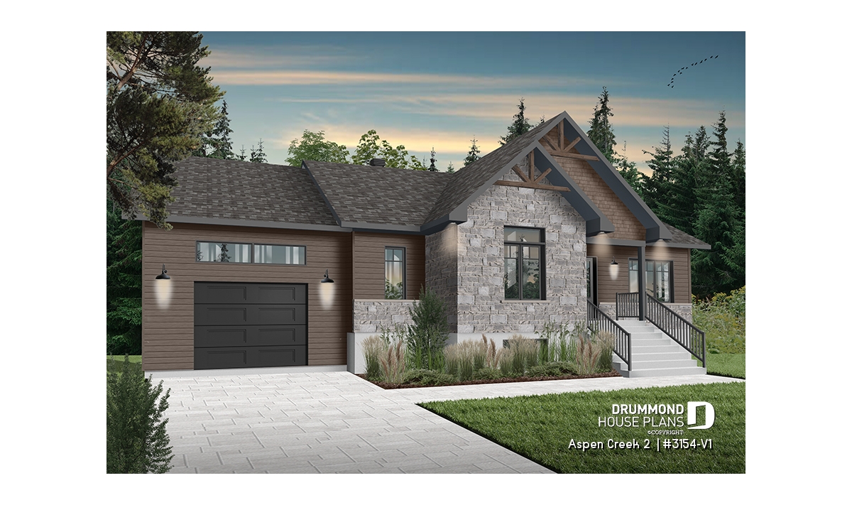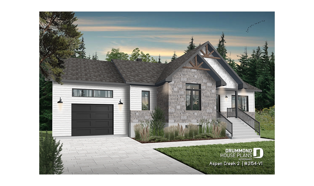 The following country-style 2-bedroom bungalow with garage plan, Aspen Creek 2 (3154-V1), offers us 1,344 square feet of living space, in which multiple stages of life can accommodate.