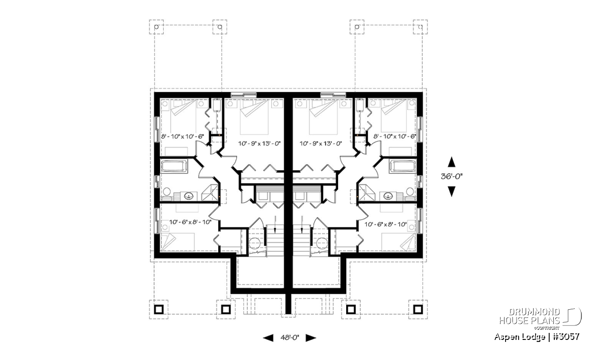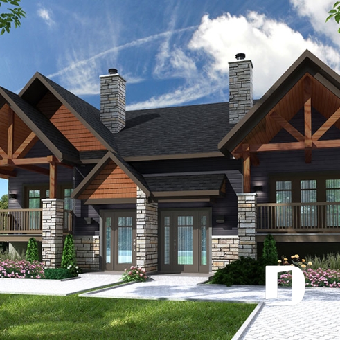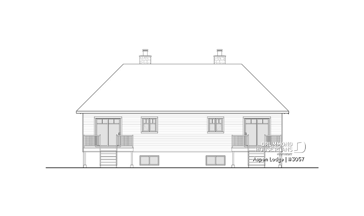 The element that first catches our attention is undoubtedly the magnificent front covered balconies, allowing the occupants to admire the outdoor view while sipping a cocktail or morning coffee, sheltered from the weather elements. This new duplex house plan no. 3057, also named Aspen Lodge by Drummond House Plans, proposes audacious floor plan layouts, especially with the location of its 3 bedrooms (per unit).
