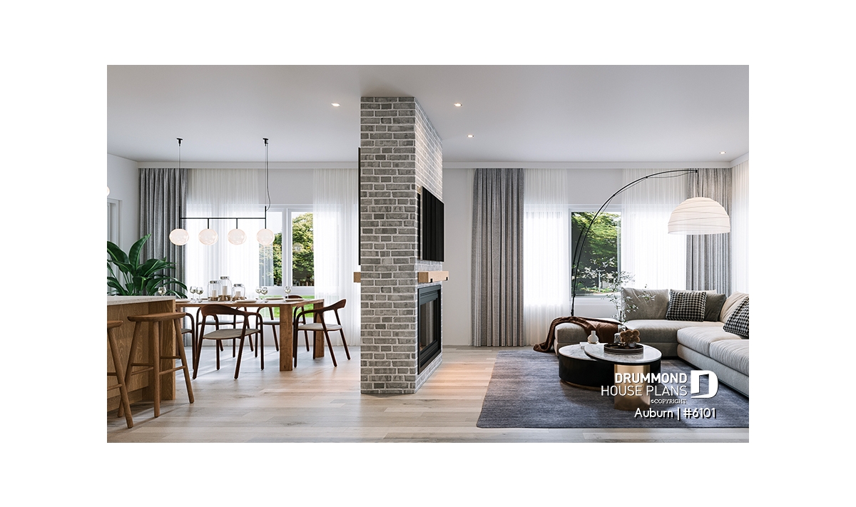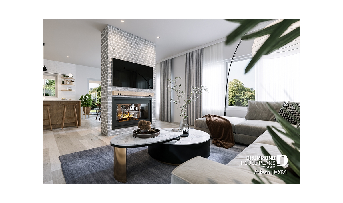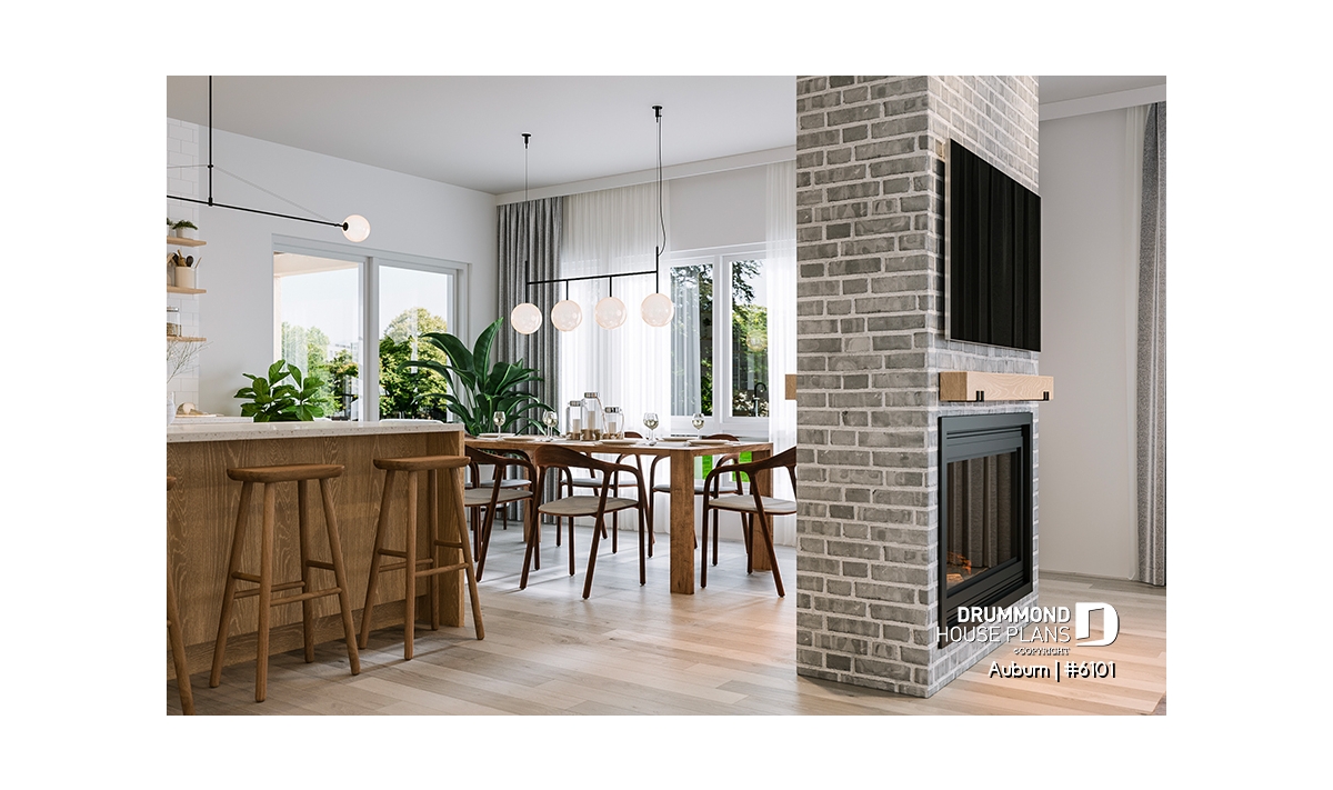 Central double-sided fireplace, adding warmth and ambiance to two rooms at once.