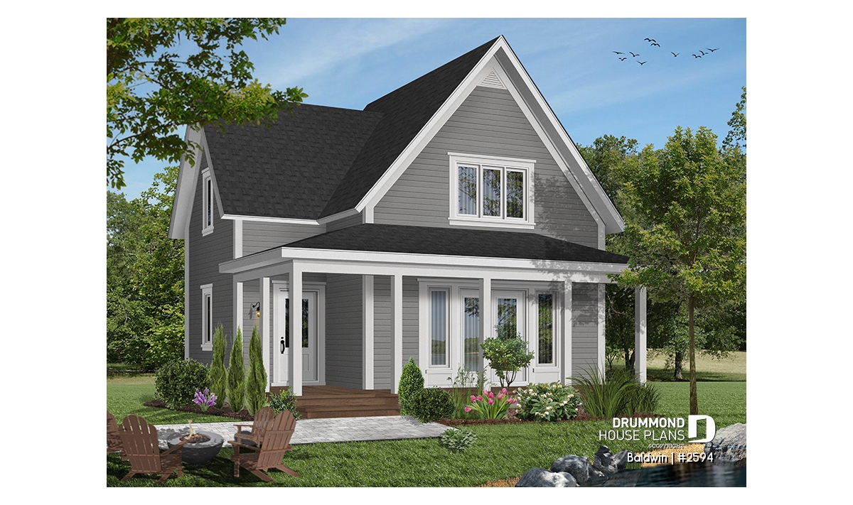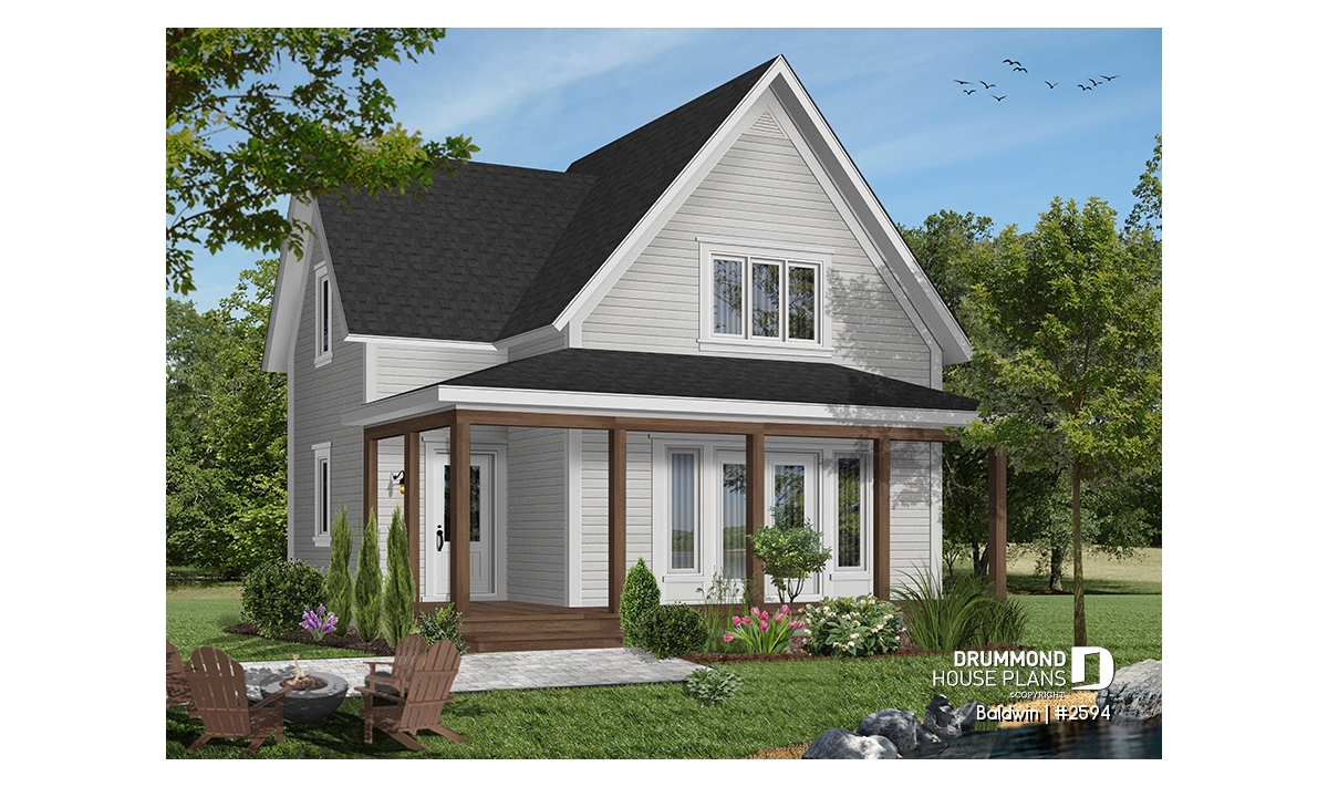 Wraparound covered porch, French doors at main and rear entrances, special ceiling treatments, sloped ceiling in both bedrooms.