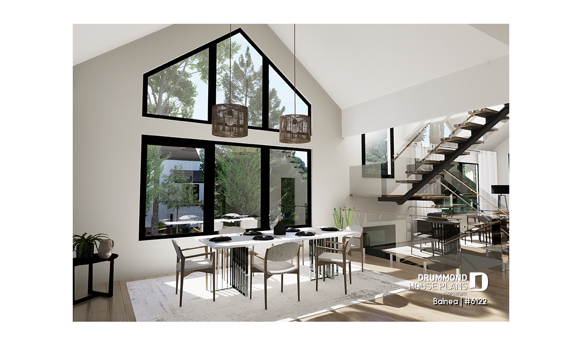 The spacious living room is enhanced by a 16' cathedral ceiling and an open atmosphere that flows into the dining room, which also features an impressive 18' cathedral ceiling. At the center of the living room, at the front of the house, stands a stunning fireplace, visible from both the dining room and the living room. The proposed STÛV s21 wood-burning fireplace becomes the true focal point of the home: its sleek design and high performance add warmth, Scandinavian ambiance, and timeless style, transforming every moment into a cozy, refined experience.