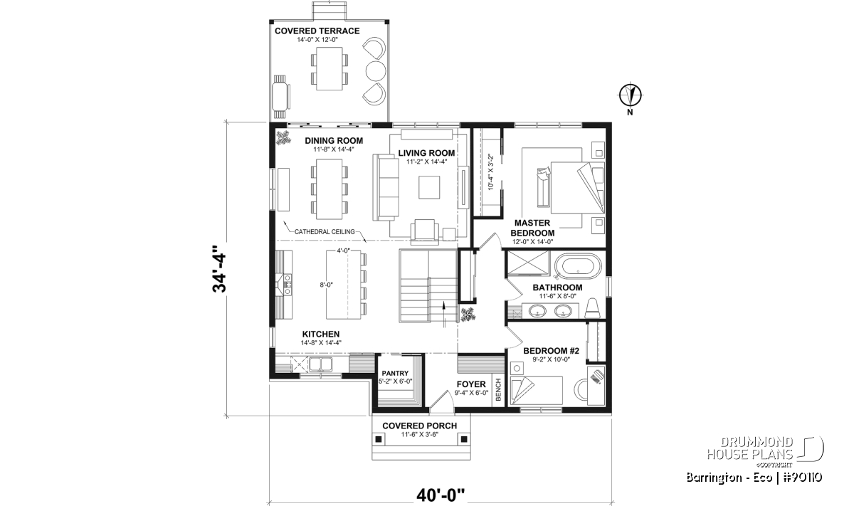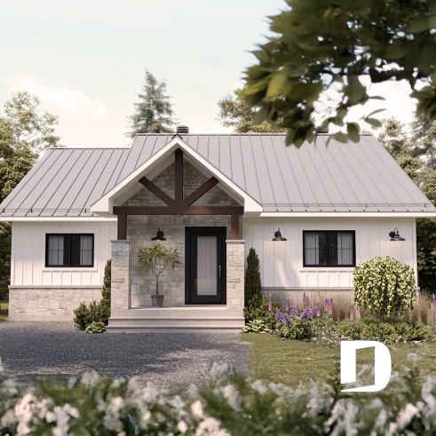Particularly designed for a south backyard orientation, this tiny home has the striking features of the original plan all the while offering new, more optimal and eco-friendly ideas. First of all, on the right side of the house, to the west, we find the more private rooms such as the master bedroom, the full bathroom and 2nd bedroom. To the east of the house, on the other side of the central staircase, you find the kitchen with its walk-in pantry and its large island, the dining room and the living room. The kitchen, the dining room and living room have a cathedral ceiling.