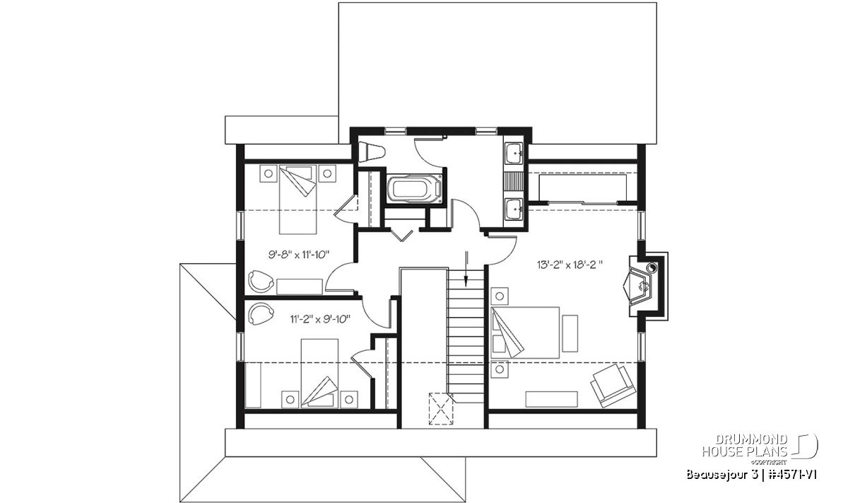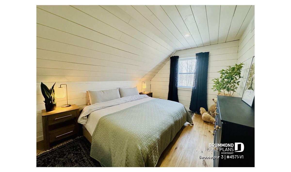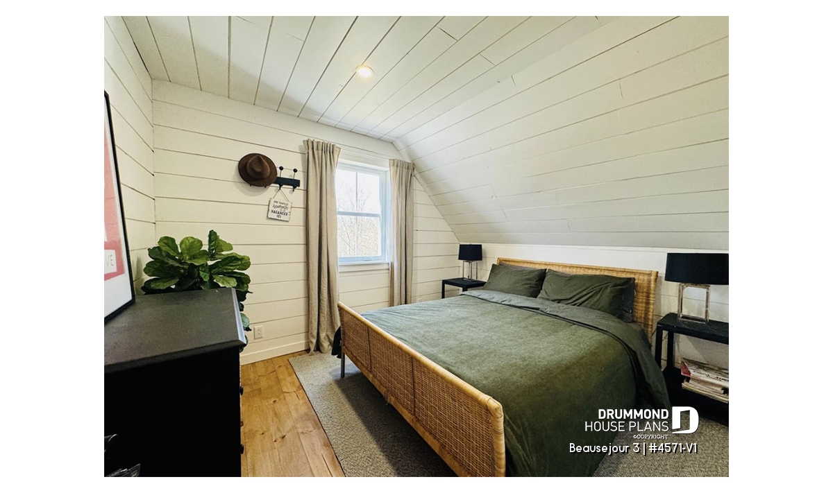 Upstairs and next to the family bathroom, the good size master bedroom (13'2 '' x 18 ') has a fireplace, a sloped ceiling and a large walk-in closet. The family bathroom offers a double vanity and an attached linen storage space. The toilet and the shower bath are separated from the two sinks allowing a better circulation in this room. Two secondary bedrooms with closet complete this magnificent new country house plan, Beausejour or plan # 4571-V1.