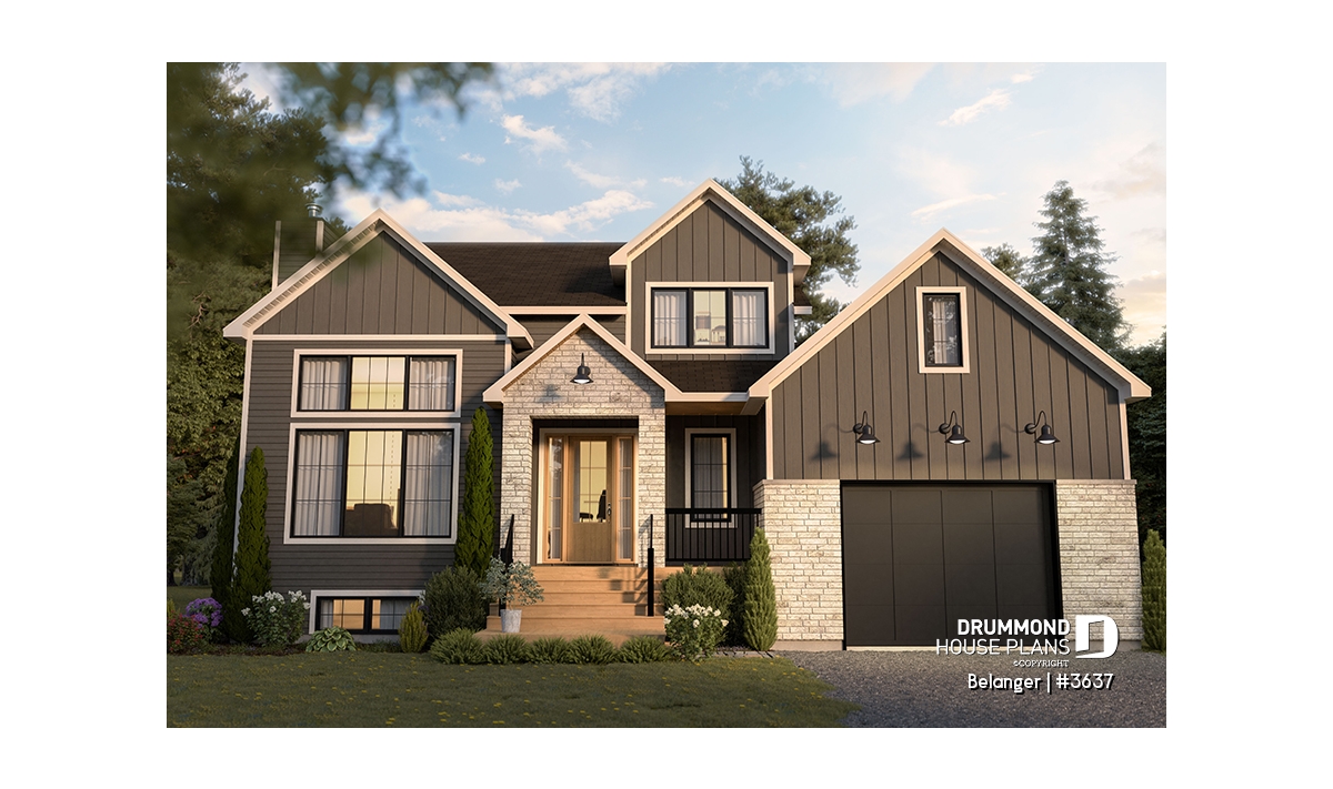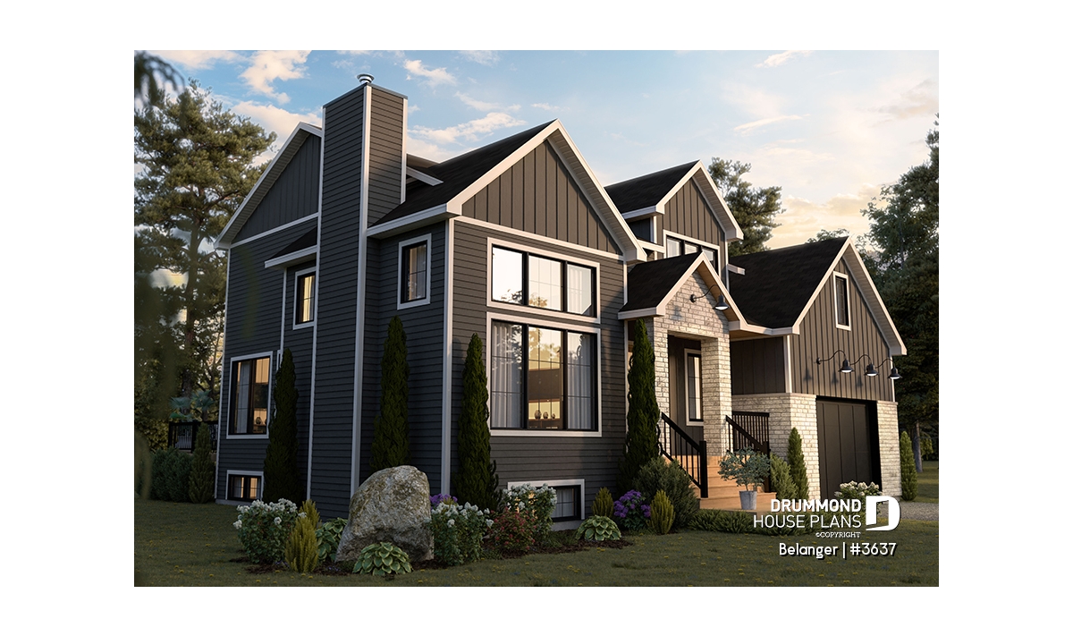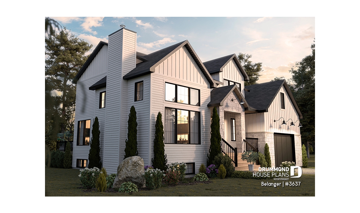 Finished basement (Optional $) - Modern farmhouse plan with 2 to 4 bedrooms, garage, great living room with fireplace, cathedral and built-ins - Belanger