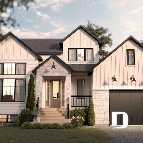 front - BASE MODEL - Modern farmhouse plan with 2 to 4 bedrooms, garage, great living room with fireplace, cathedral and built-ins - Belanger