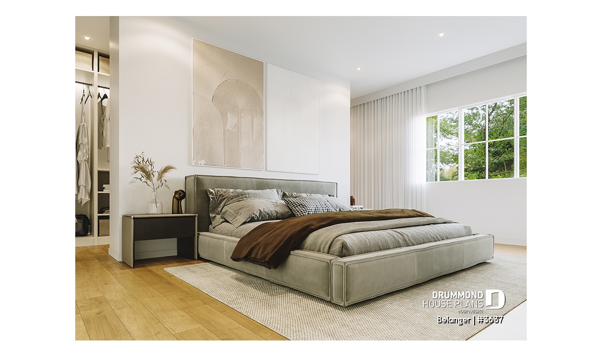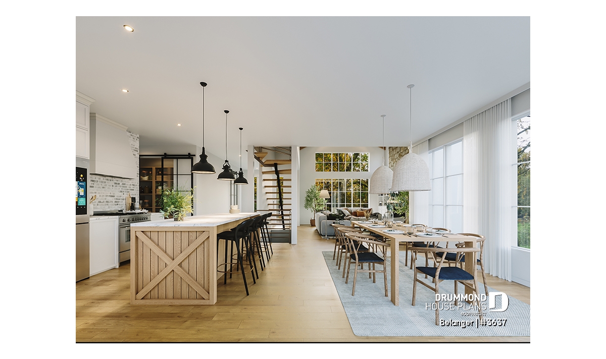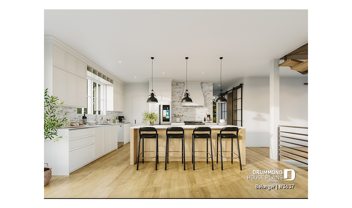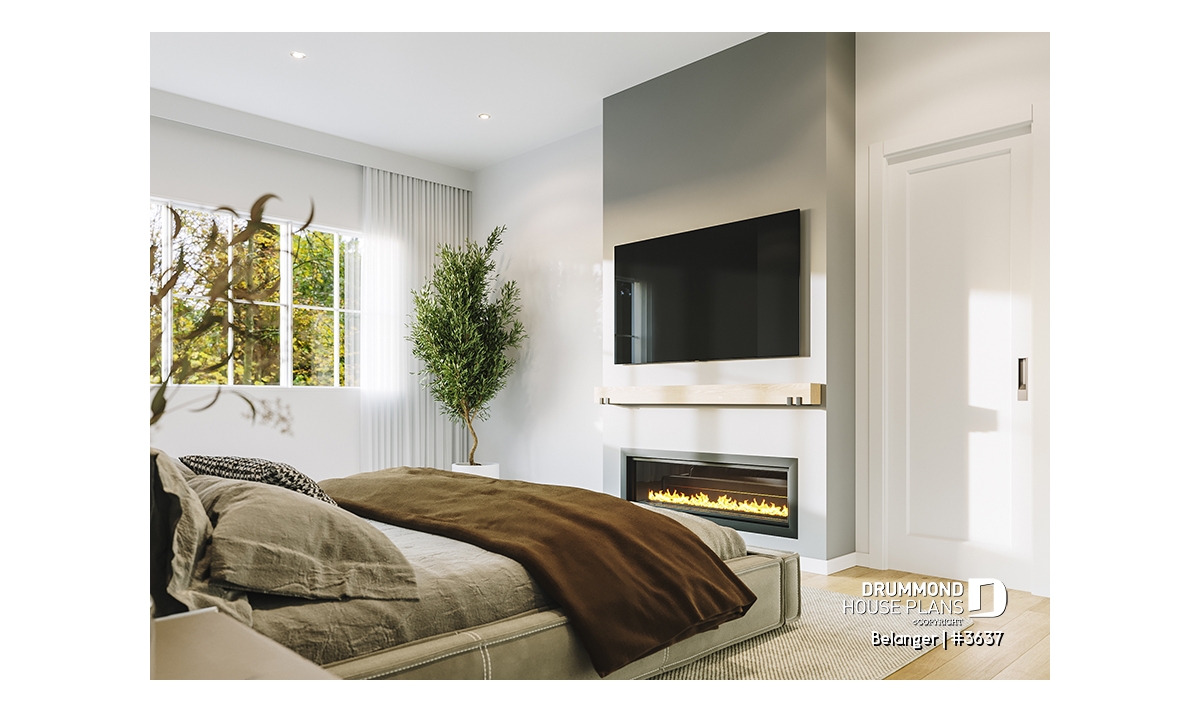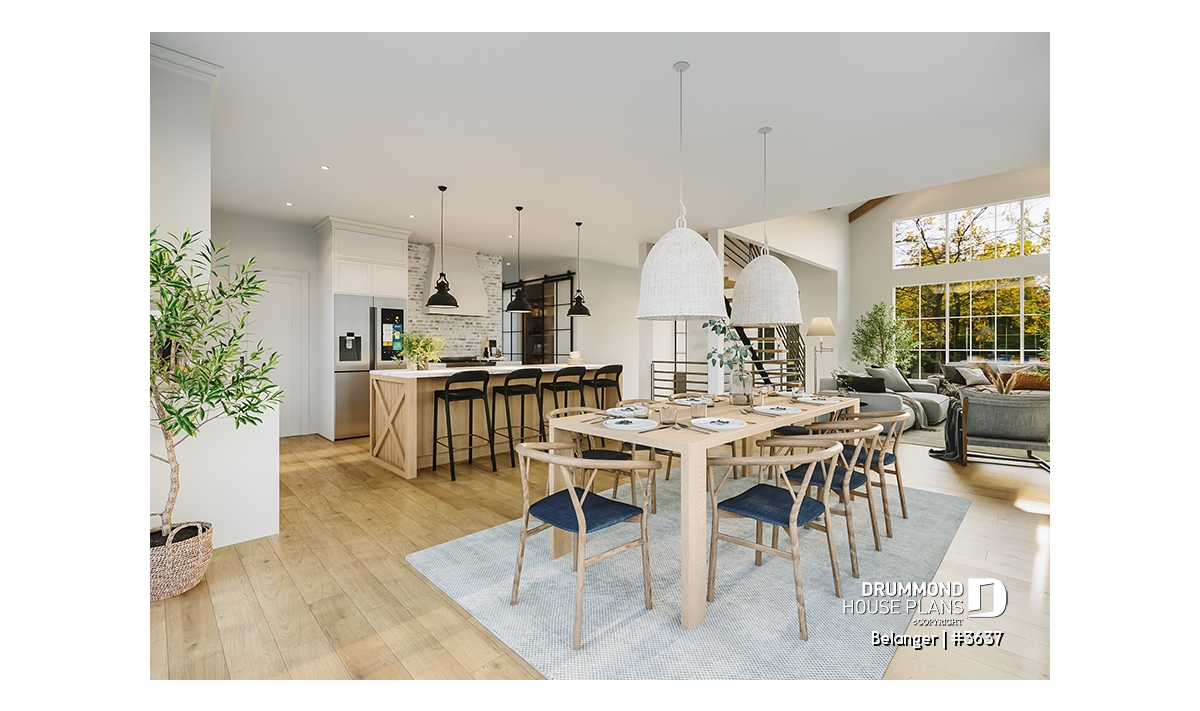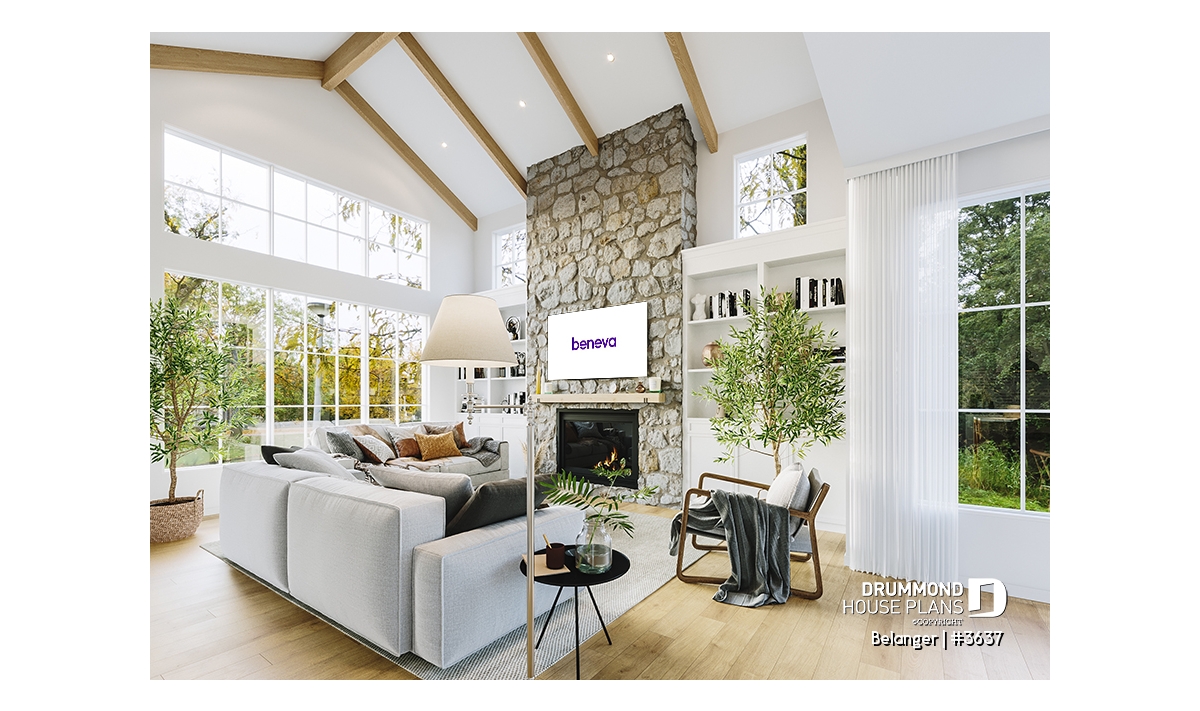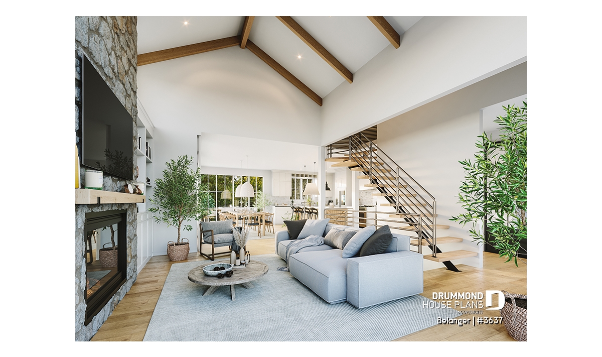 2nd level - Modern farmhouse plan with 2 to 4 bedrooms, garage, great living room with fireplace, cathedral and built-ins - Belanger