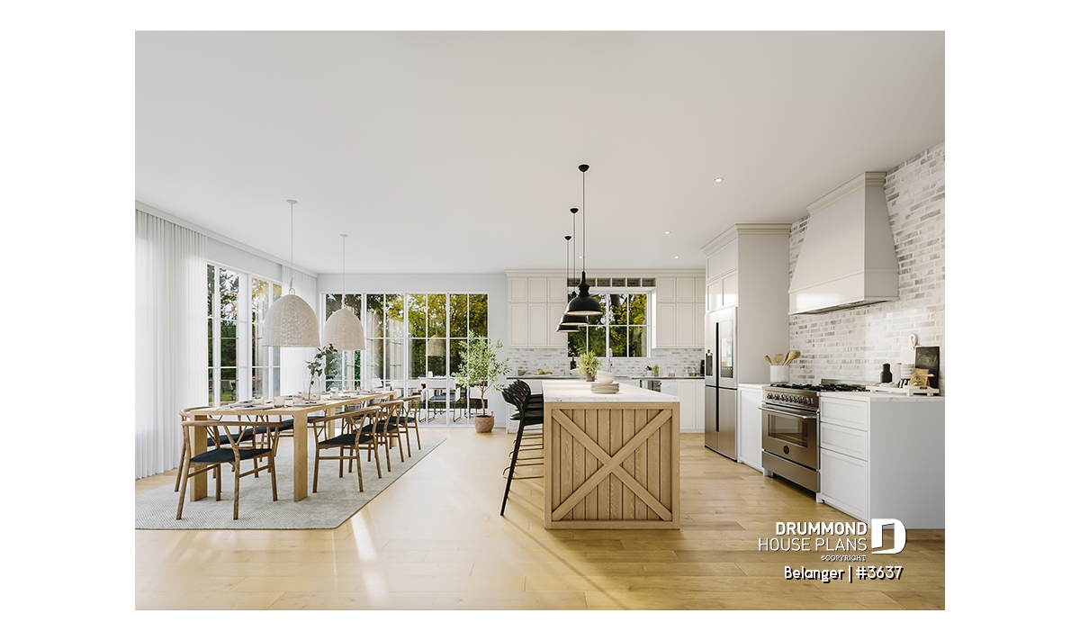 The stunning and spacious BELANGER house plan (#3637) offers 3,012 sq.ft. of living space, plus a garage and a large partially covered rear terrace. Notably, all ceilings on the main floor are 9 feet high, except for the living room, which features a dramatic cathedral ceiling soaring to 17 feet!