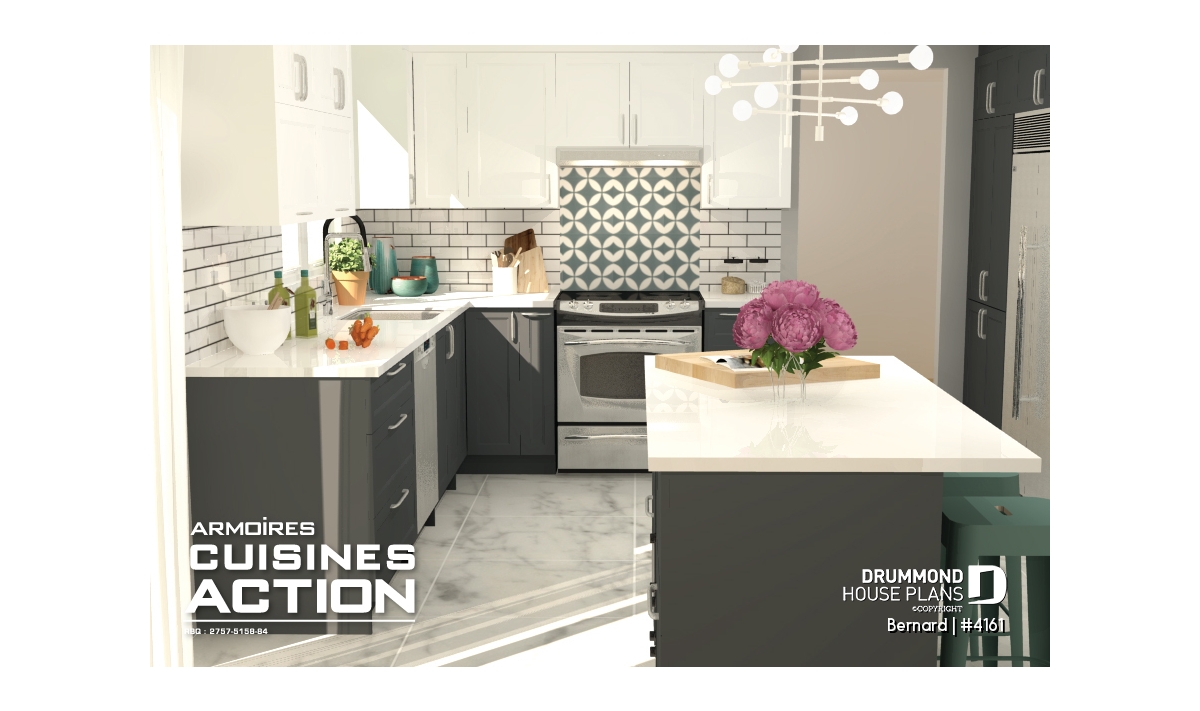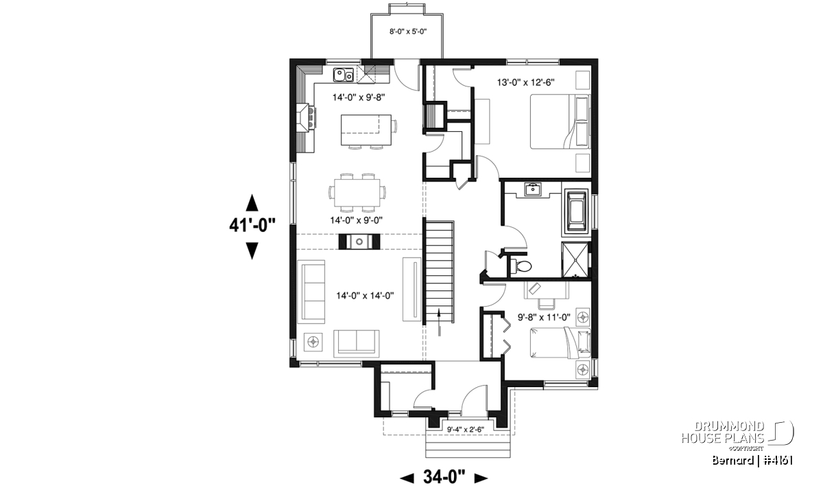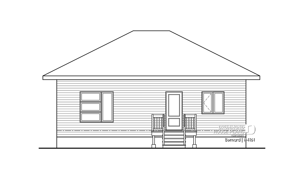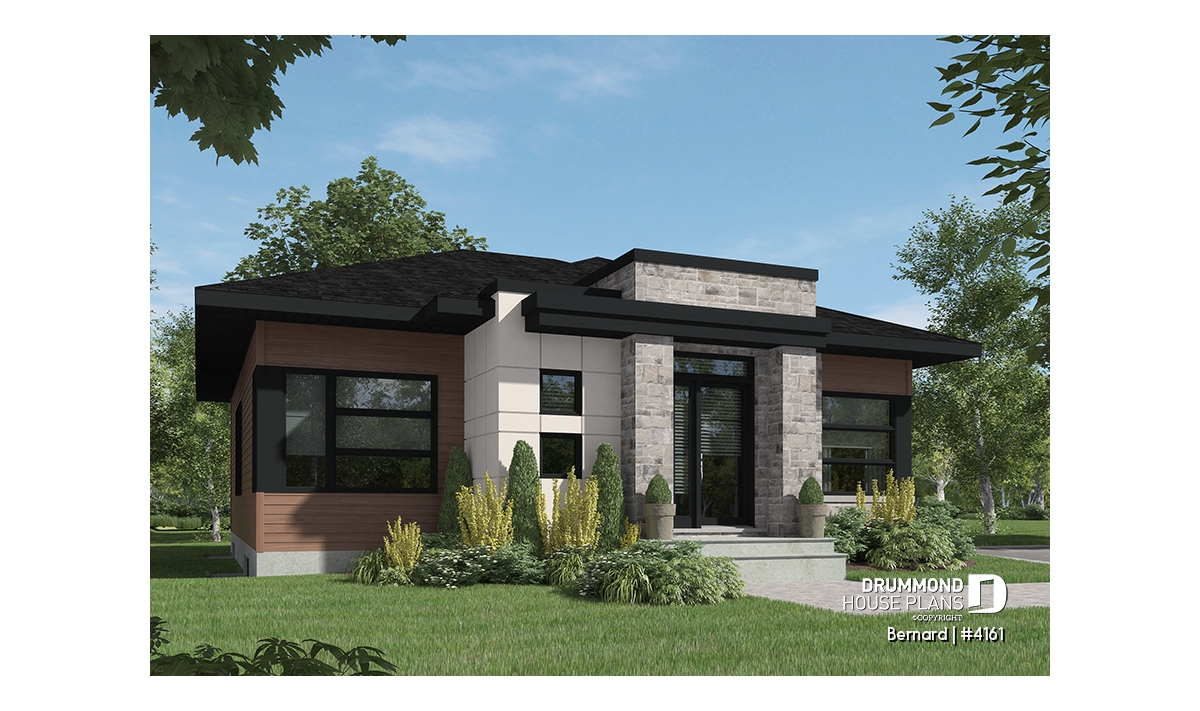 This modern home design, our plan #4161 is a new Drummond House Plan conception that offers many commodities that you will surely appreciate. For starters, the good sized entrance has a very practical walk-in style closet. You will also notice that the bedrooms are separated by a wall that allows for less noise even if there are ongoing activities in the living room, great for a good night sleep!