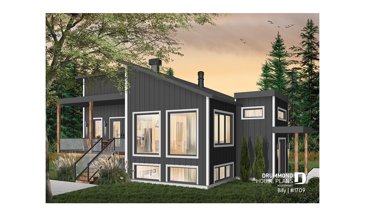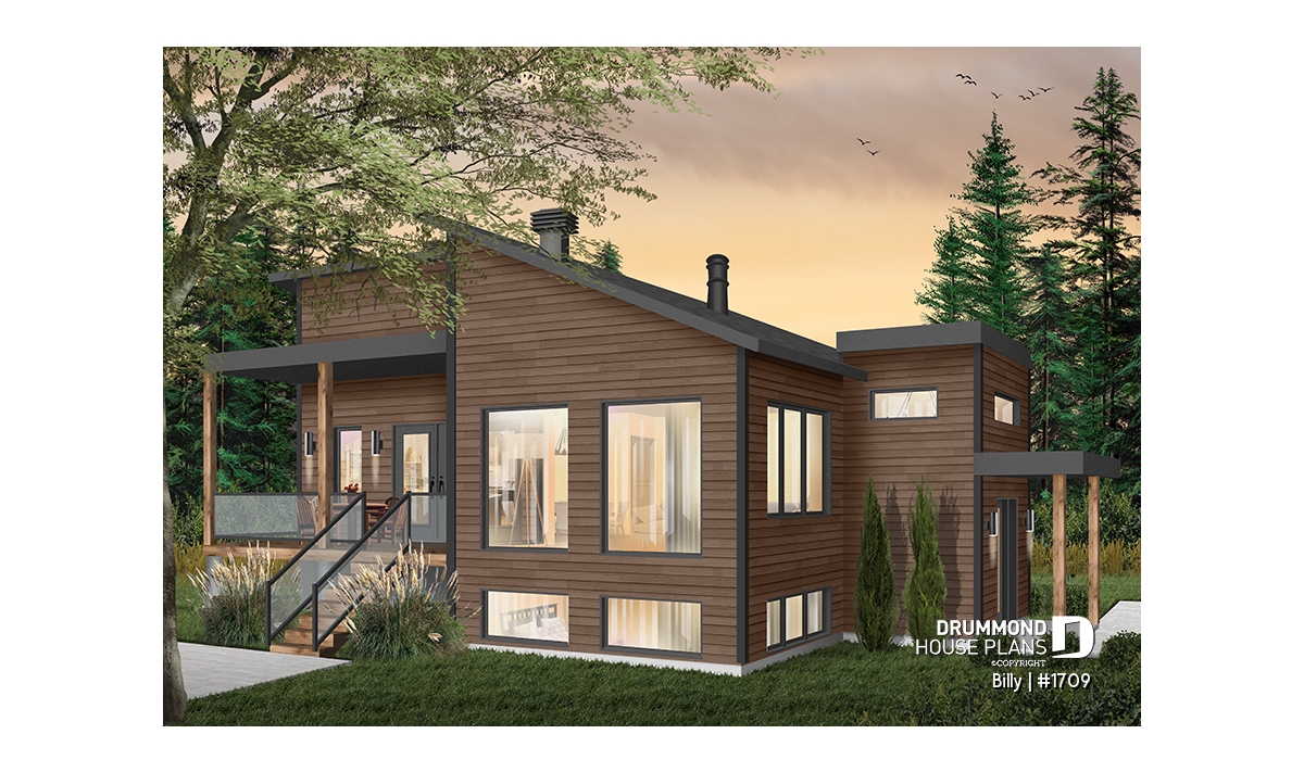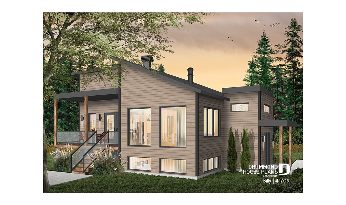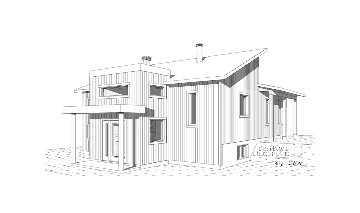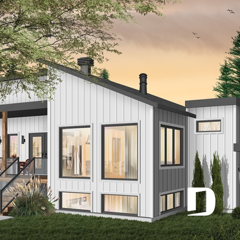 Of Scandinavian spirit, this modern home was designed for a corner or angled lot of a panoramic view. At the entrance, there is a large closet and direct access to the basement and main floor. With its numerous windows, the open floor concept allows for a spectacular view regardless of your location in the house. A spacious kitchen with a large pantry and also has a triple door access to a covered terrace located on the left side of the house. The master suite is separated from the bathroom by a walk-in where there is the washer / dryer. A wood stove was placed in the main living area, allowing us to imagine that the ideal location for this house may be in the countryside. Ideal for a couple without children or with small children. The basement has been designed to accommodate other rooms should the need arise.
