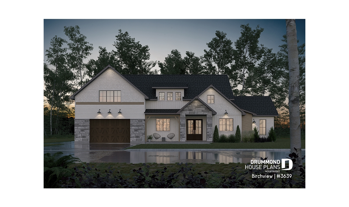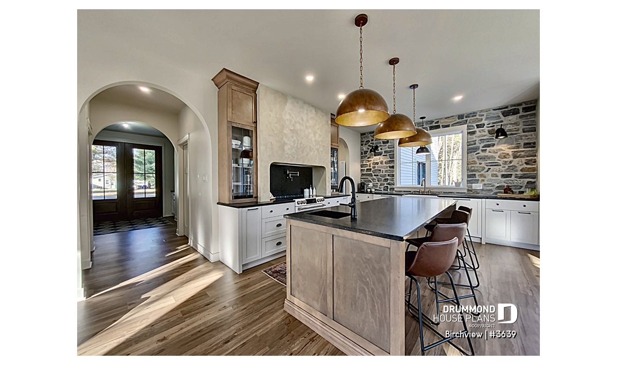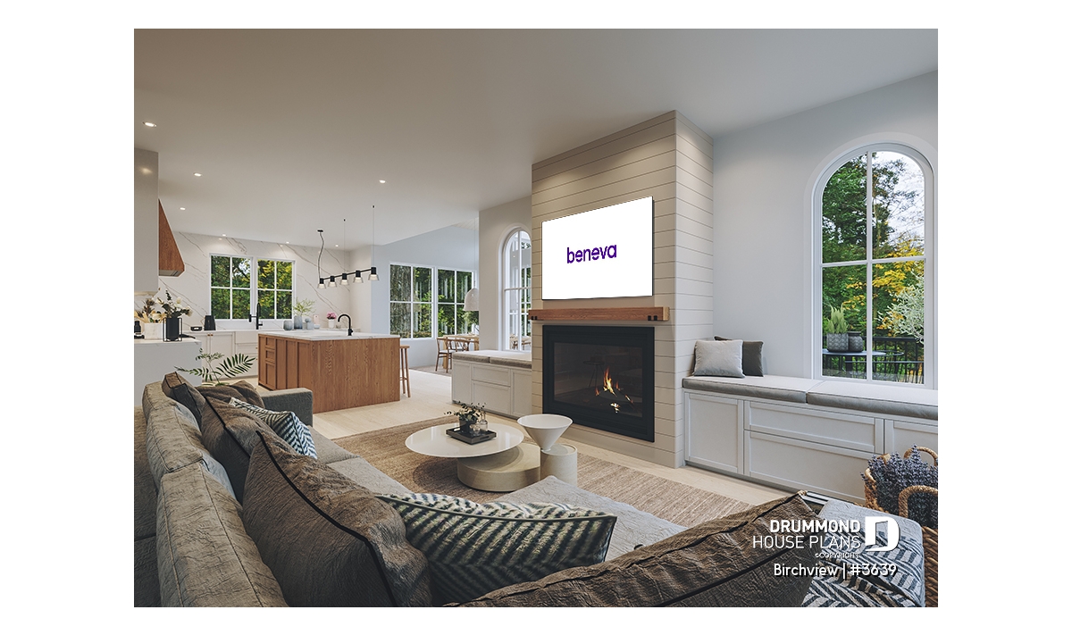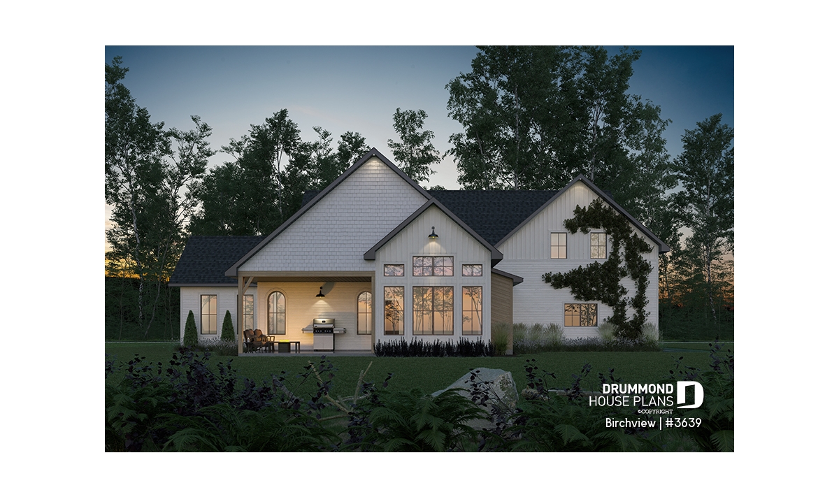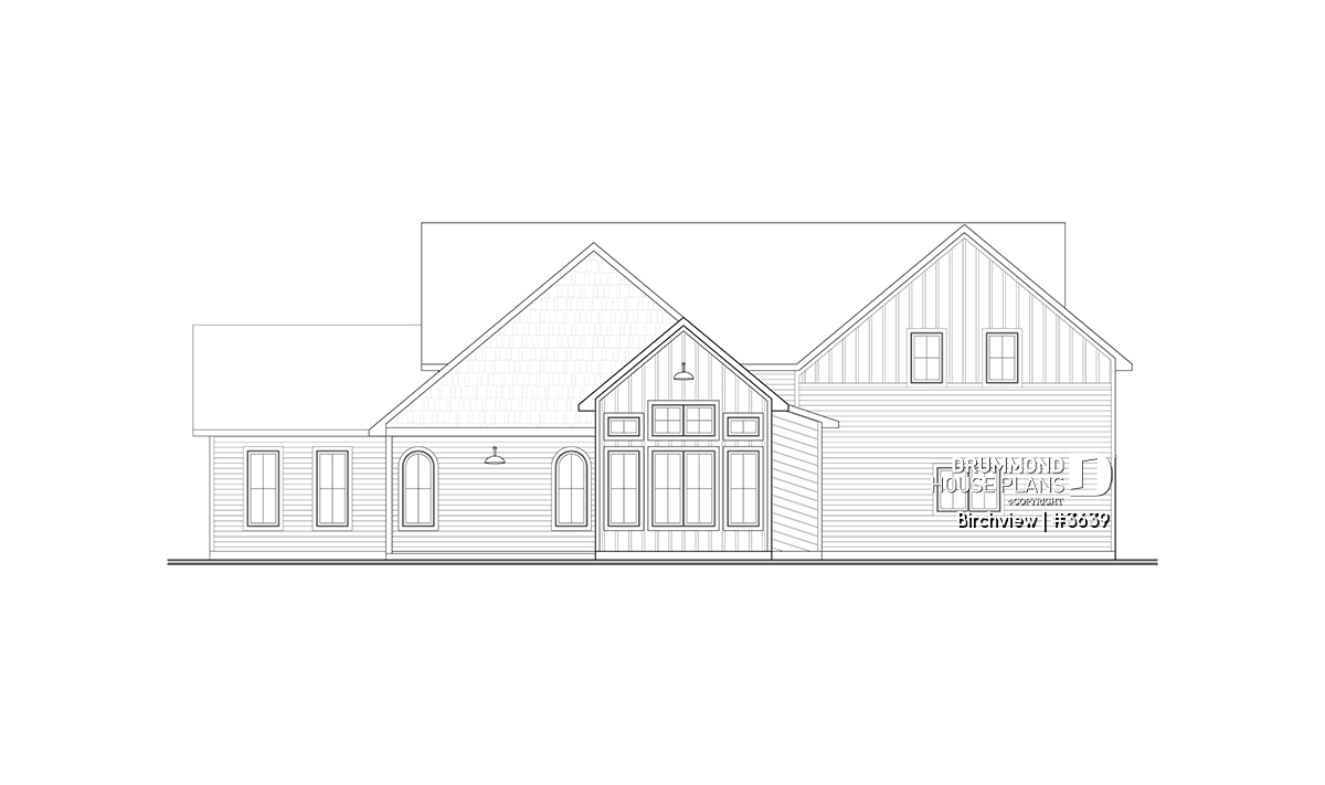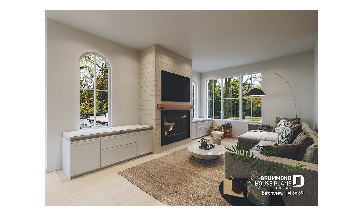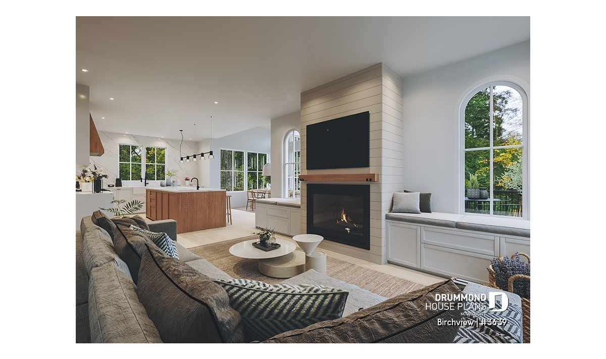 The BIRCHVIEW house plan, inspired by French country architecture, charms with its timeless appeal and refined architectural details. Elegant arches connect the living spaces, adding a unique touch of sophistication. In the living room, two beautiful arched windows frame the fireplace, creating a warm and inviting focal point. For outdoor living, the covered front porch and rear terrace provide welcoming spaces to enjoy every season.