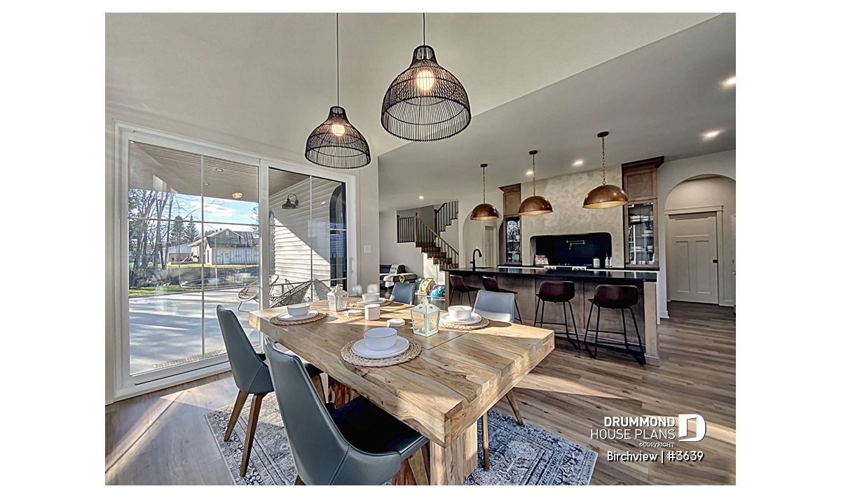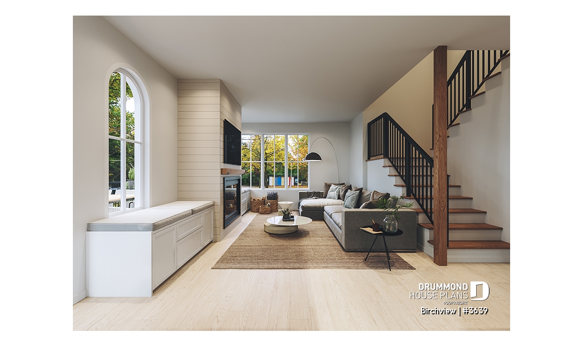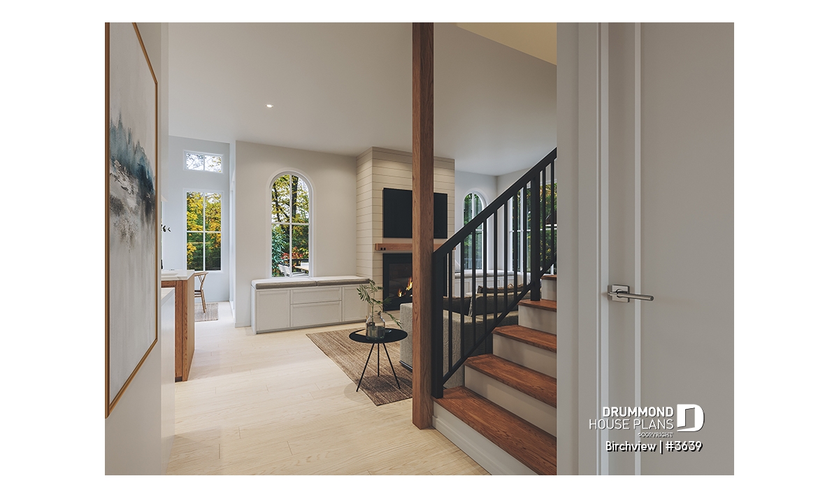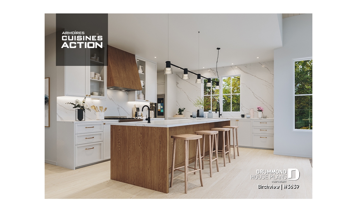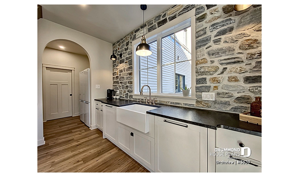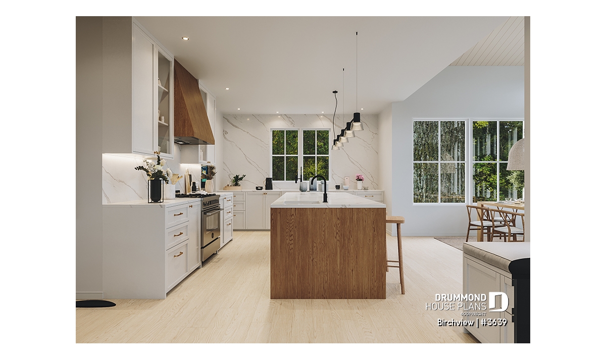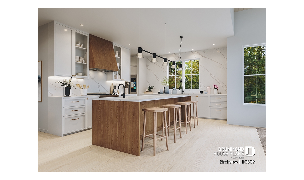 The BIRCHVIEW house plan, inspired by French country architecture, charms with its timeless appeal and refined architectural details. Elegant arches connect the living spaces, adding a unique touch of sophistication. In the living room, two beautiful arched windows frame the fireplace, creating a warm and inviting focal point. For outdoor living, the covered front porch and rear terrace provide welcoming spaces to enjoy every season.