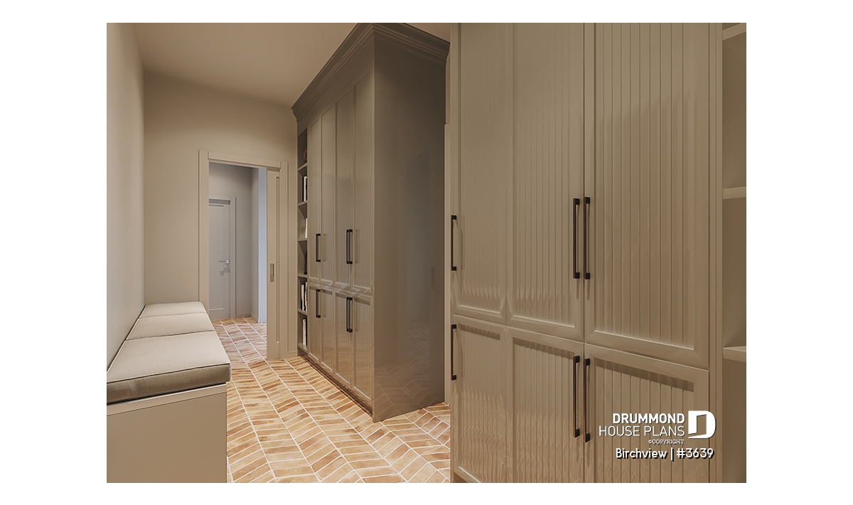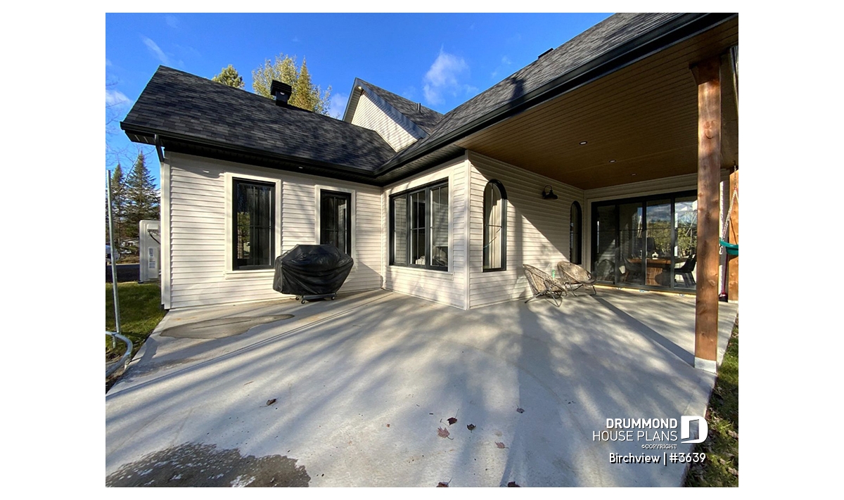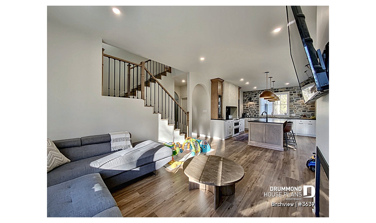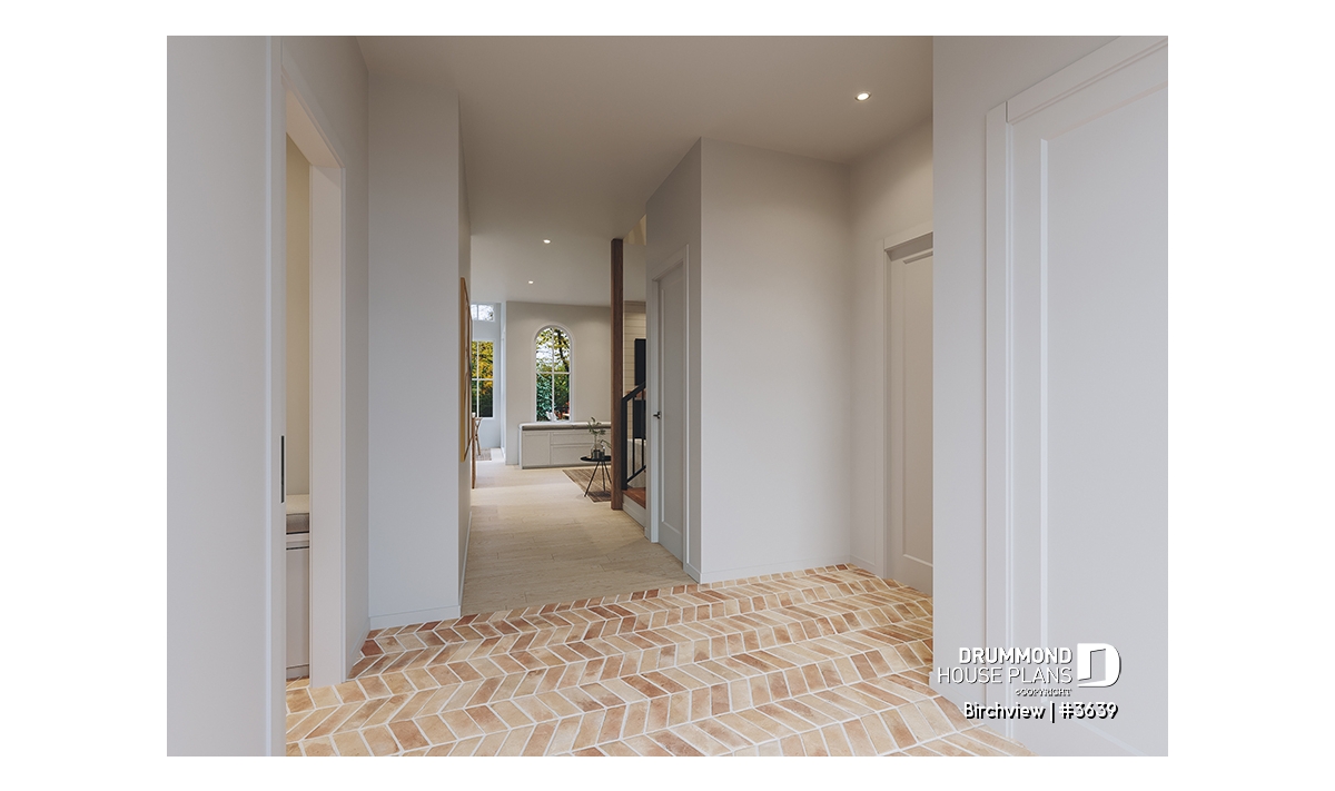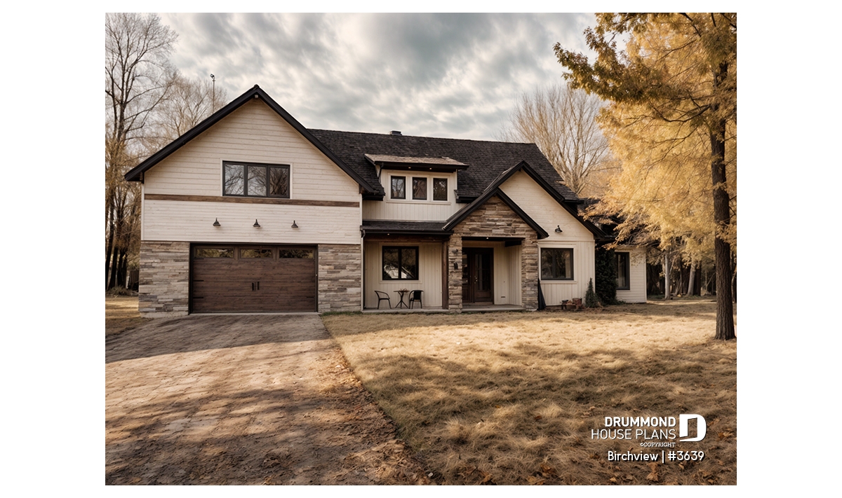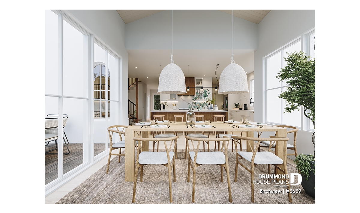 The BIRCHVIEW house plan, inspired by French country architecture, charms with its timeless appeal and refined architectural details. Elegant arches connect the living spaces, adding a unique touch of sophistication. In the living room, two beautiful arched windows frame the fireplace, creating a warm and inviting focal point. For outdoor living, the covered front porch and rear terrace provide welcoming spaces to enjoy every season.