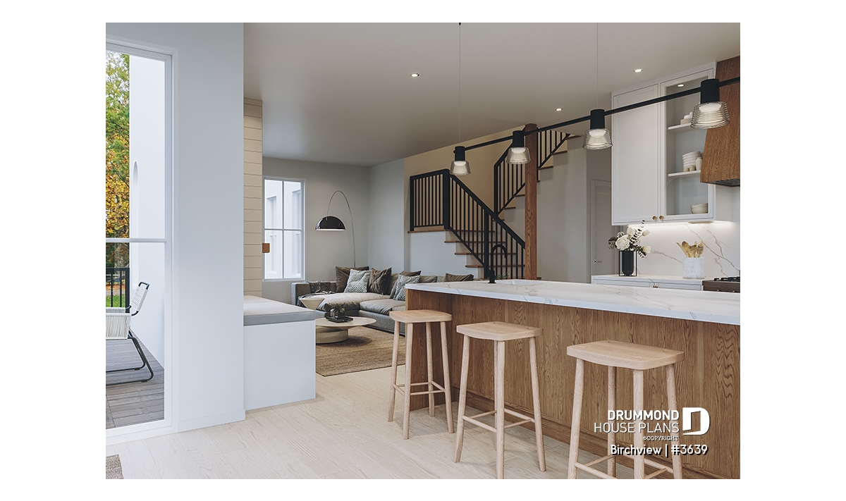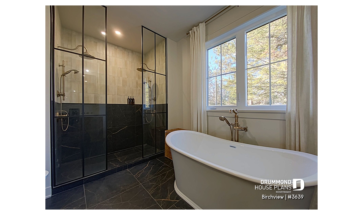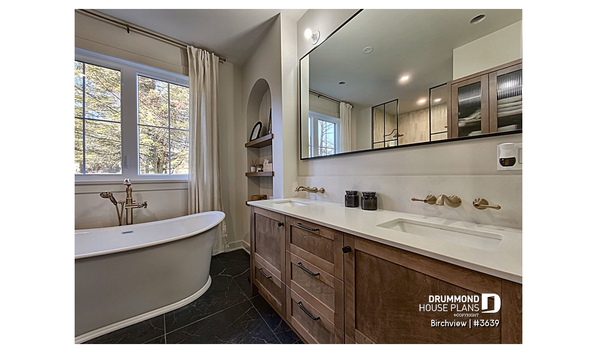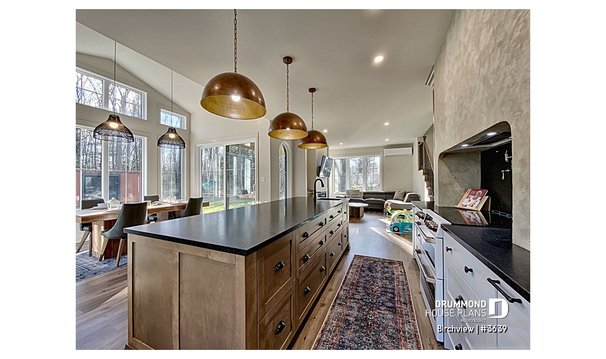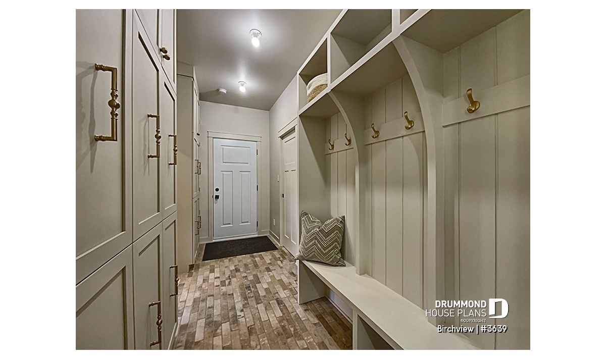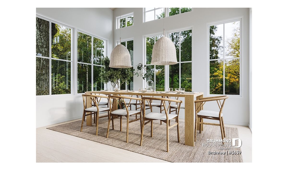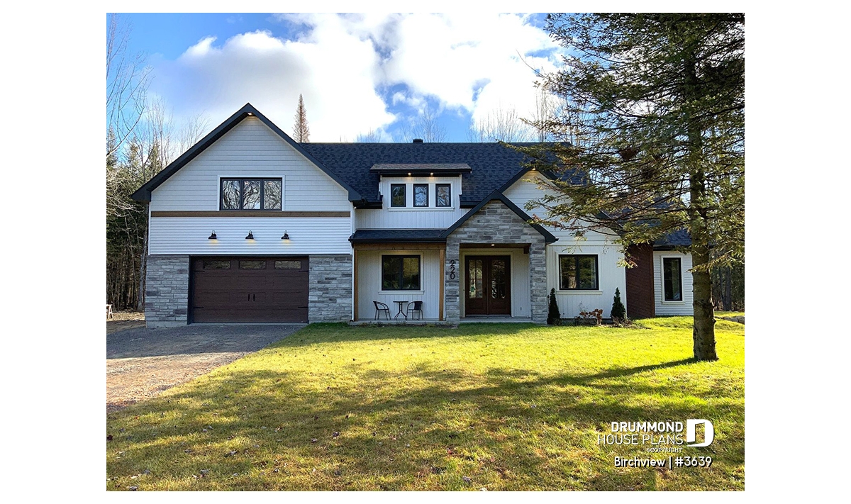 The BIRCHVIEW house plan, inspired by French country architecture, charms with its timeless appeal and refined architectural details. Elegant arches connect the living spaces, adding a unique touch of sophistication. In the living room, two beautiful arched windows frame the fireplace, creating a warm and inviting focal point. For outdoor living, the covered front porch and rear terrace provide welcoming spaces to enjoy every season.