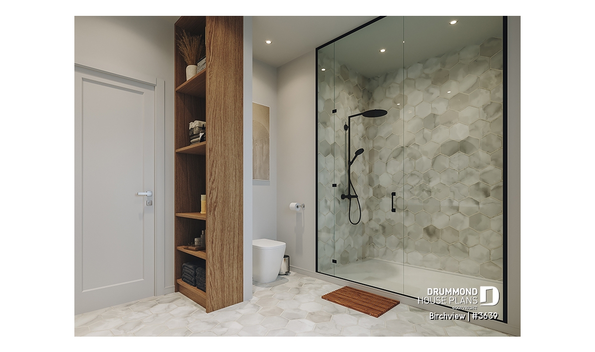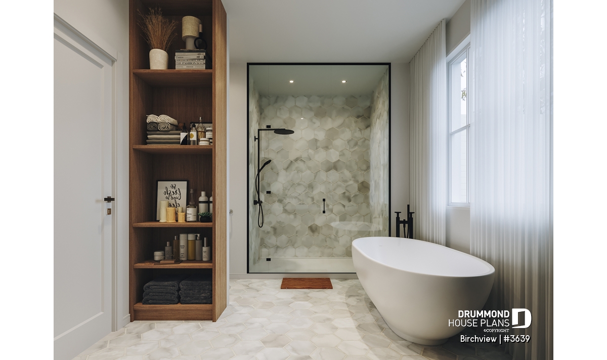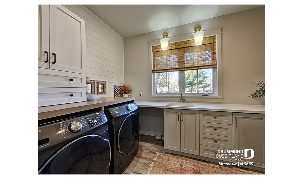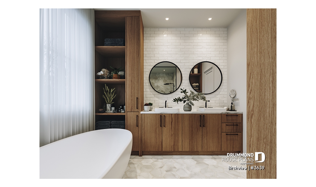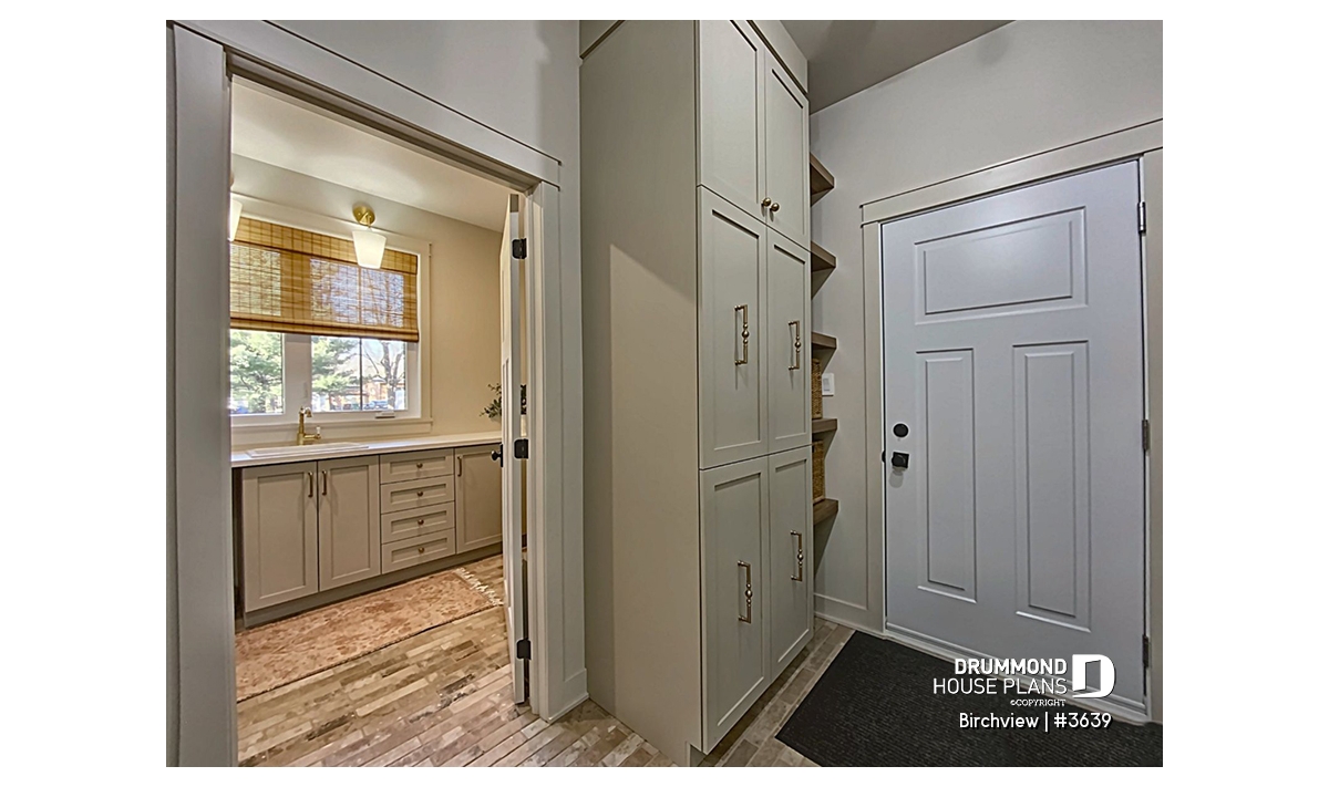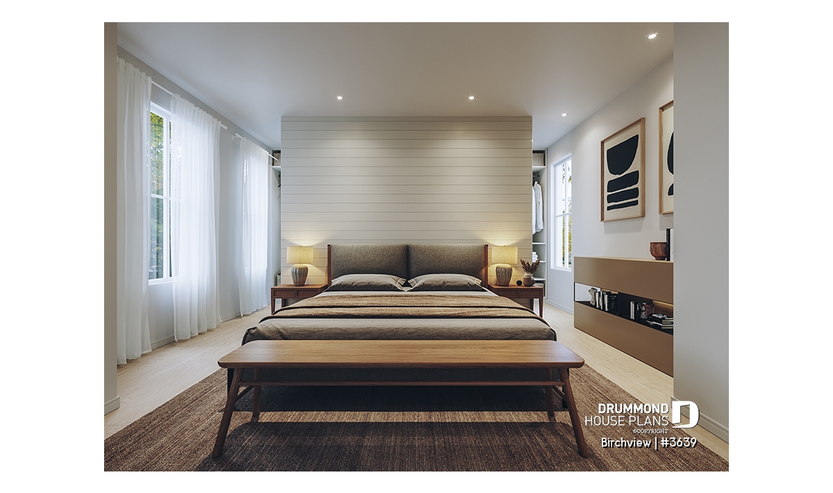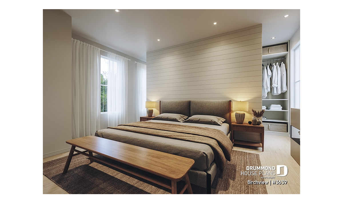 The BIRCHVIEW house plan, inspired by French country architecture, charms with its timeless appeal and refined architectural details. Elegant arches connect the living spaces, adding a unique touch of sophistication. In the living room, two beautiful arched windows frame the fireplace, creating a warm and inviting focal point. For outdoor living, the covered front porch and rear terrace provide welcoming spaces to enjoy every season.