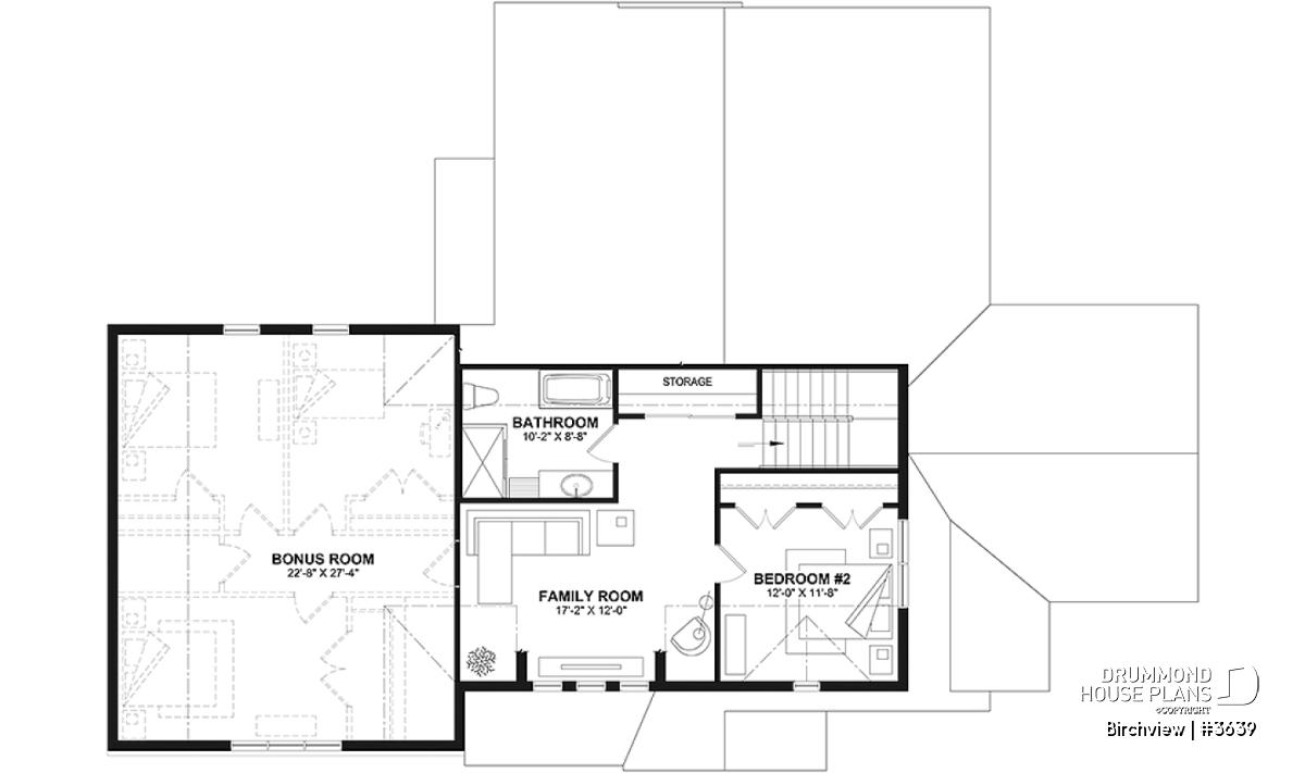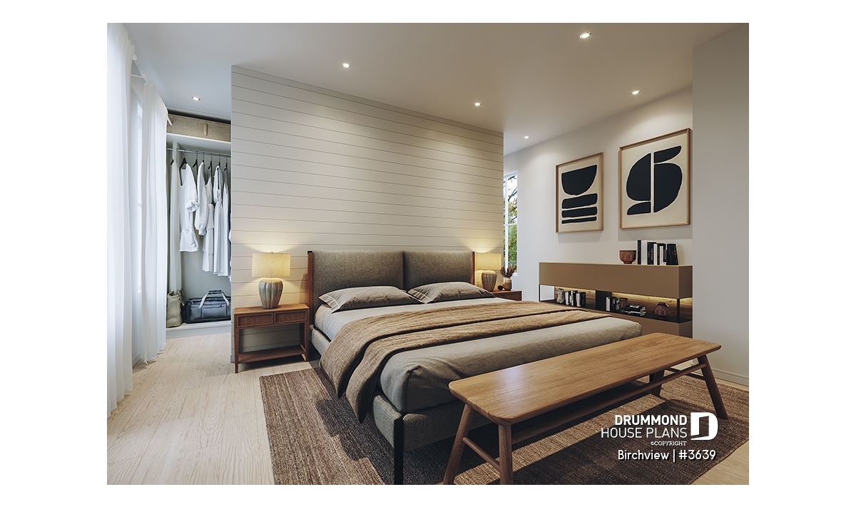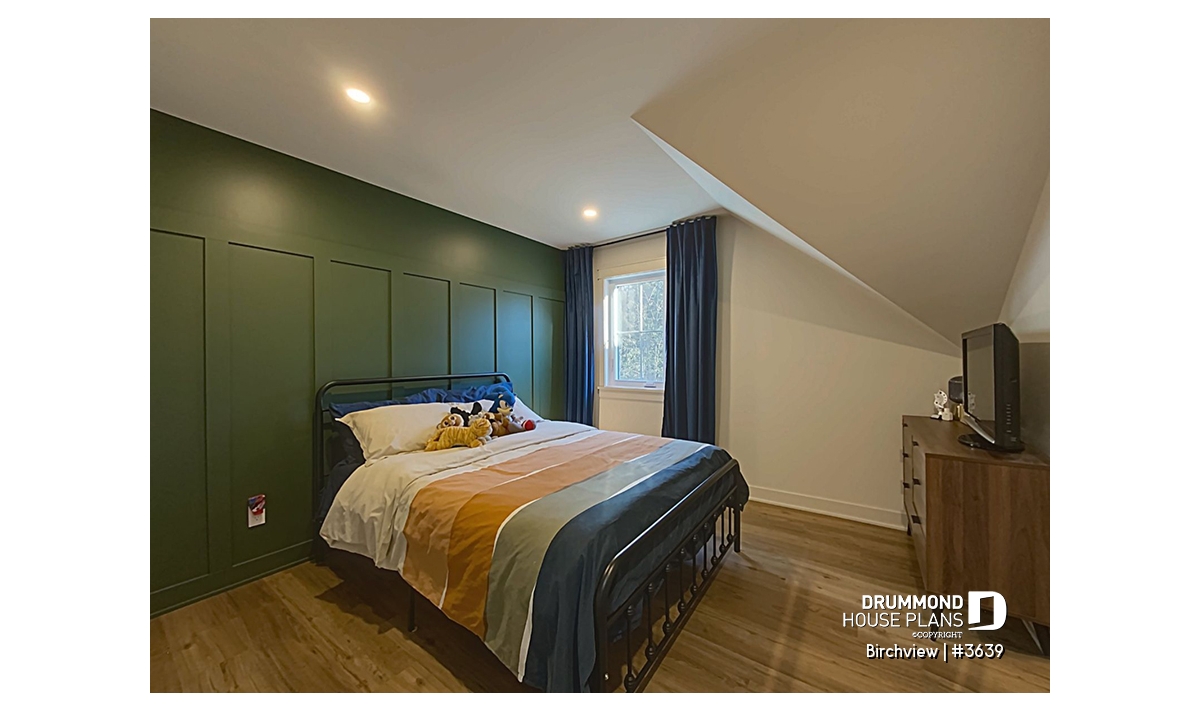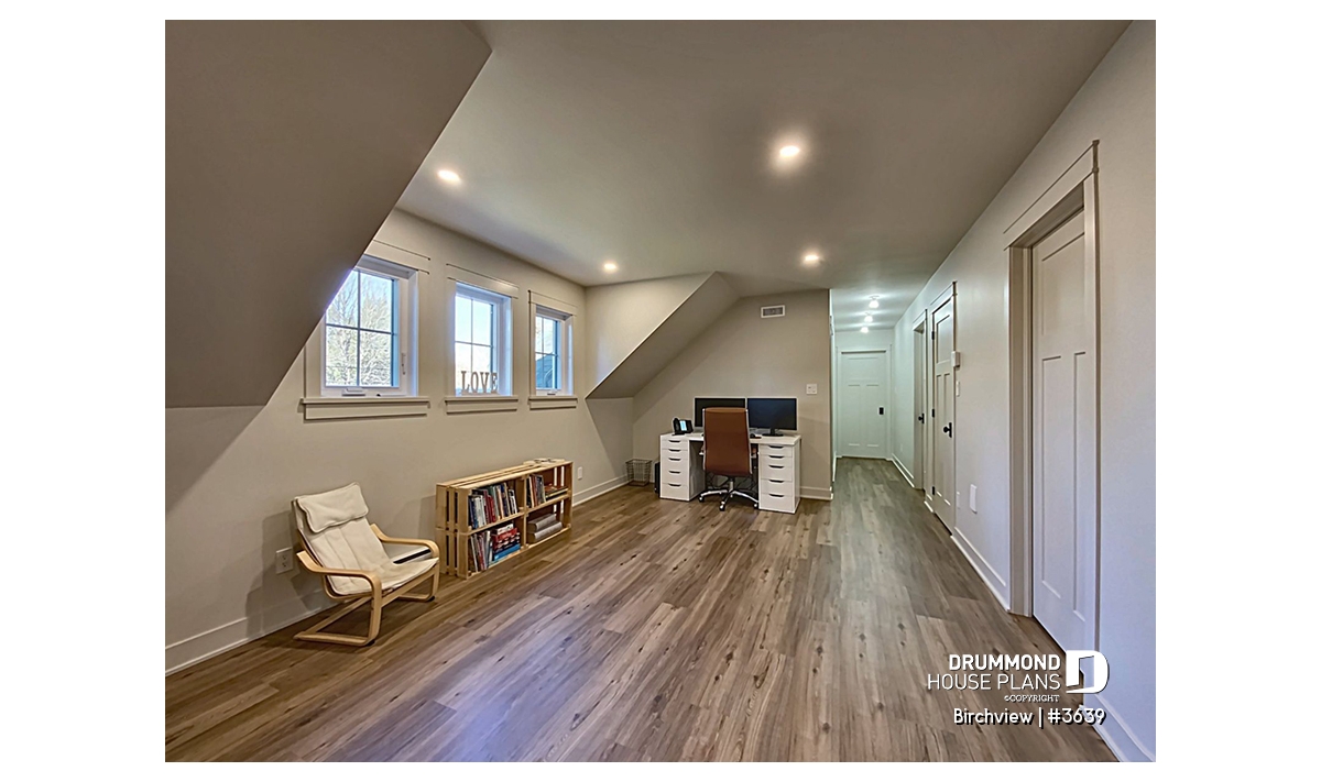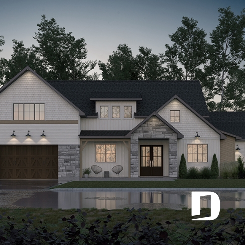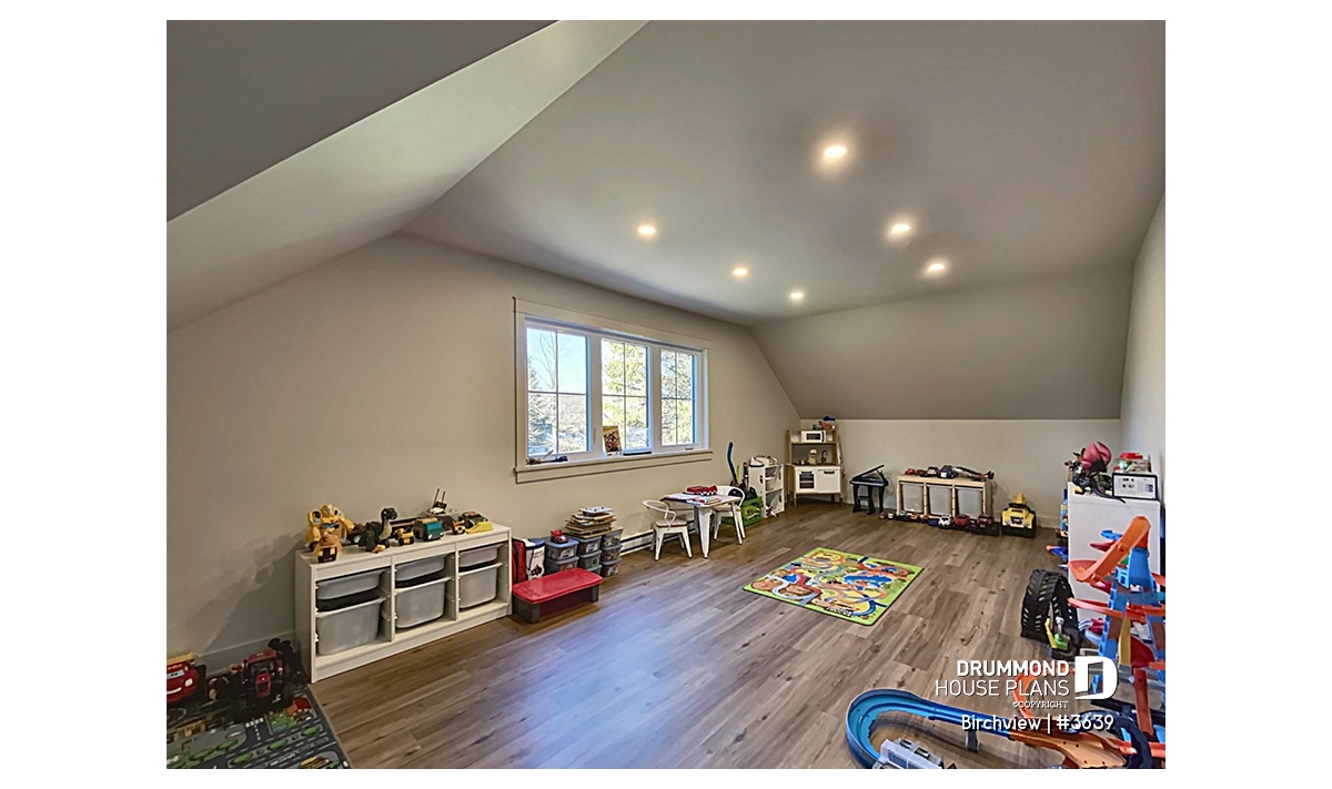 Upstairs, you’ll find a secondary bedroom, a full bathroom, a family room, and additional storage space. A large bonus room offers versatile possibilities—it can be transformed into up to three extra bedrooms, a home office, or a playroom for the kids. The single-car garage, spacious and practical, includes room for lawn equipment, a workbench, and a mechanical area. This model comes standard with a slab-on-grade foundation, with other options available to suit your lot and personal preferences.