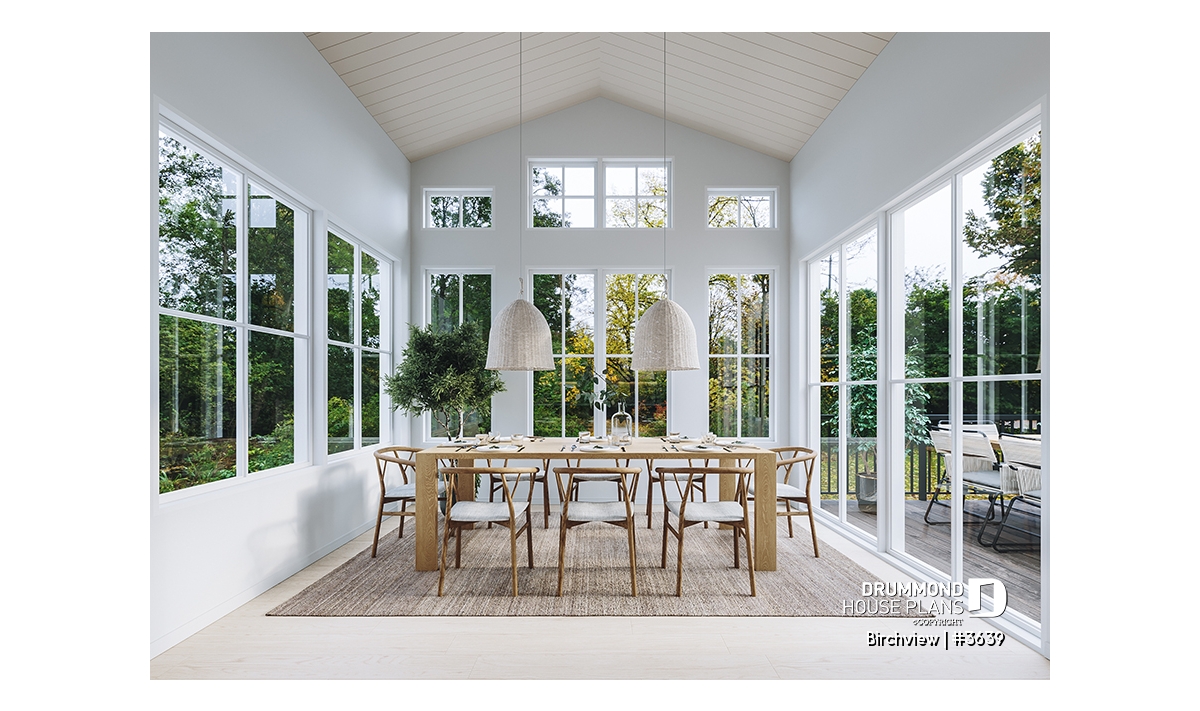 The dining room offers a cathedral ceiling and receives plenty of natural light due to the abundant windows there.