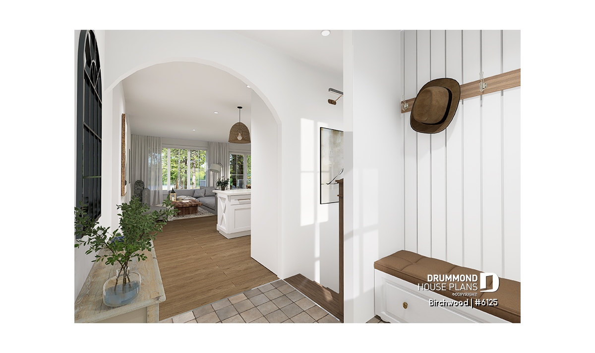 Architectural arch between the entrance and the kitchen, as well as between the shower room and the laundry room in the basement.
