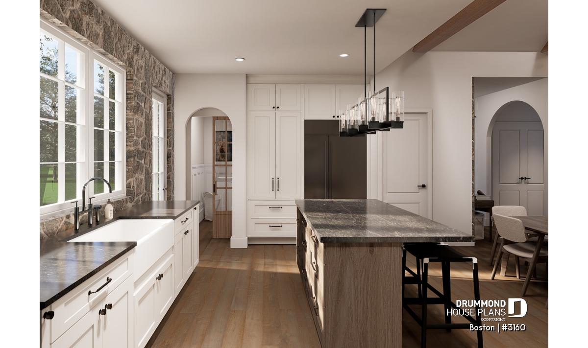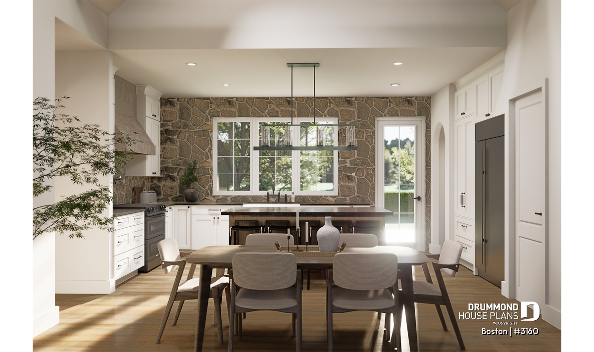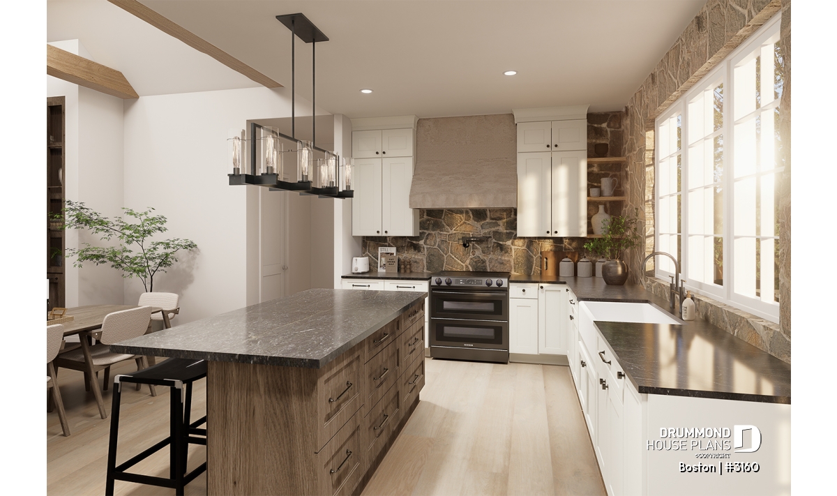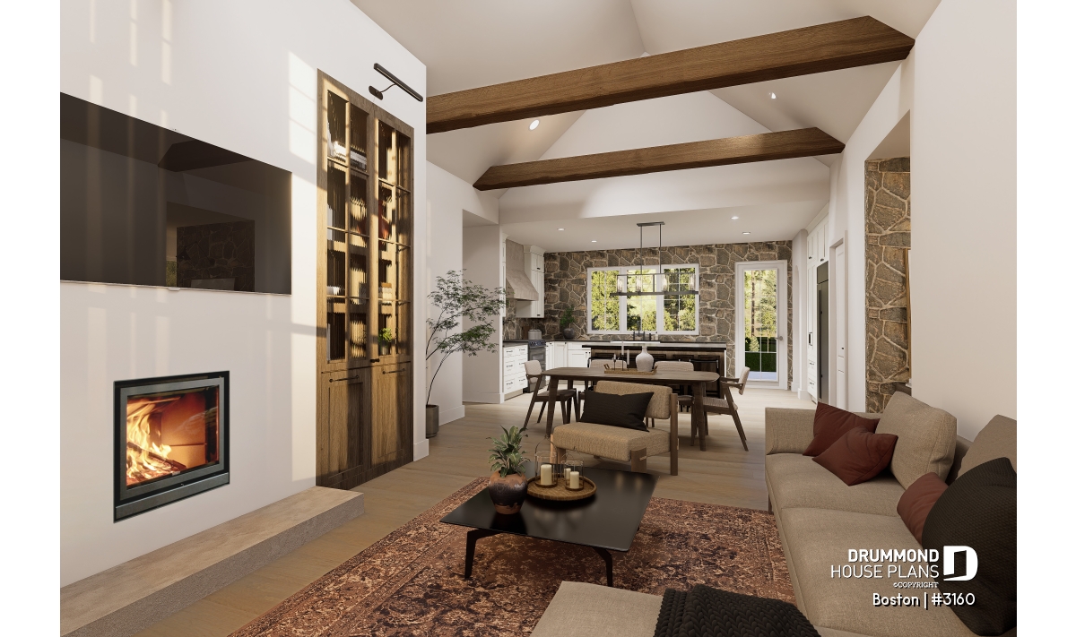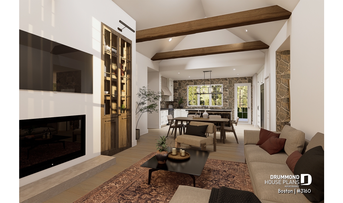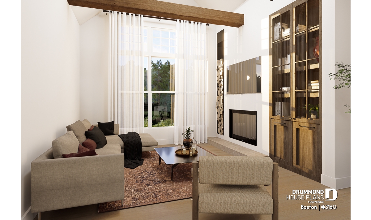 The main living area combines the living room, dining room, and kitchen in a spacious open-concept layout flooded with natural light thanks to a 16'8" cathedral ceiling. This design creates an airy, inviting atmosphere where family and friends naturally gather. At the heart of the living room, the proposed STÛV s16-Z wood-burning fireplace becomes the showpiece—bringing warmth, style, and comfort, and transforming every moment spent here into a welcoming, refined experience.